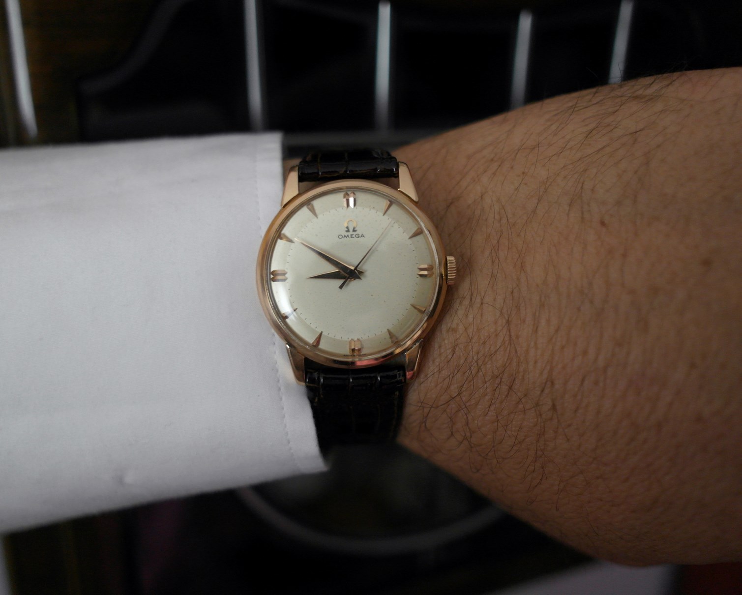The Swiss Omega signed case is made of 18 Carat / 18K solid Rose gold, measuring 34.5 mm without the winding crown, has few marks and barely perceptible dents in the back.