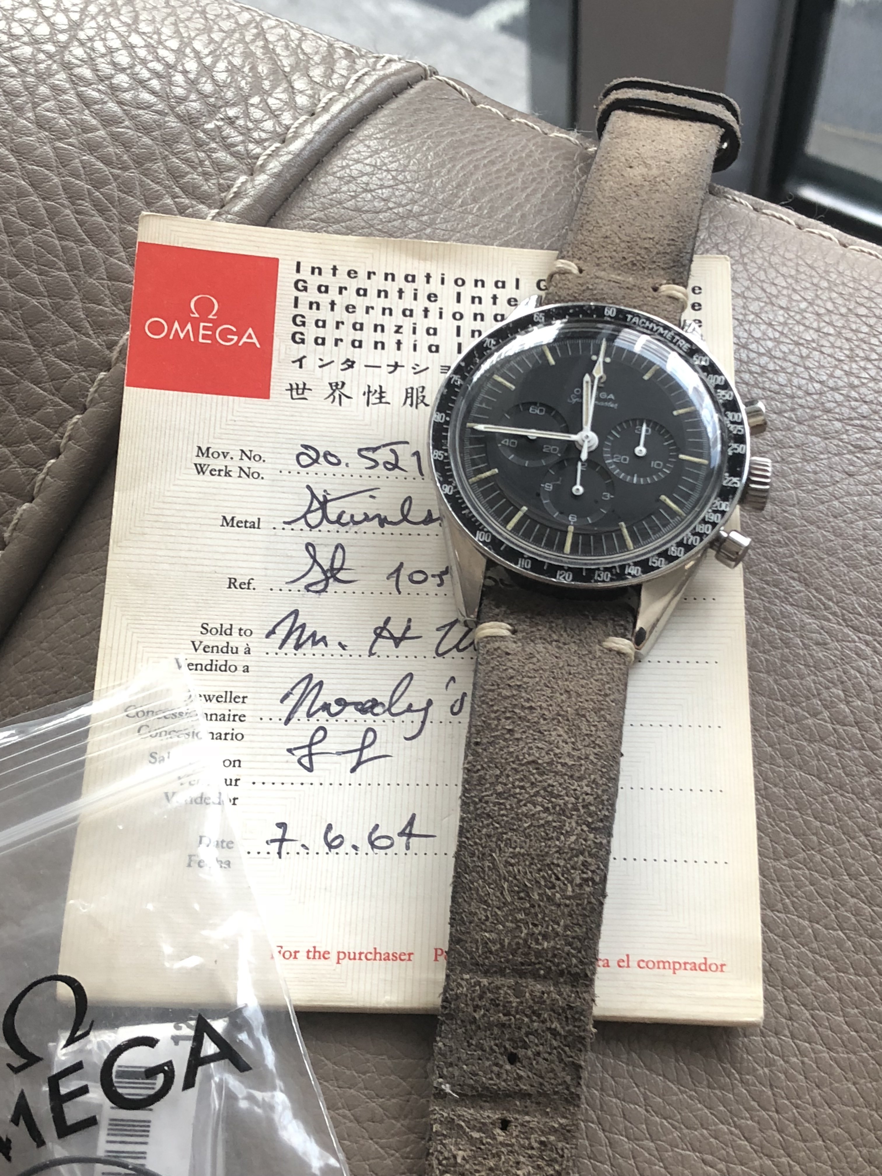 ·I’ll play. Newly acquired 105.003-63. Came with bag of Omega service parts and the original warranty document (showing this one as being a very early example - it’s within the first 200 accepted serial numbers (20.521.1XX) for the reference according to the Moonwatch Only table).