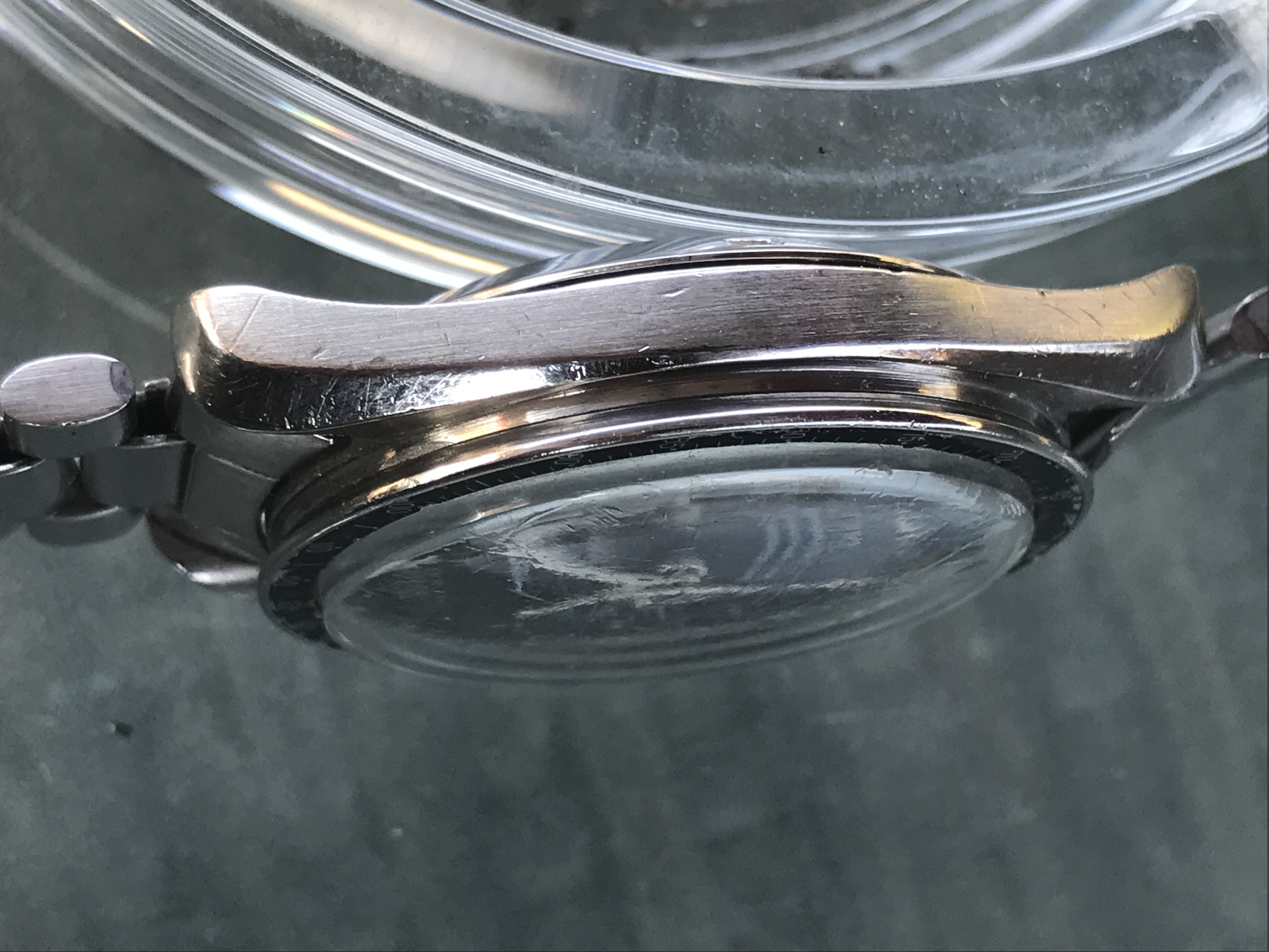 The watch shows signs of age, but no deep scatches, no overpolishing .. just in need of a thorough cleaning (and ofcourse a complete service), and probably a crystal replacement or polywatched.
