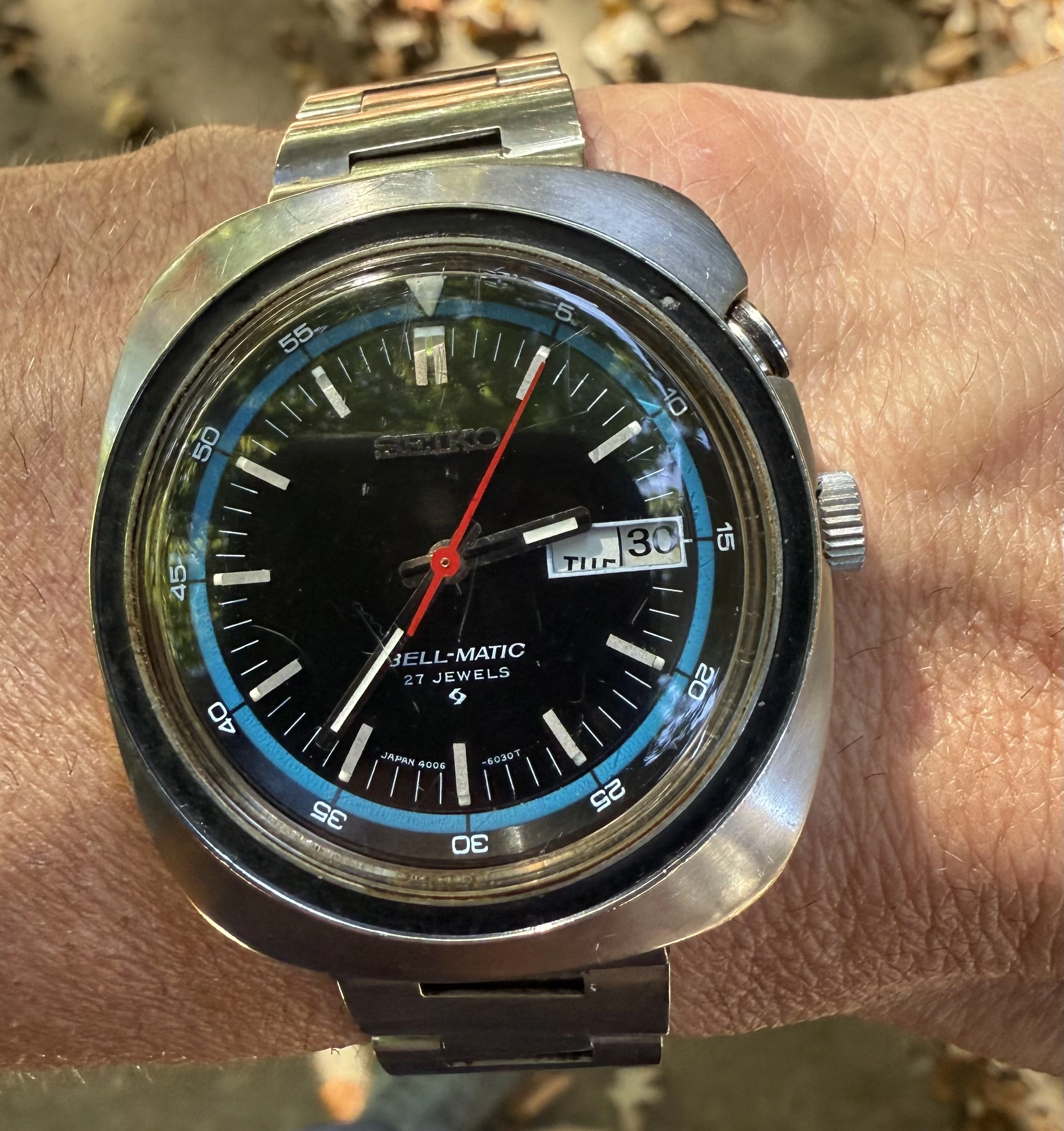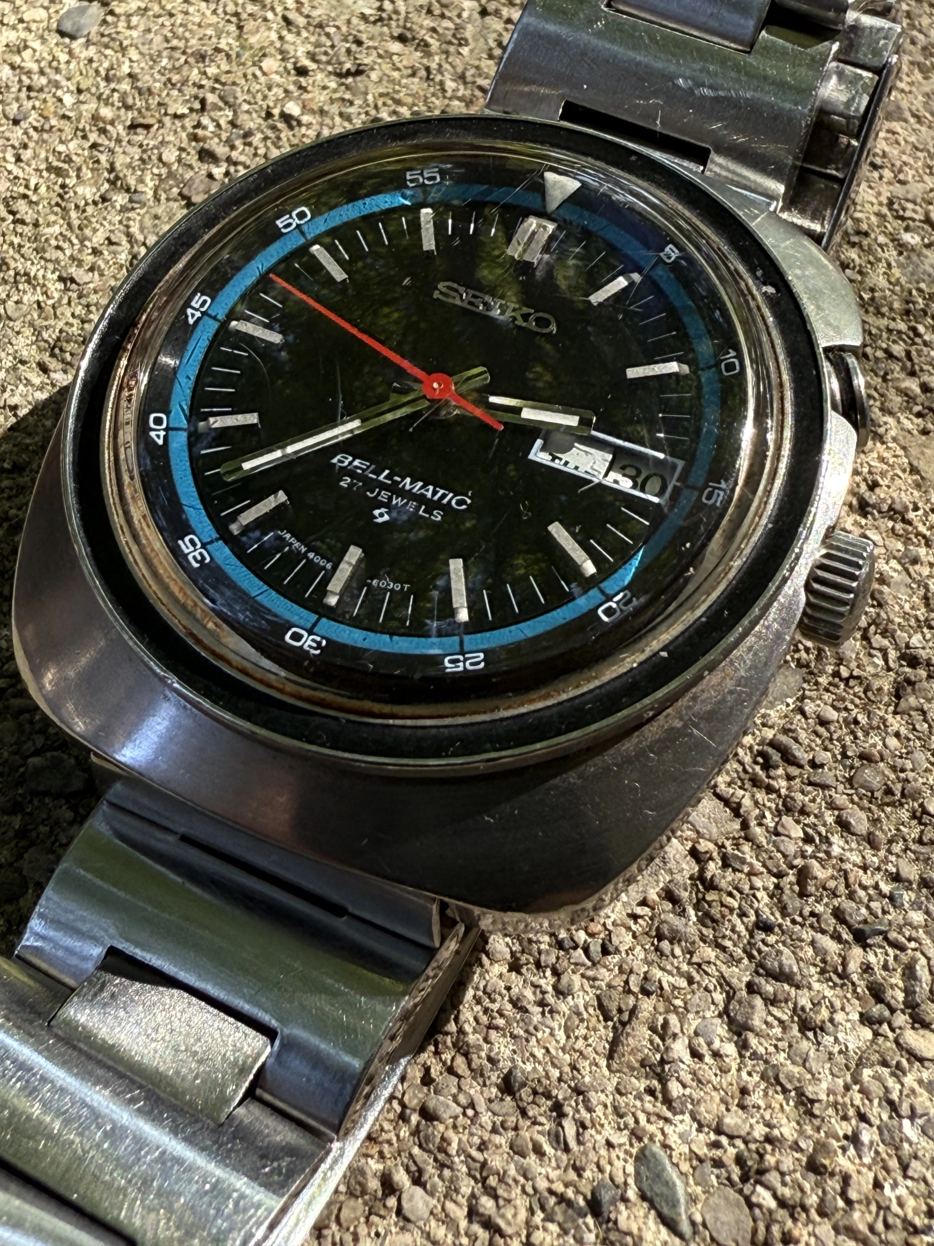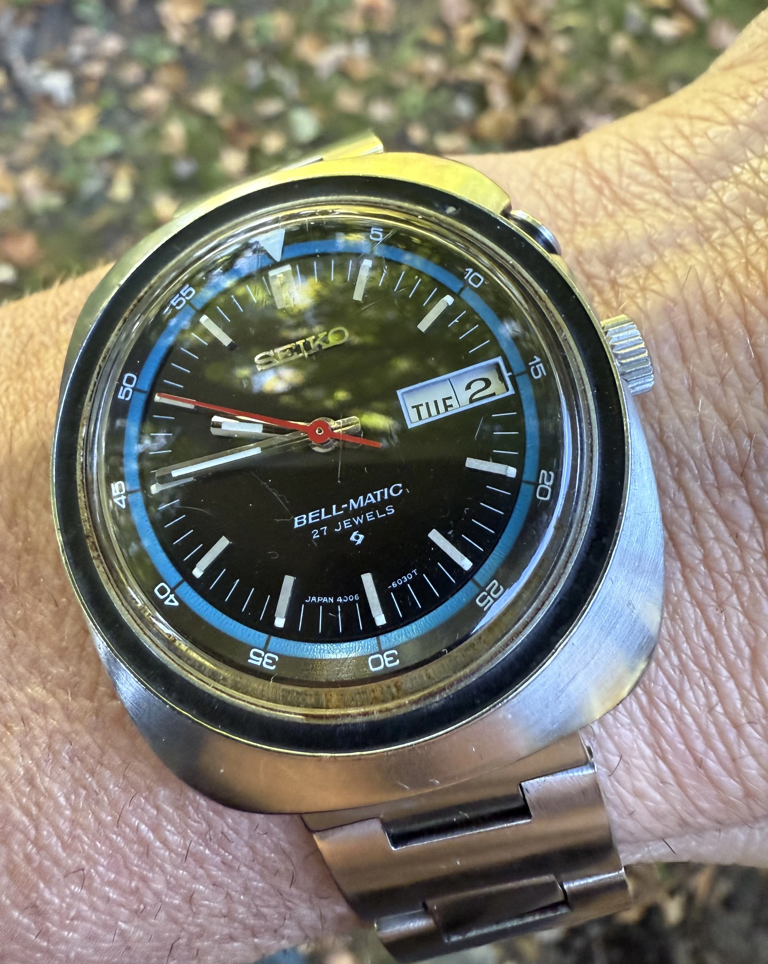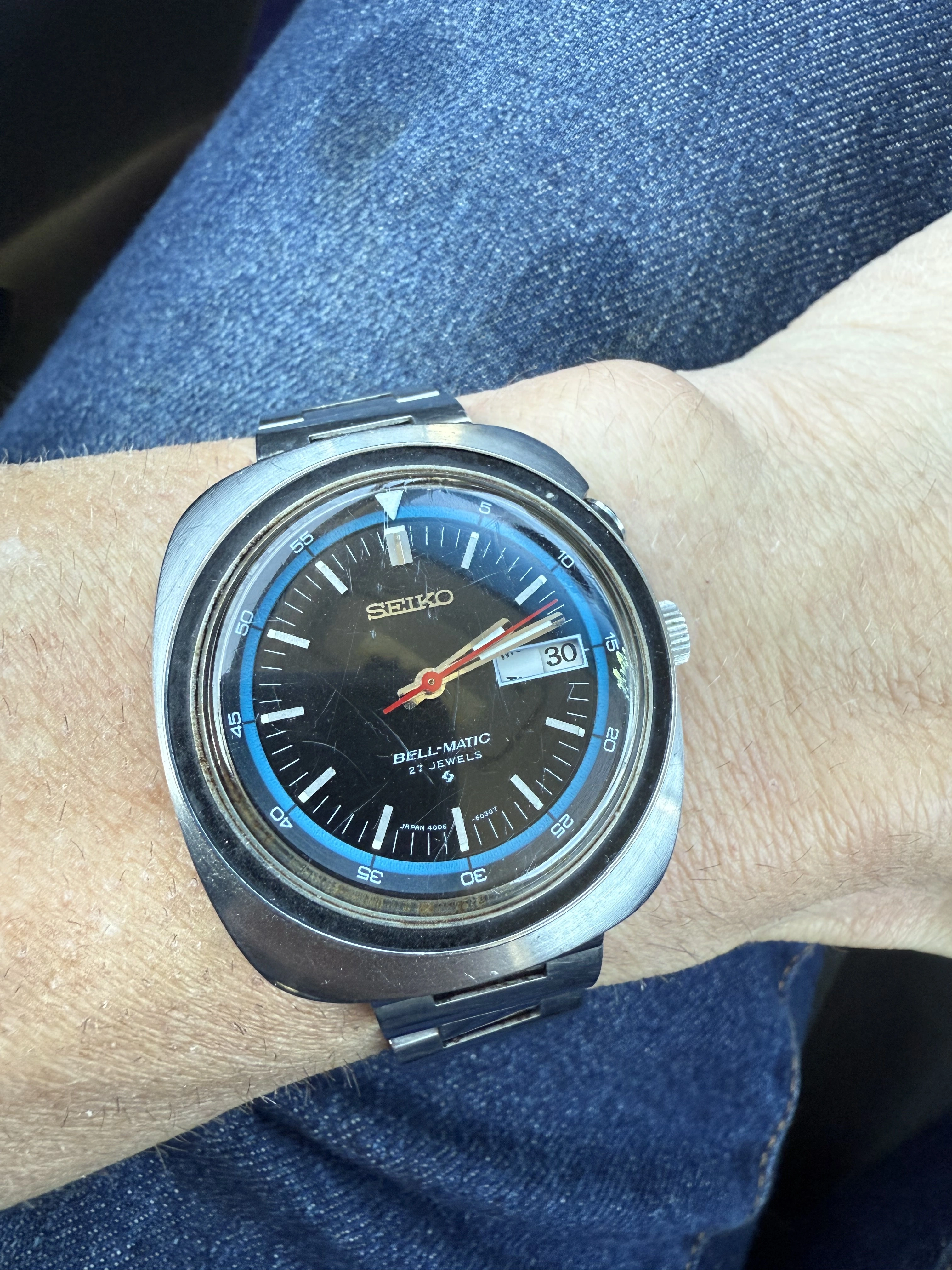 The watch: Seiko Bellmatic with a nice blue accent. Never really paid attention to these so I had no idea of the complications (an extra button?)