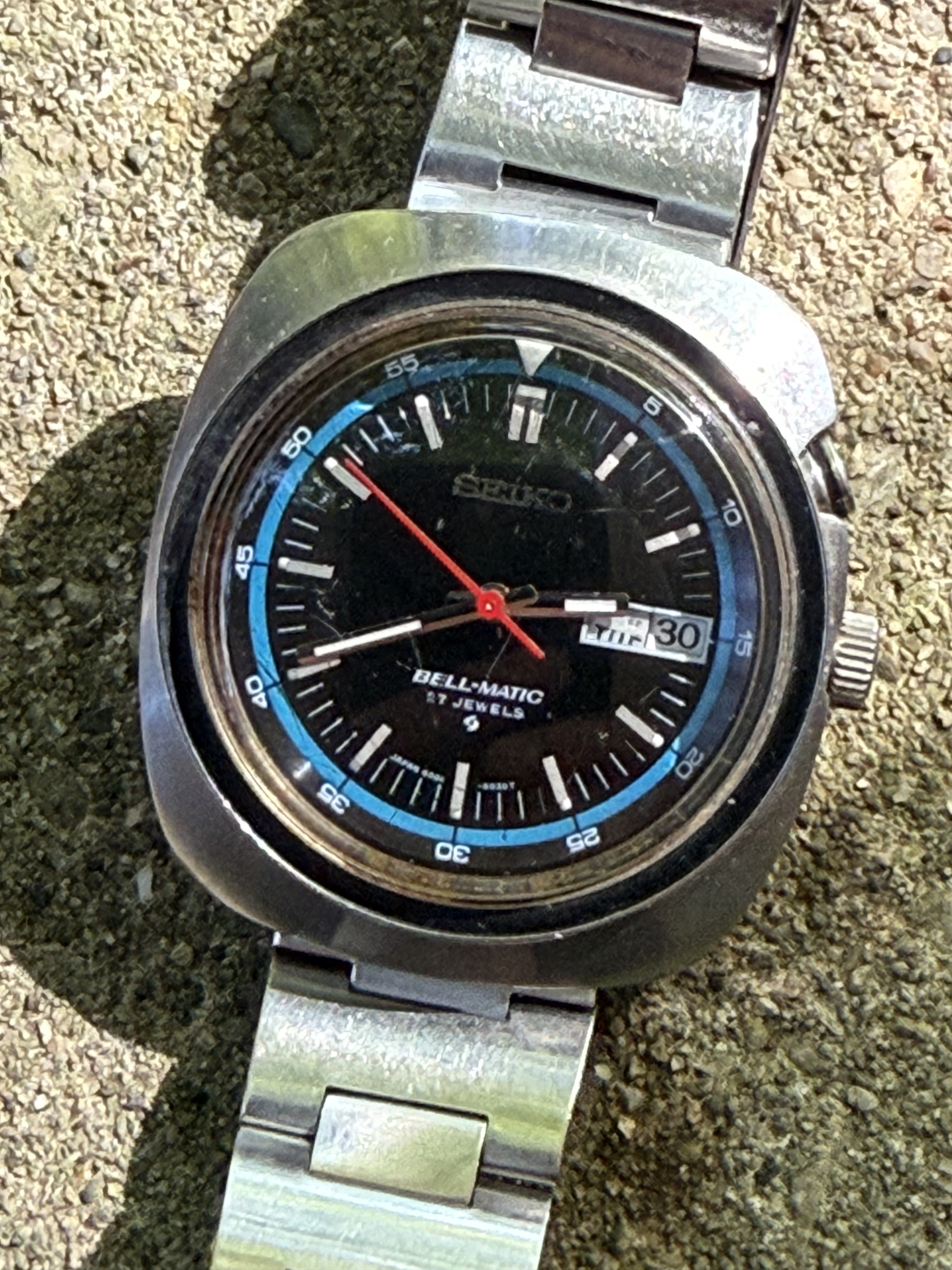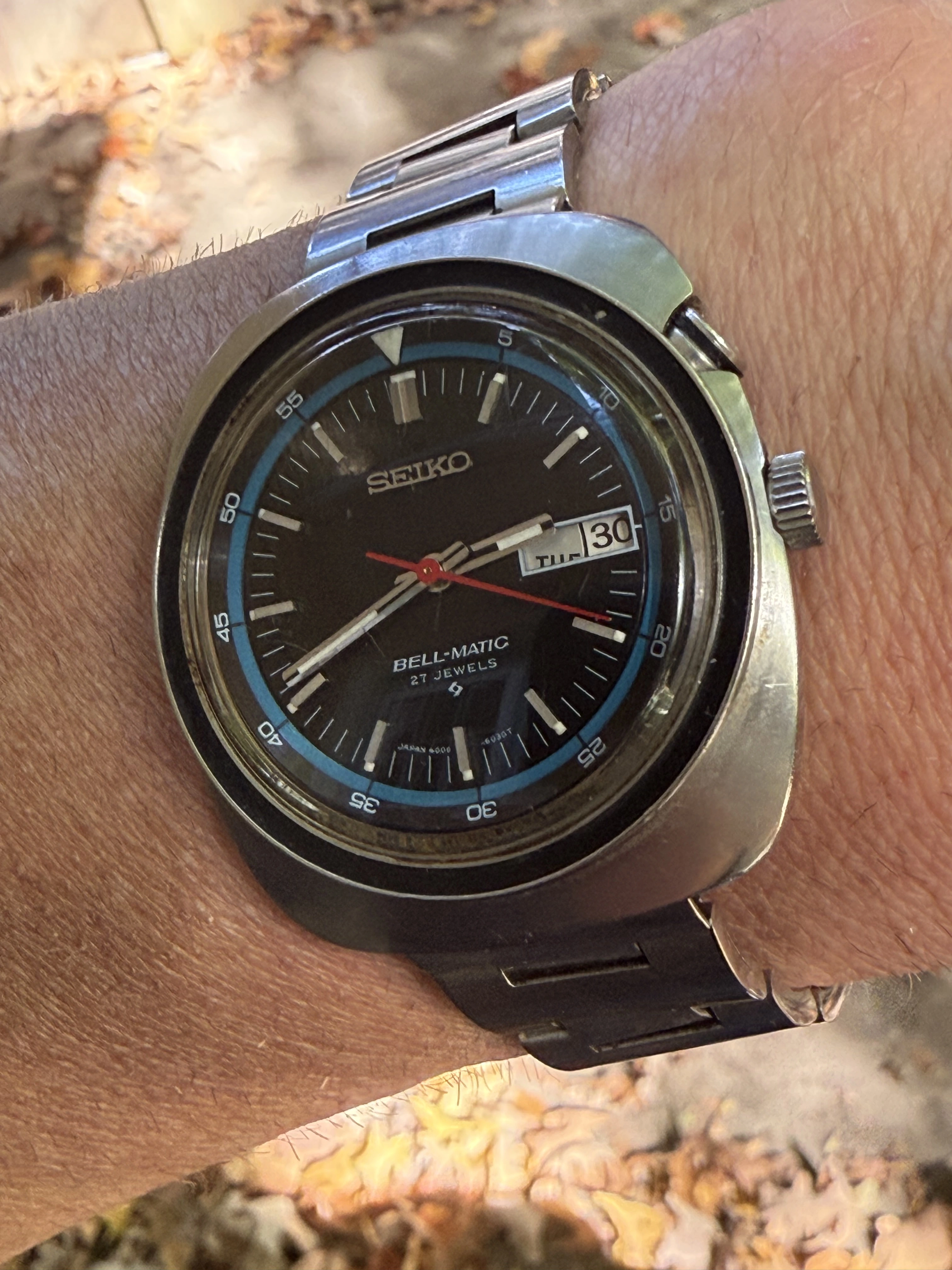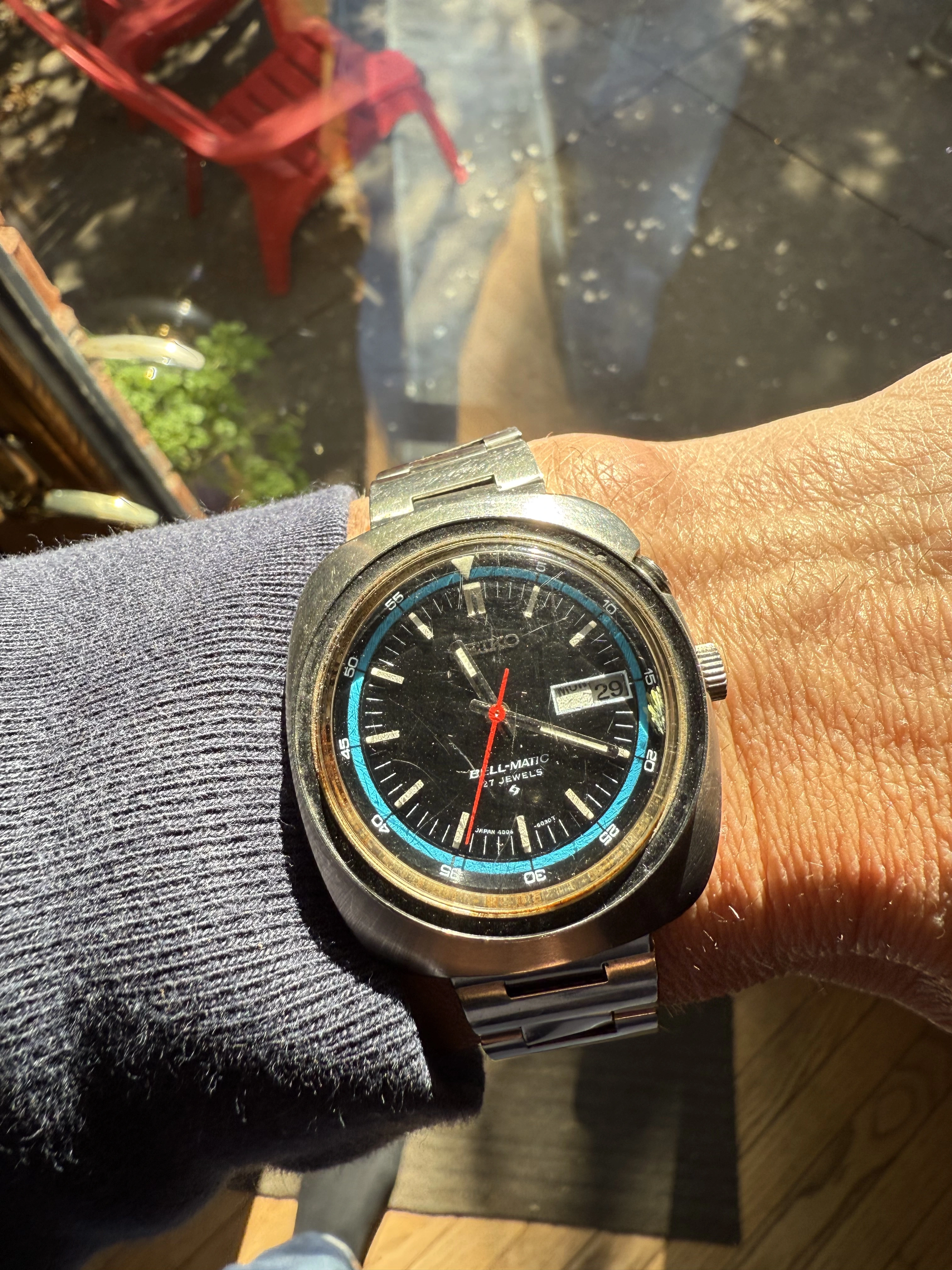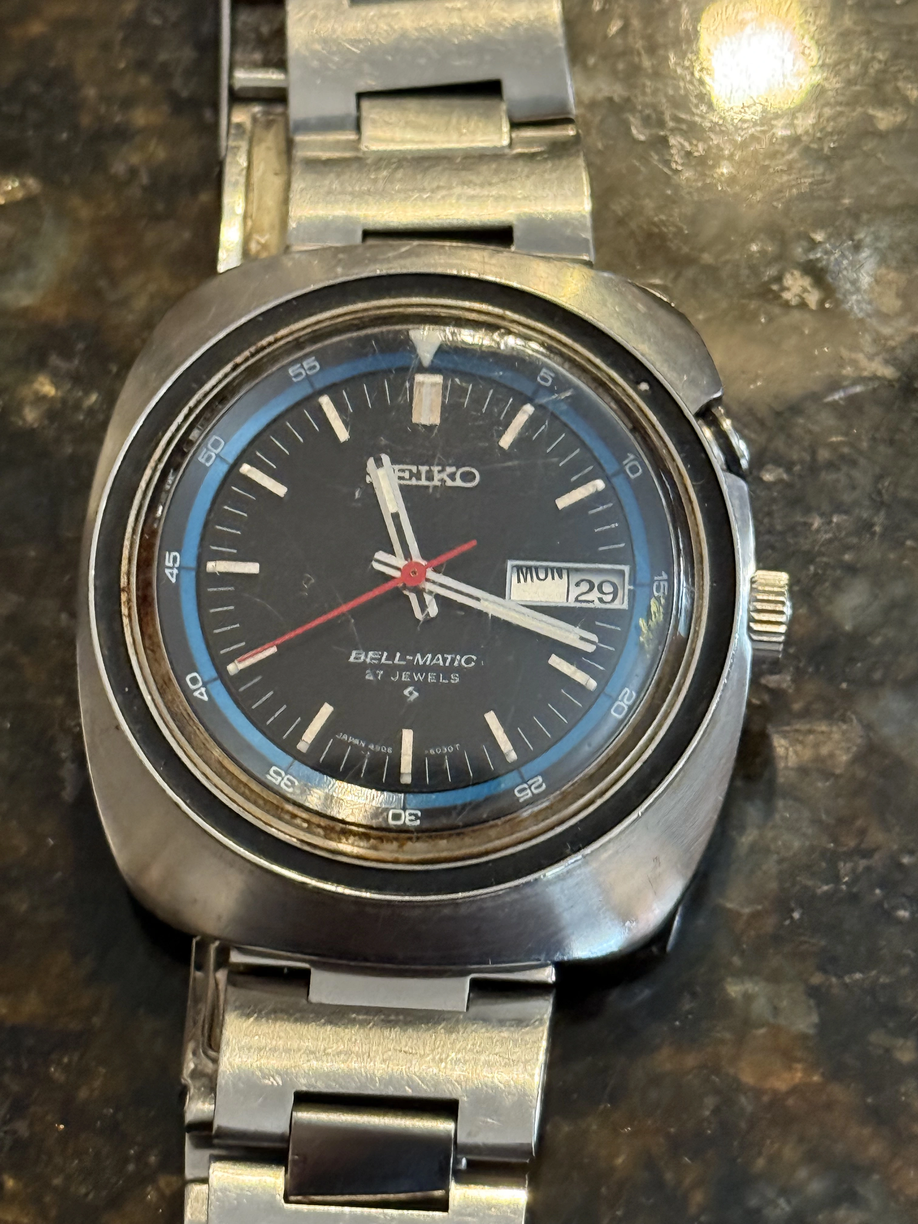 The watch: Seiko Bellmatic with a nice blue accent. Never really paid attention to these so I had no idea of the complications (an extra button?)