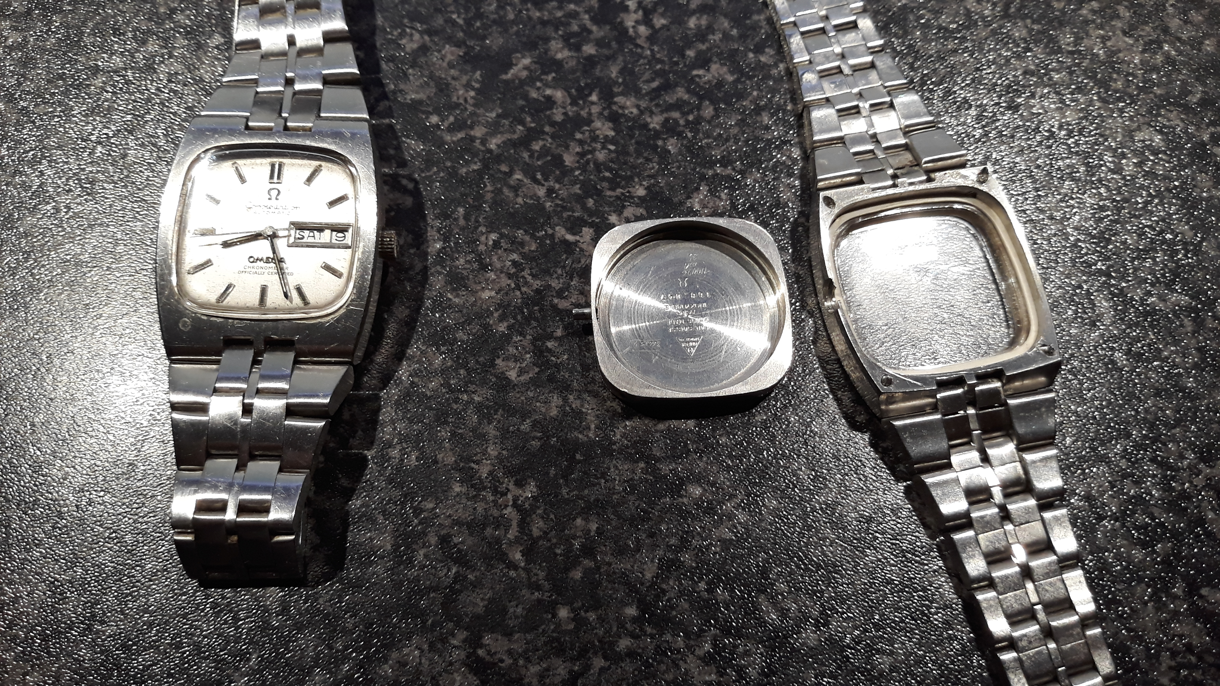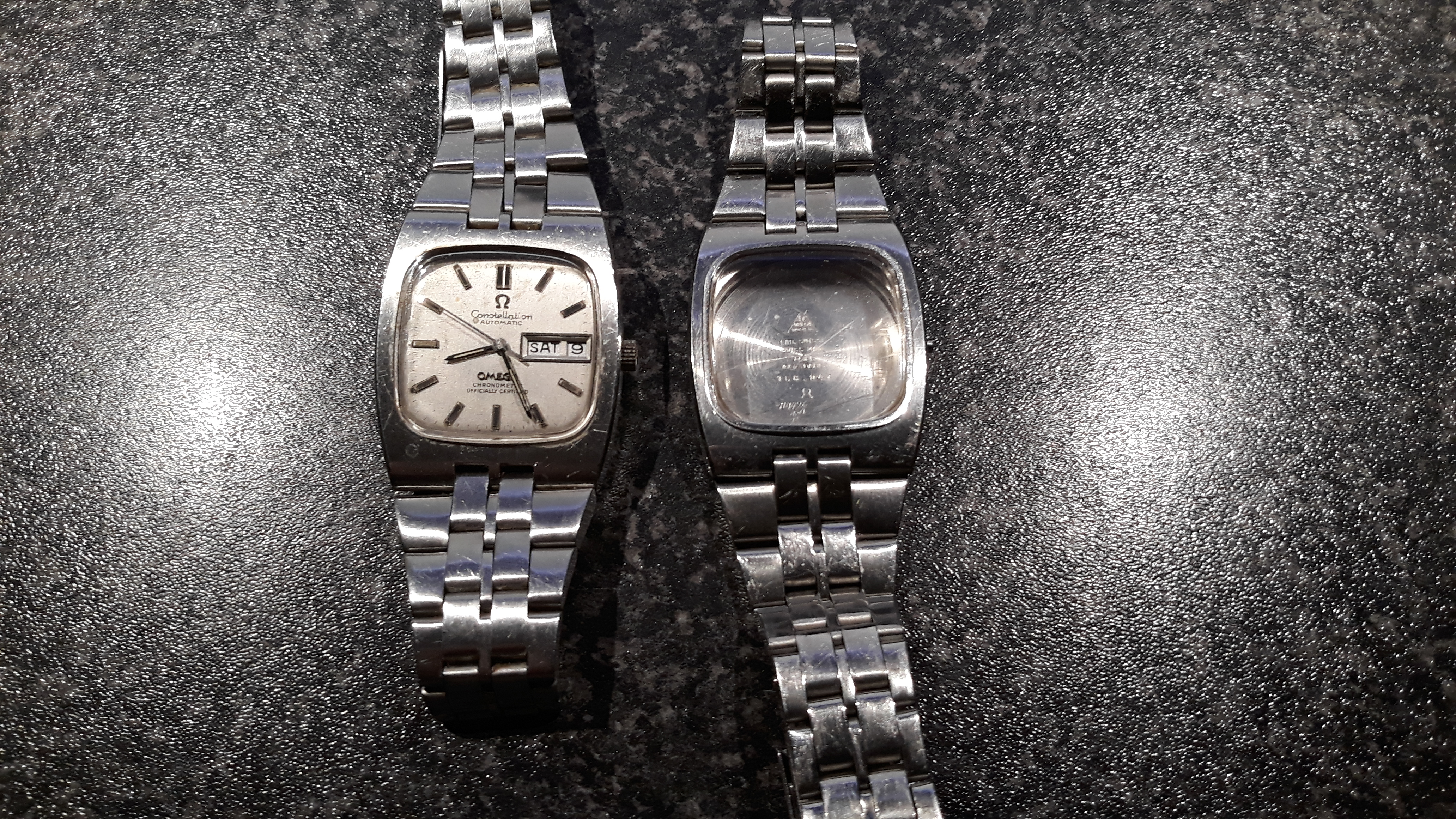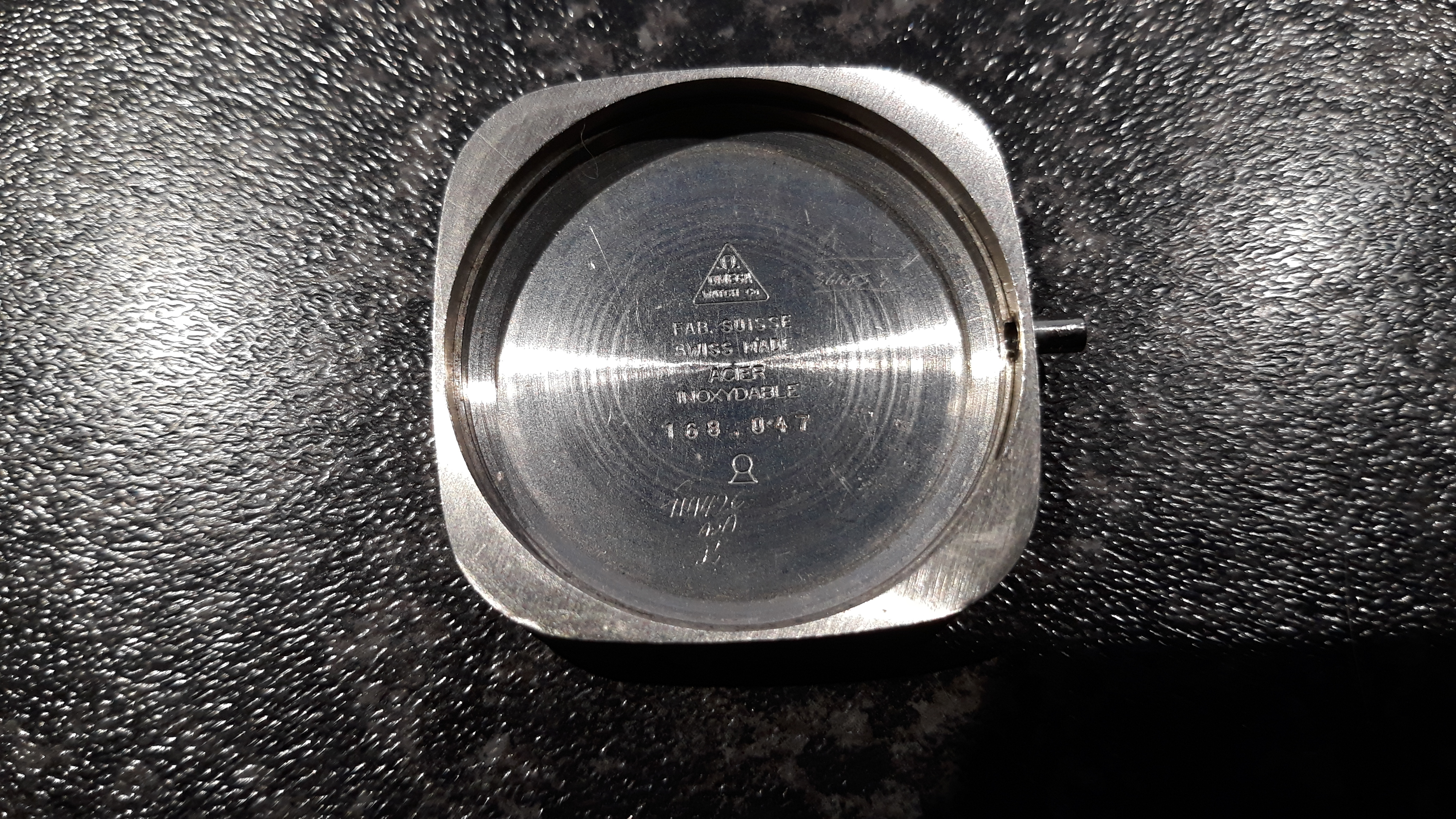 The case is stamped as genuine, it comes with a detachable backplate marked Constellation held by 4x angled screws and looks real with the Omega Triangle, stamped FAB SUISSE SWISS MADE ACIER INOXYDABLE (sic) 168.047