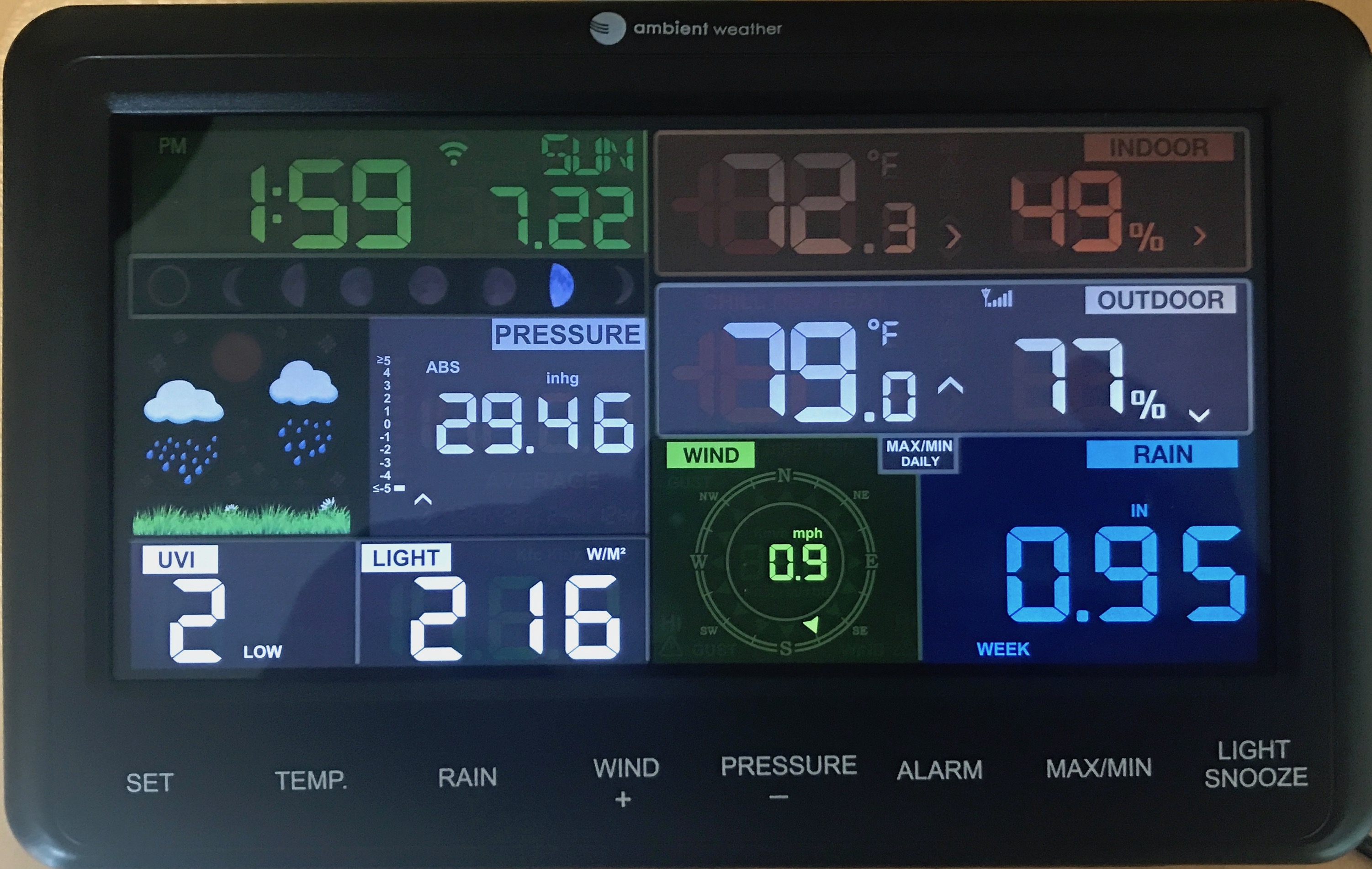 Personal Weather Station. The Ambient Weather WS-2902A. Setup was simple, configuring it to connect to the internet was a little more involved. Partly because I had it too close to the grill on the deck, partly because their software is shite. It comes with the monitoring unit itself plus a color tablet for viewing conditions. Once you've connected to the internet, however, there are apps like Weather Underground that will let you monitor your extremely localized (backyard) weather. And if you make the dashboard public, your PWS joints the grid of home meteorologists' weather stations and can be viewed by anyone.