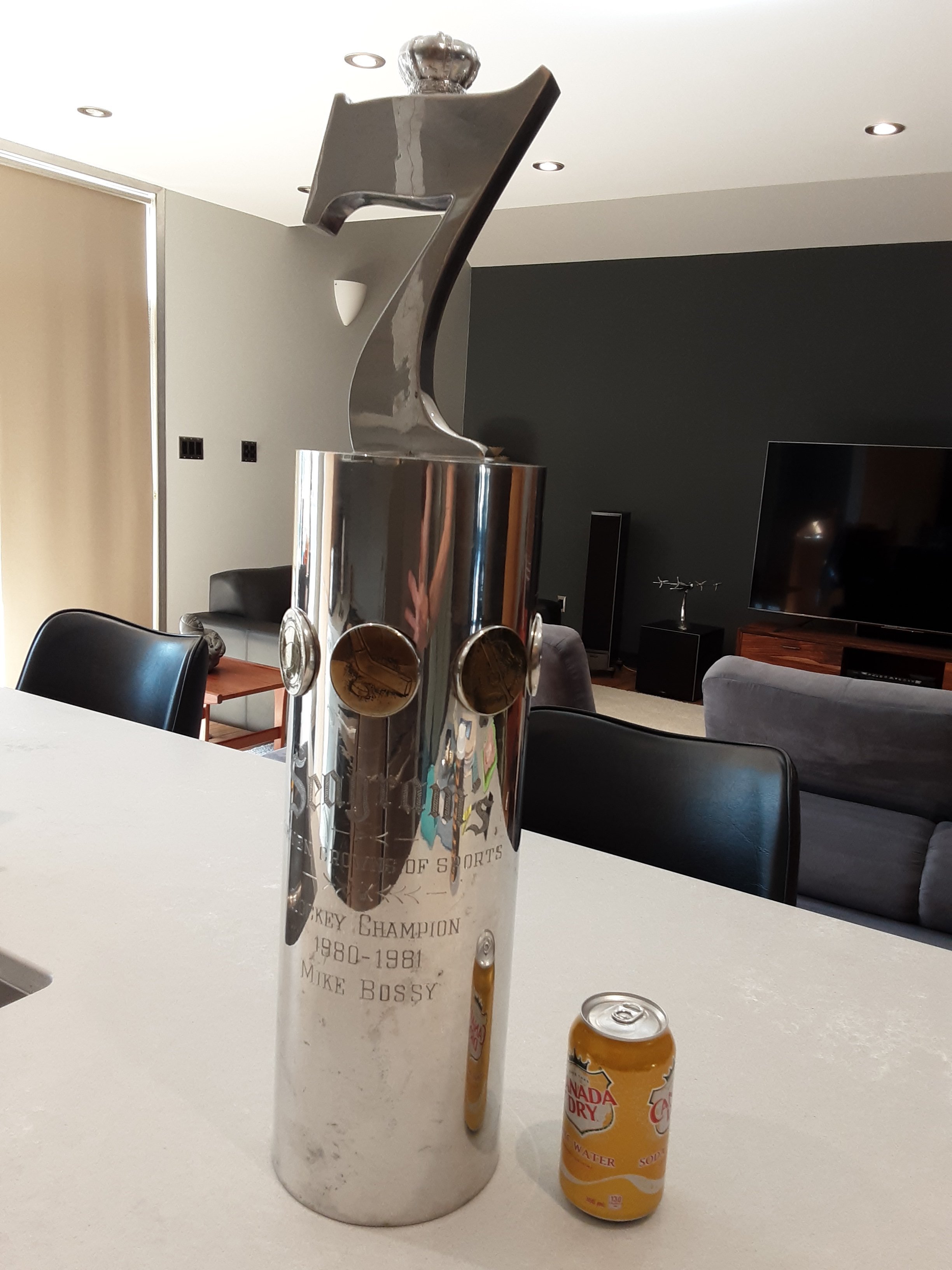 Thought this might be of interest to NHL fans of a certain era. Mike Bossy died in '22 and his daughter recently auctioned off all his memorabilia. I won this Seagram's trophy that he was awarded for the '80-'81 season (his 50 goals in 50 games season). Seagram's awarded this from the mid '70s to mid '80s in seven sports. A "computer" chose the best player in each sport; basically an early attempt at advanced analytics. I've been an Isles fan since their pre-Cup days so a cool piece to have.