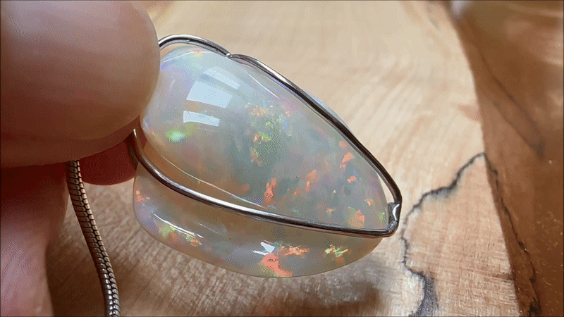 It's a just under 19 carat shell that has been replaced with opal over time, so it's a shape that I don't have any examples of. I had this mounted in a very minimal fashion using platinum wire, and since it's very difficult to photograph, I took some video and made a gif...