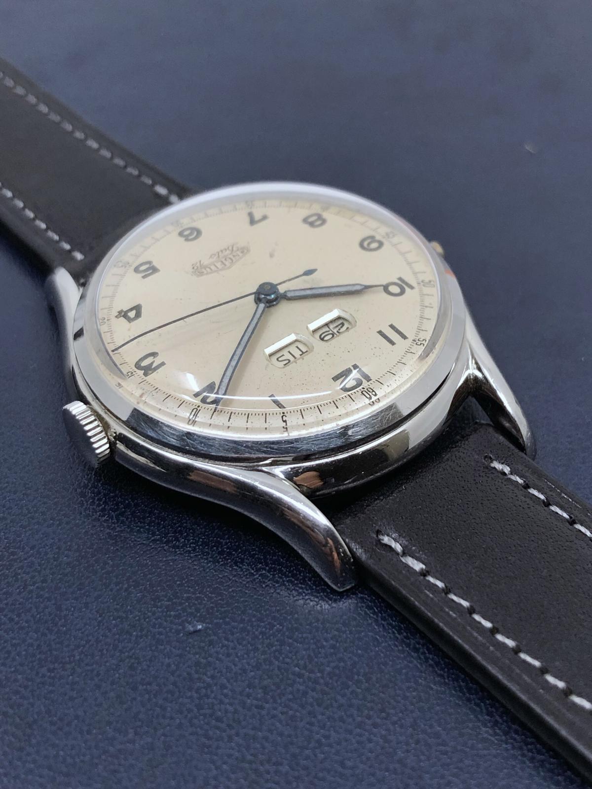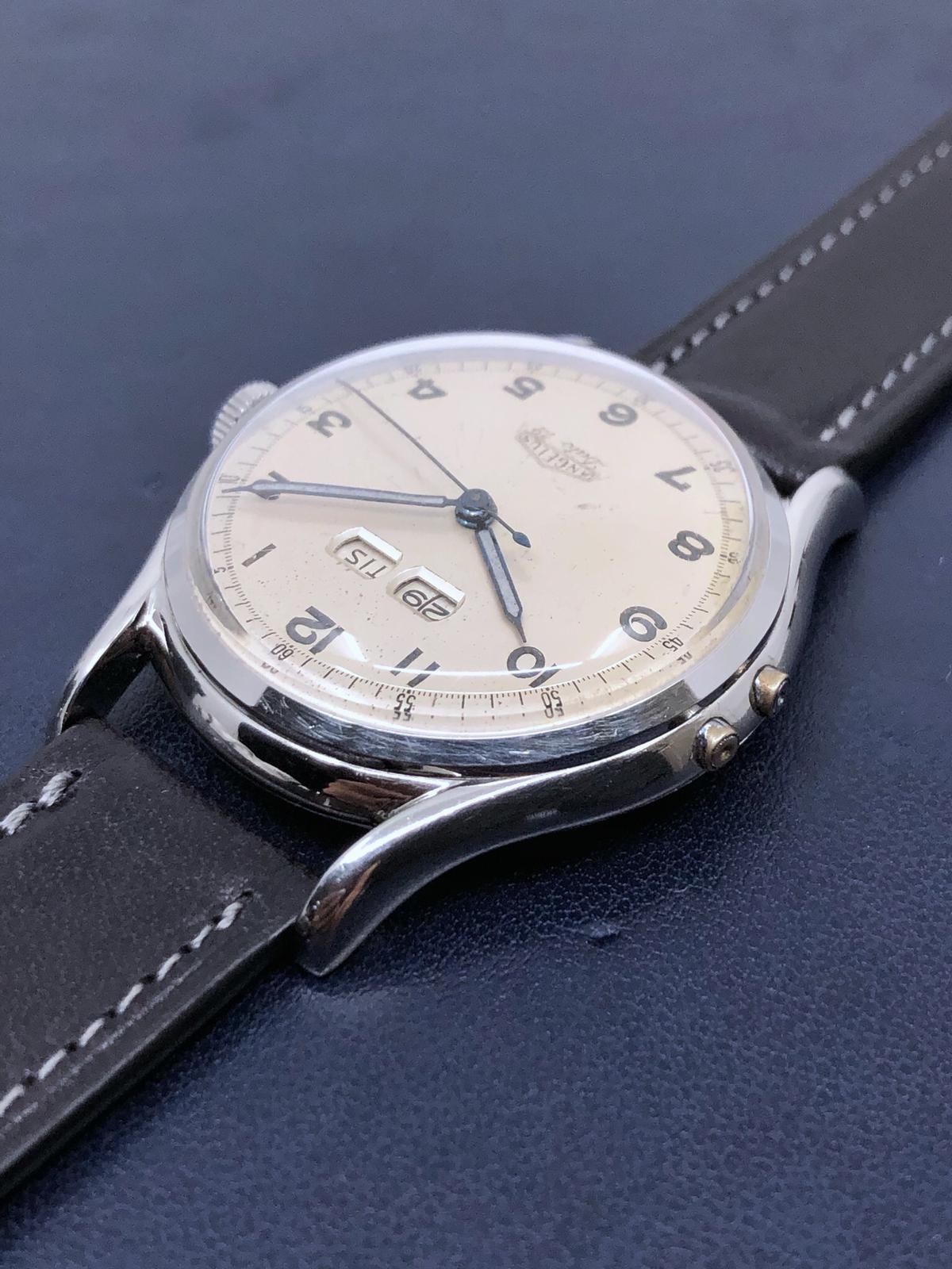 I have on offer a Angelus Dato 12 with the caliber 255. These are pretty rare in steel. The day wheel is in Swedish and I got this watch from someone in Sweden. Watch is running fine and the pushers are working. Something to note is that the hands were relumed.