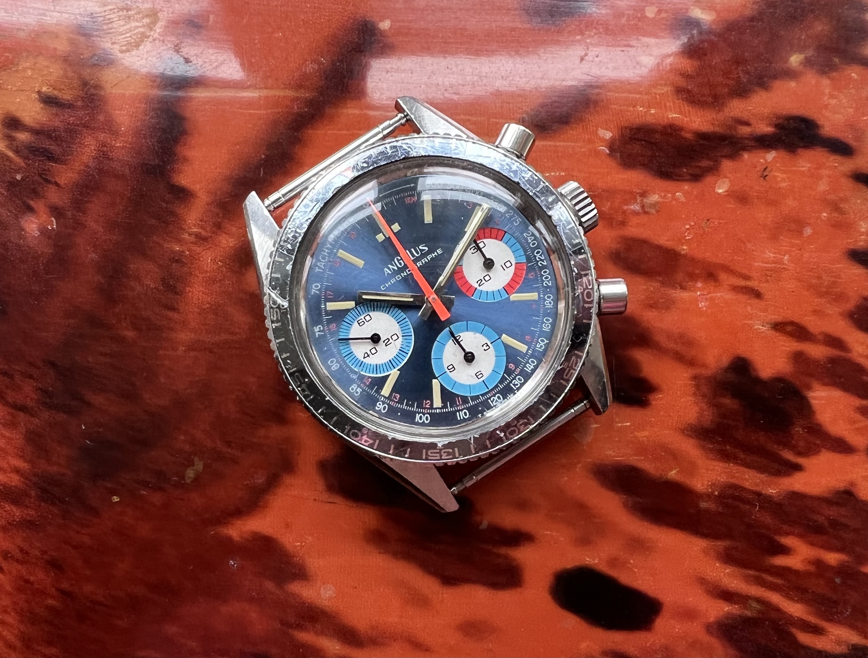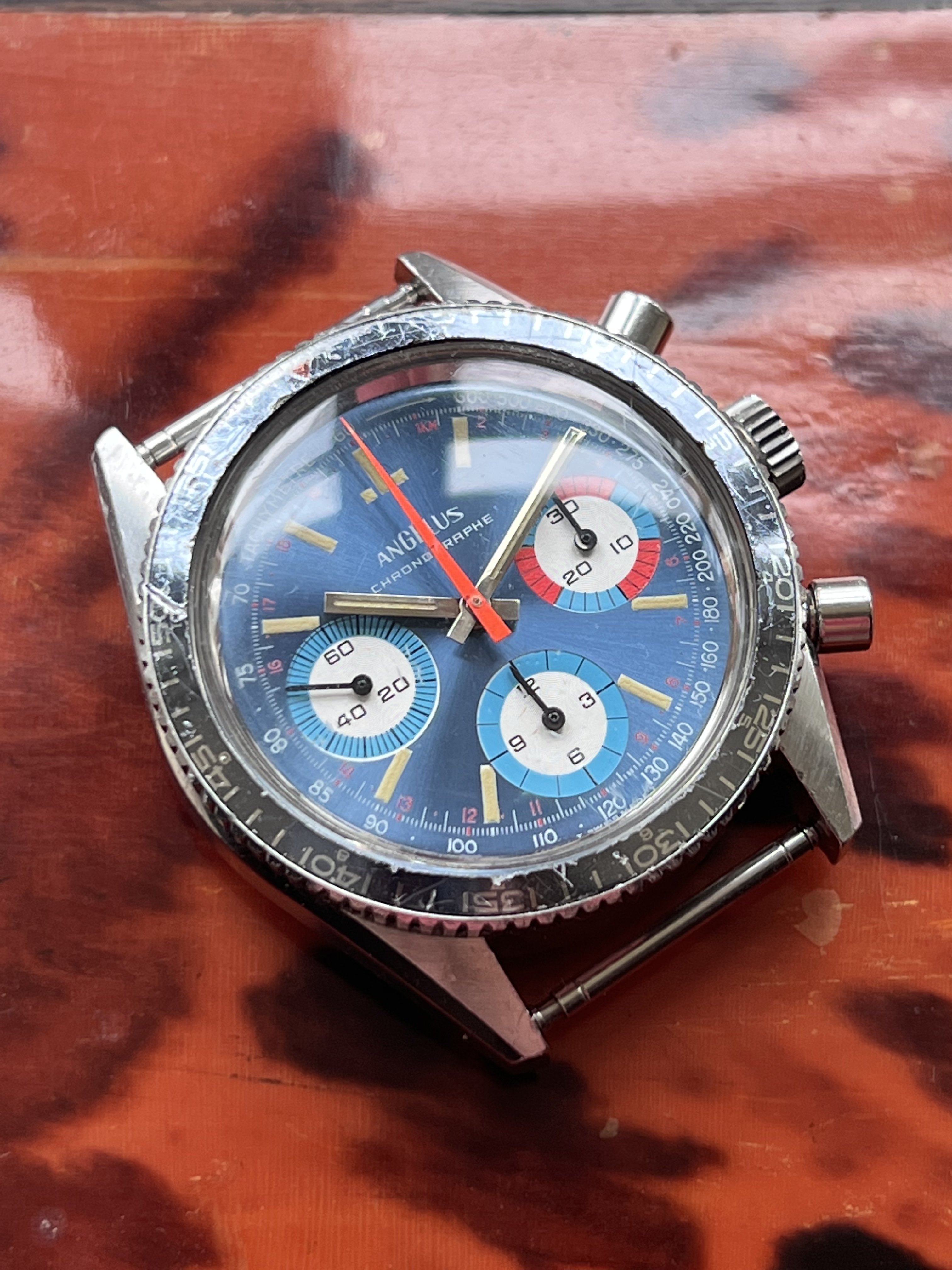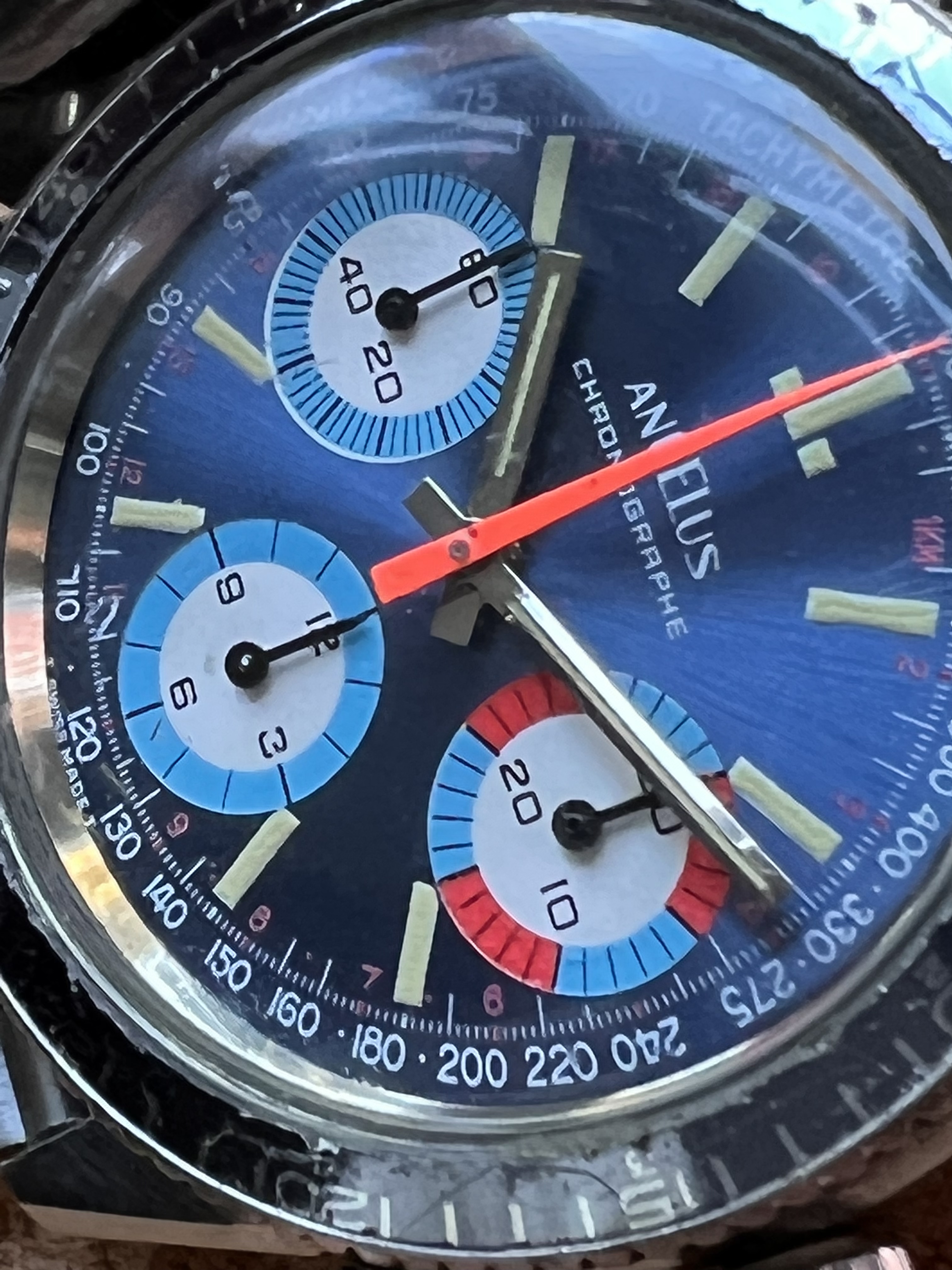 Dial: Angelus branded vivid blue sunburst with blue and blue and red sub dials, custard patina lume plots. Dial is excellent and original. Hands are original and in excellent condition.