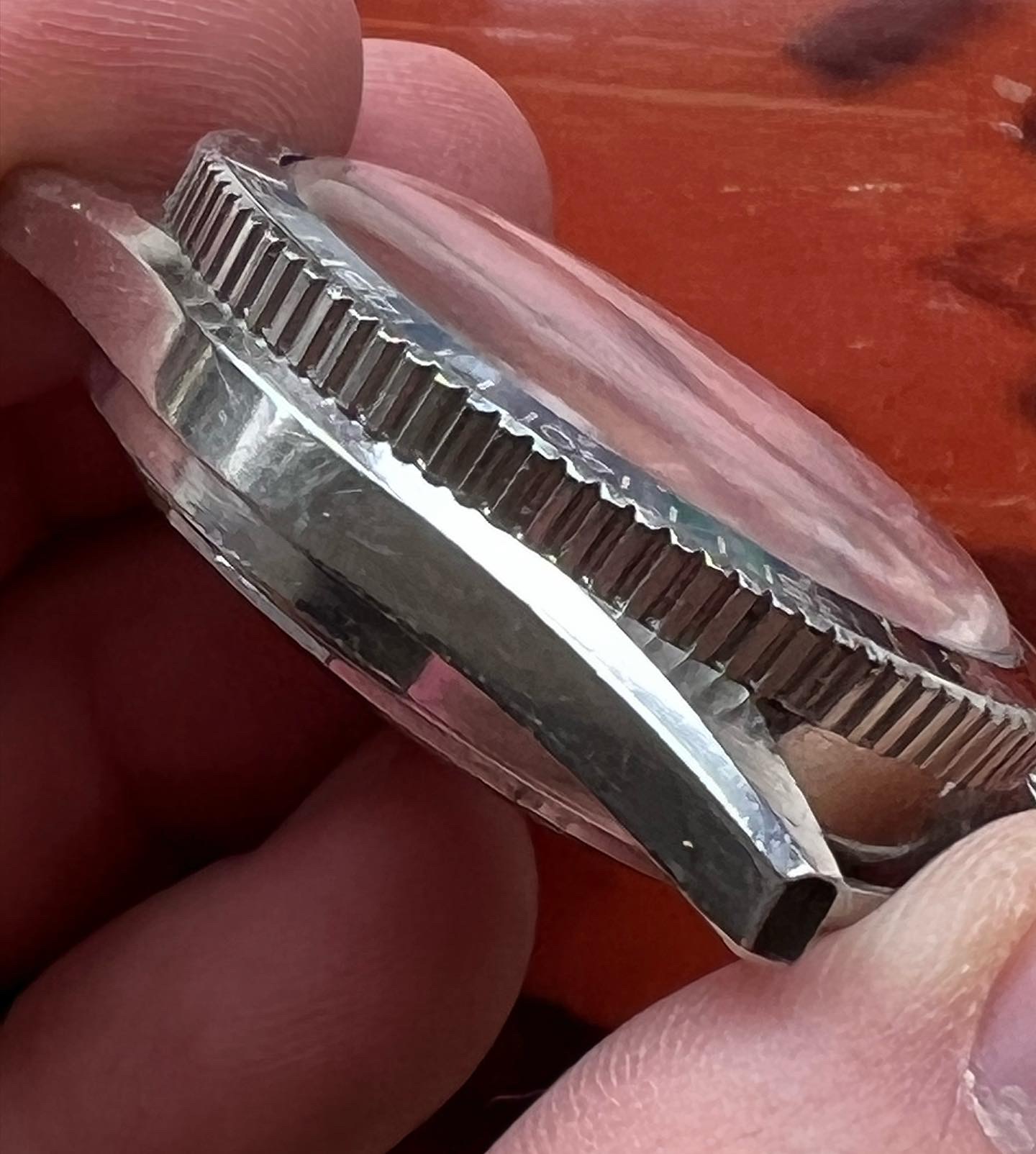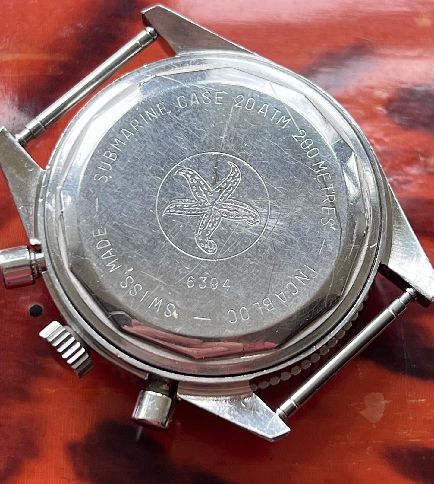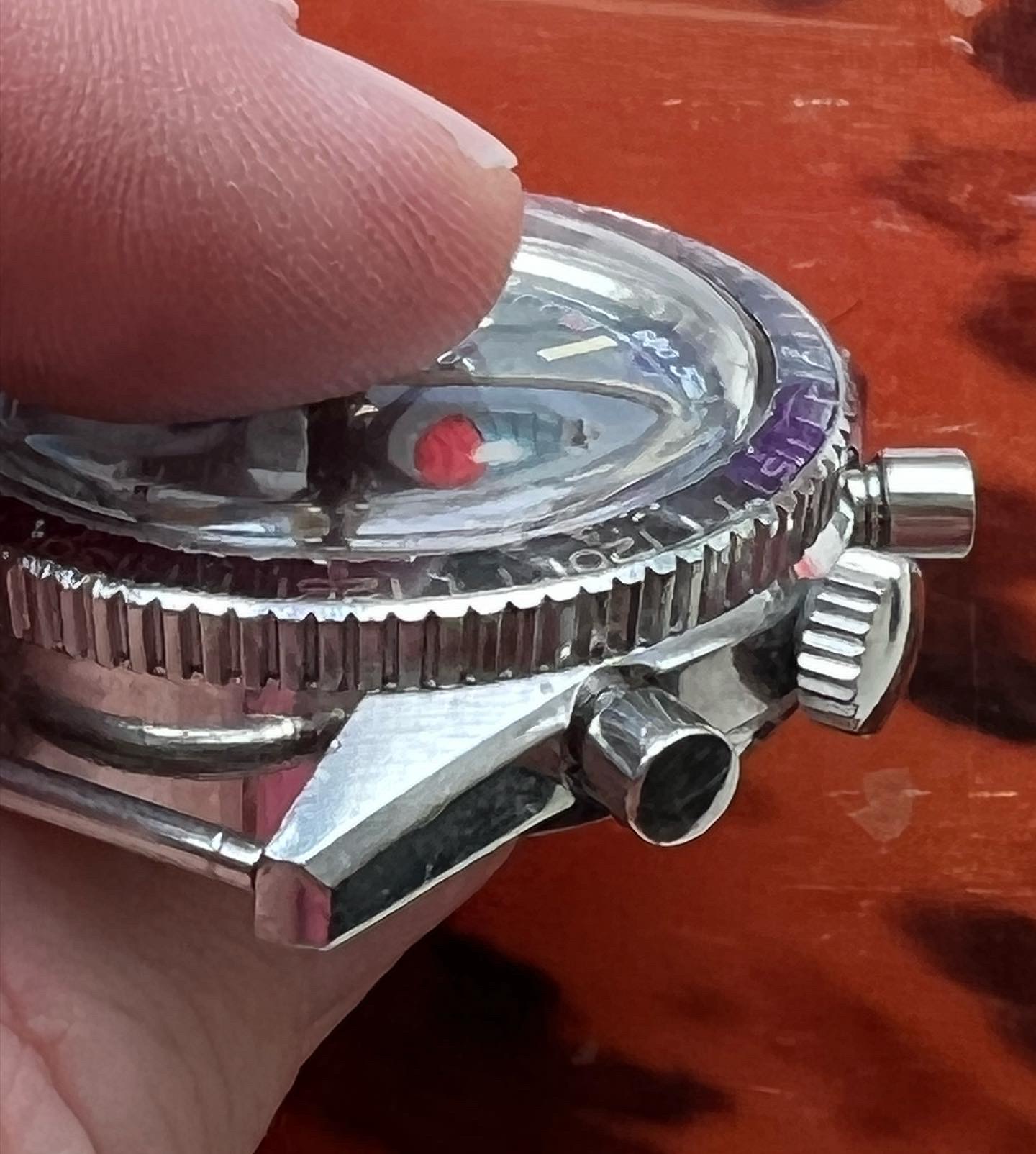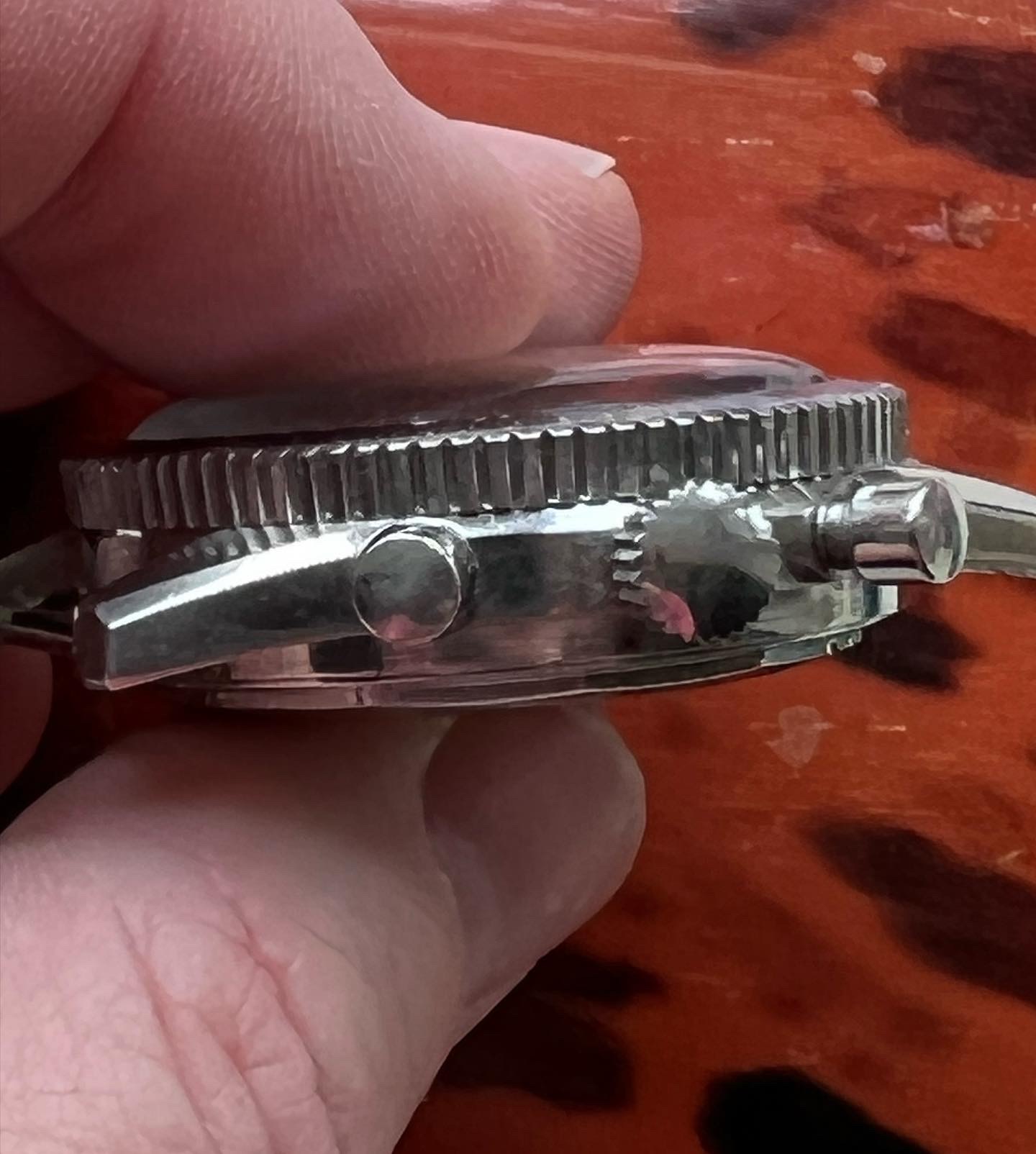 Case: 38mm Submarine screw back stainless case in unpolished condition, sharp case lines. Bezel is original and has a silver ghost tint to it.