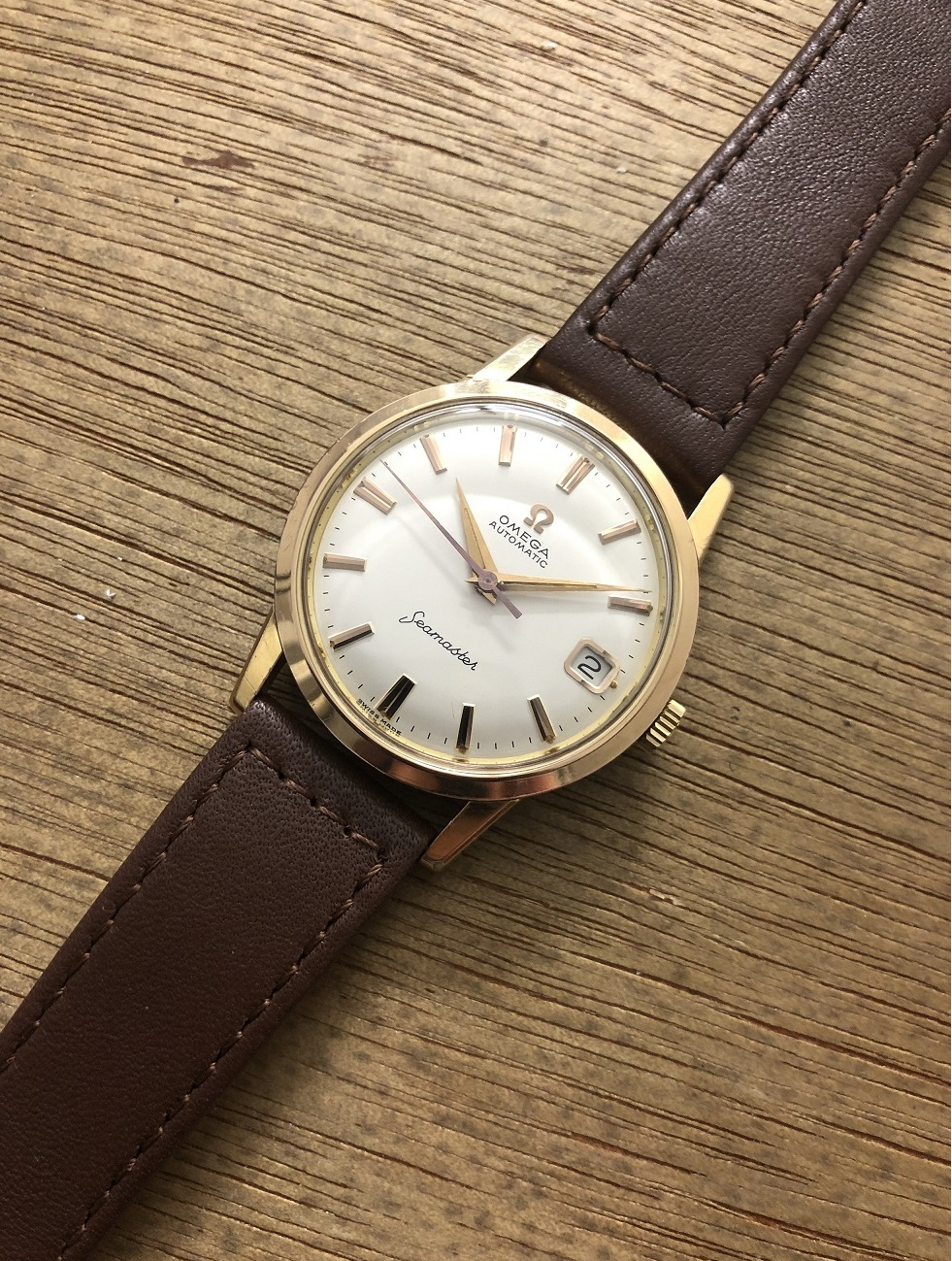 Here is a stunning vintage Omega Seamaster Automatic watch. Professionally serviced Omega caliber 562 automatic movement running strong and accurate. Original signed crown. The factory original dial is in very good condition. Minor visible mark around the 5 o'clock index. Original set of dauphine hands. The original gold plated over solid stainless steel case is in very good original unpolished condition. Case model is 14760-SC 62 and measures 34mm across excluding the crown by 41mm lug tip to lug tip. The watch will come complete with a brand new 18mm high quality genuine leather strap.