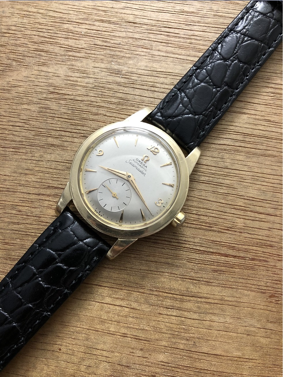Up for sale is a stunning Omega Seamaster automatic watch. It is very difficult to locate a gold filled beefy lugs Omega in fine condition. The factory original finish dial is attractive and is in very good condition. Breguet numeral dial is always collectible. The case is made of 14k gold filled. The case is left in its original unpolished condition. Original signed clover crown show sign of missing cap. Brand new crystal. A new case back gasket. 18mm croco grain genuine leather strap is brand new. The case measures 34.5mm across excluding crown by 42.8mm lug tip to lug tip. The 17 jewels automatic movement has been serviced and regulated. It is an Omega caliber 344 with serial number 14116571 dating this watch to 1954. Case model F6249.