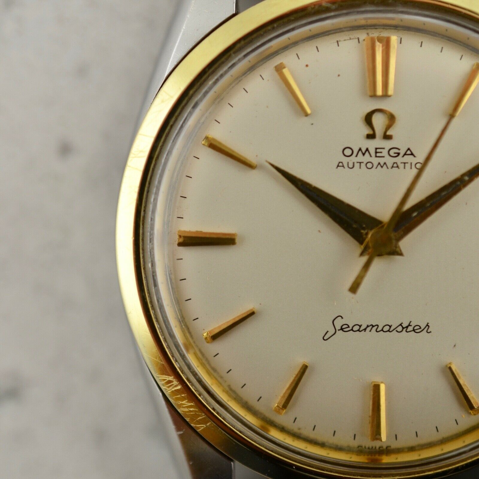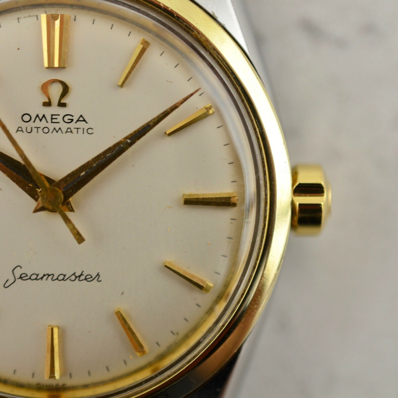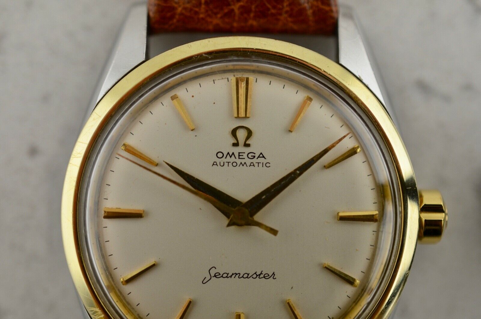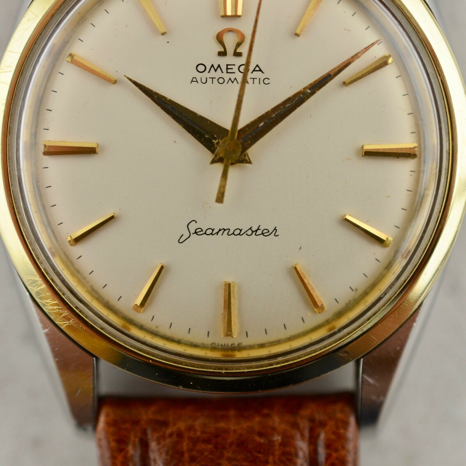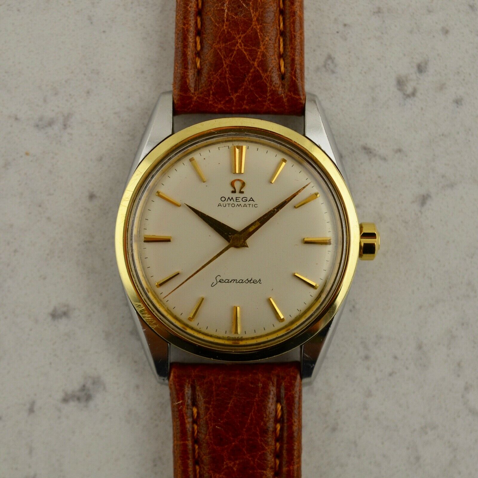 Stainless steel, screw-in case, 14k yellow gold bezel, 34mm diameter, "Seamaster" Hippocampus medallion, downturned lugs. Case maintains the original factory finish. Original matte white dial with applied gold arrow indexes and luminous plots, in excellent condition. Applied gold "Ω" logo with printed "Omega Automatic" below 12 o'clock and "Seamaster" print above 6 o'clock. Original gold toned dauphine hands. Original Ω signed naiad crown. Original Hesalite crystal. Omega Caliber Ω 570 automatic winding movement, unserviced and in running order. Brand new leather band with chrome buckle.