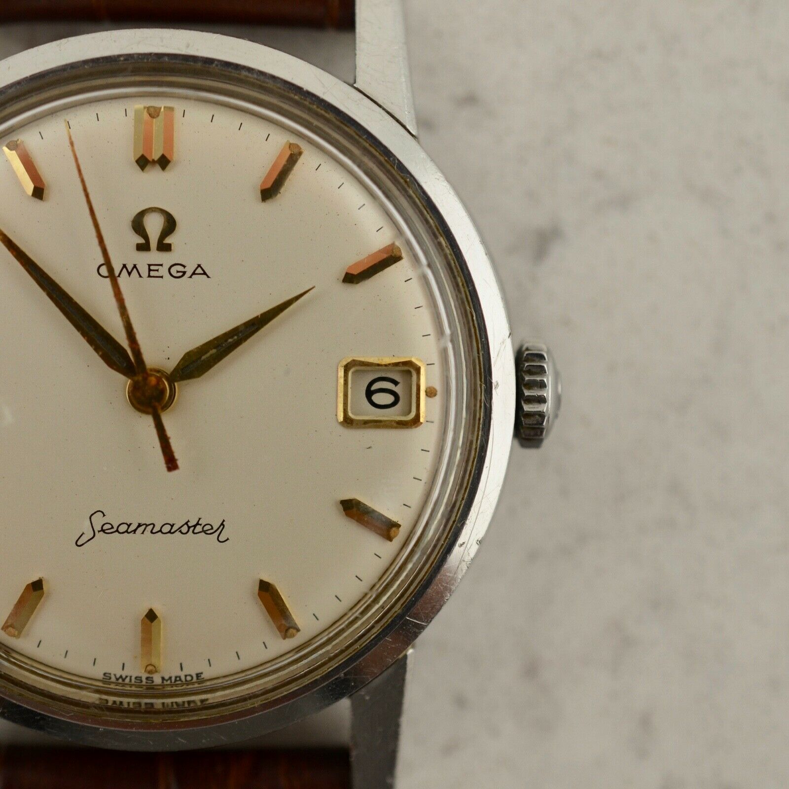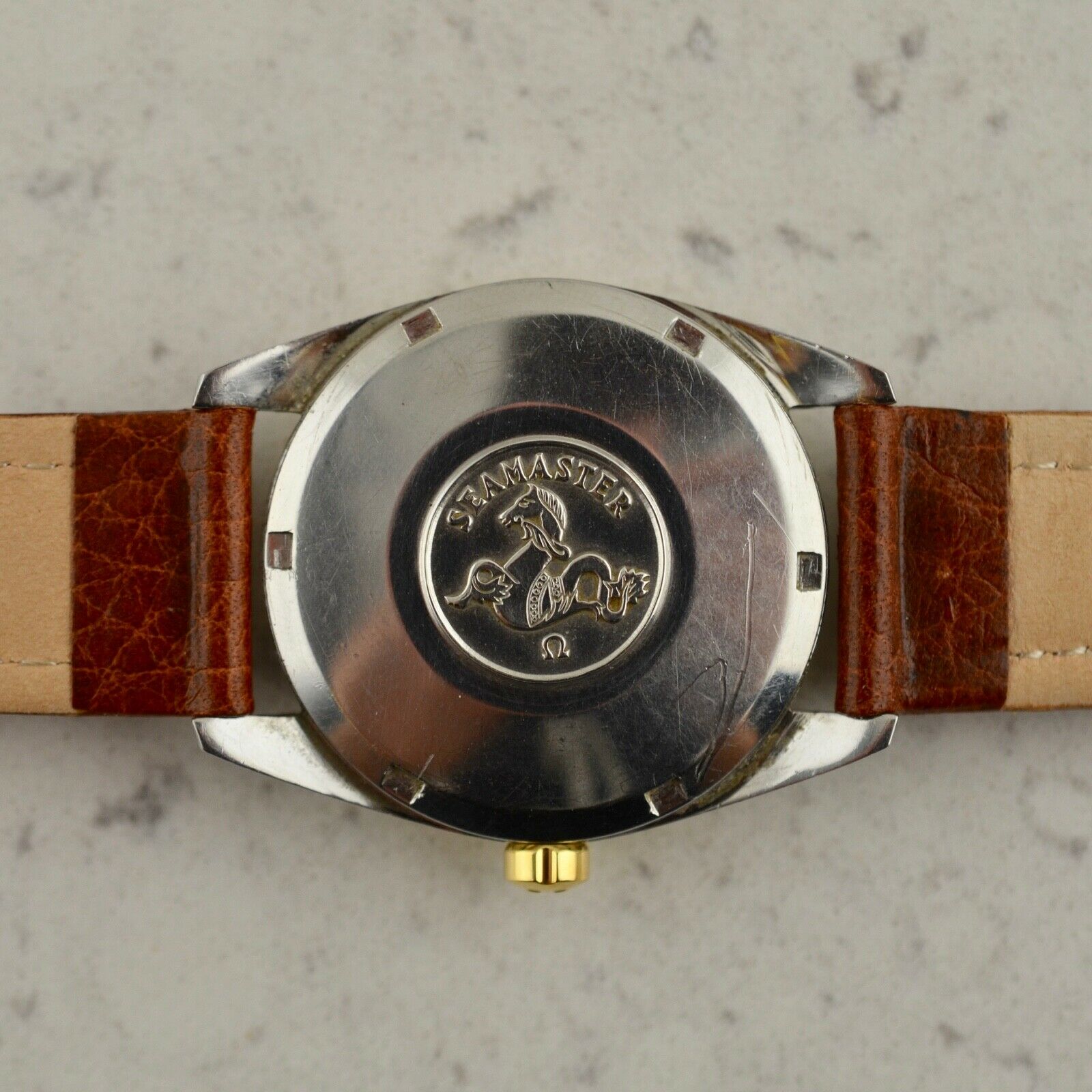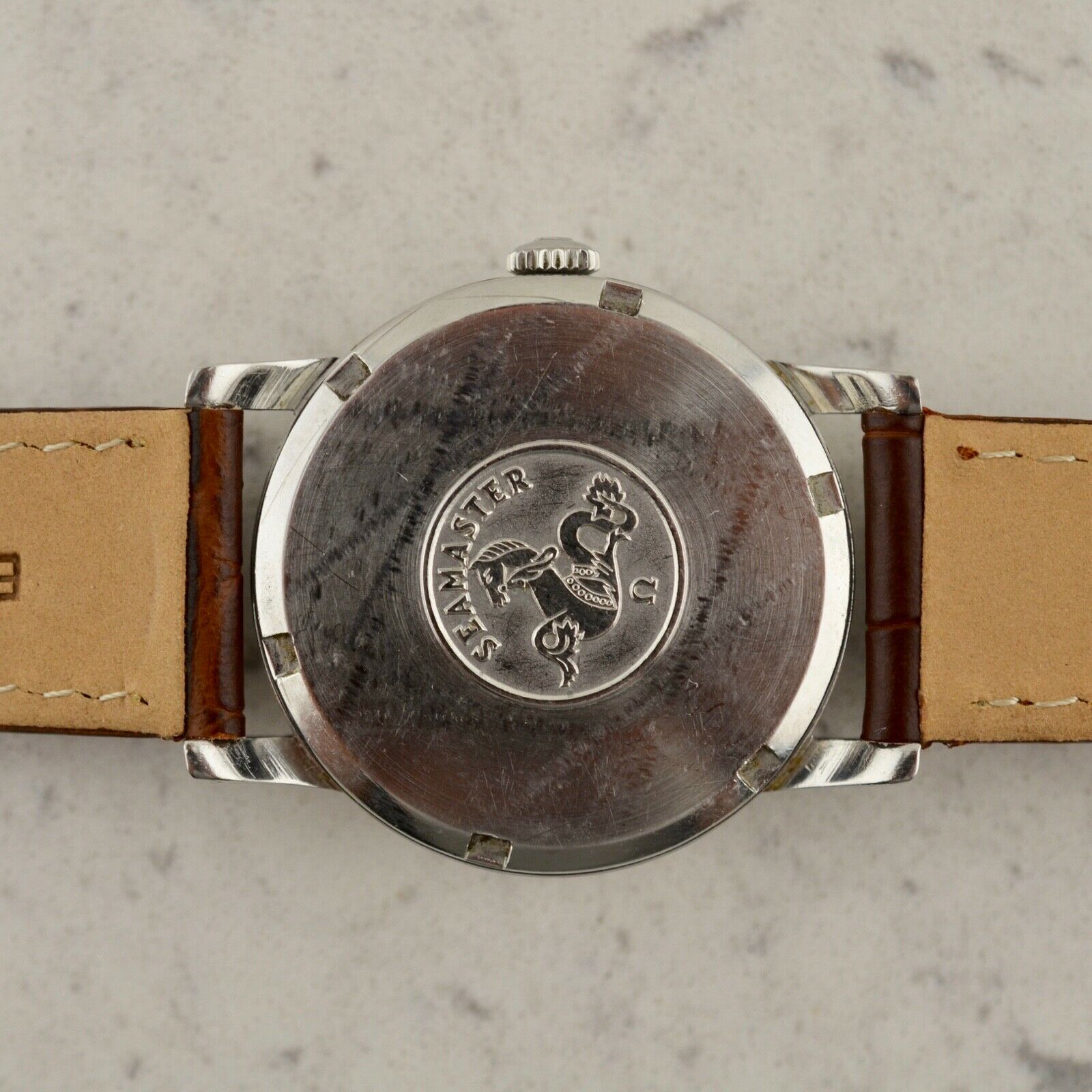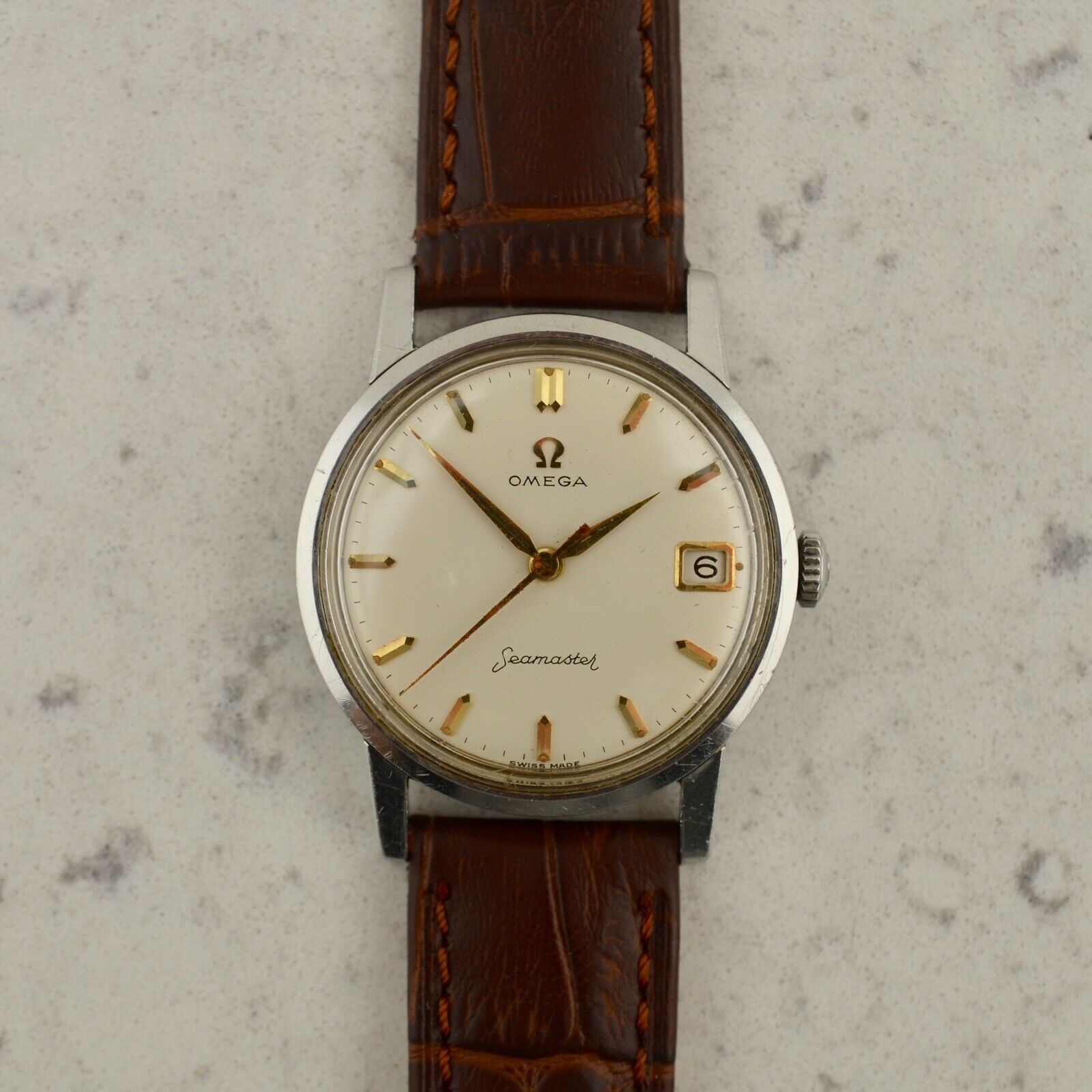 Stainless steel, notched twist back case, Seamaster Hippocampus medallion, waterproof, 33.50mm diameter, faceted downturned lugs. Case maintains the original polished finish. Original white dial with applied gold arrow batons and luminous plots, in very good condition. Original gold toned dauphine hands with luminous infill. Original Ω signed crown. Original Hesalite crystal. Omega Caliber Ω 610 manual winding movement, unserviced and in good running order. Brand New Leather band with chrome buckle.