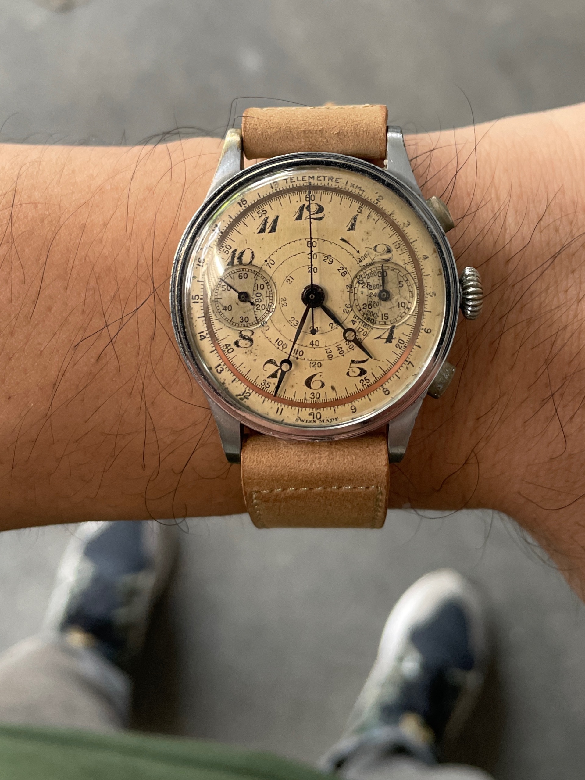 The Breguet hour and minute hands, and the lollipop chrono sweep are also cool. Then you have the stepped case, olive pushers and onion crown! The size (35mm) also makes this a commanding, yet comfortable watch on the wrist. Service history unknown.