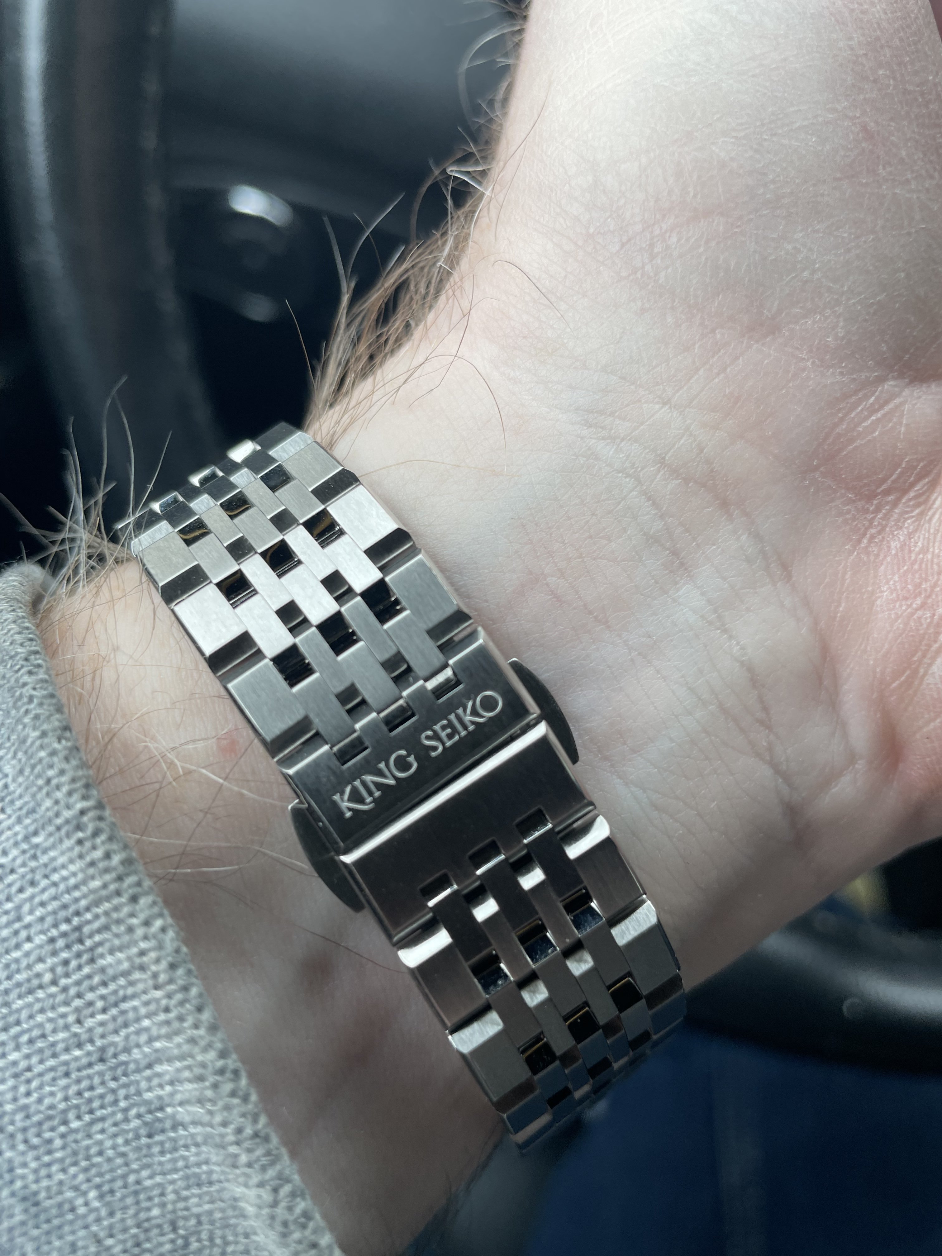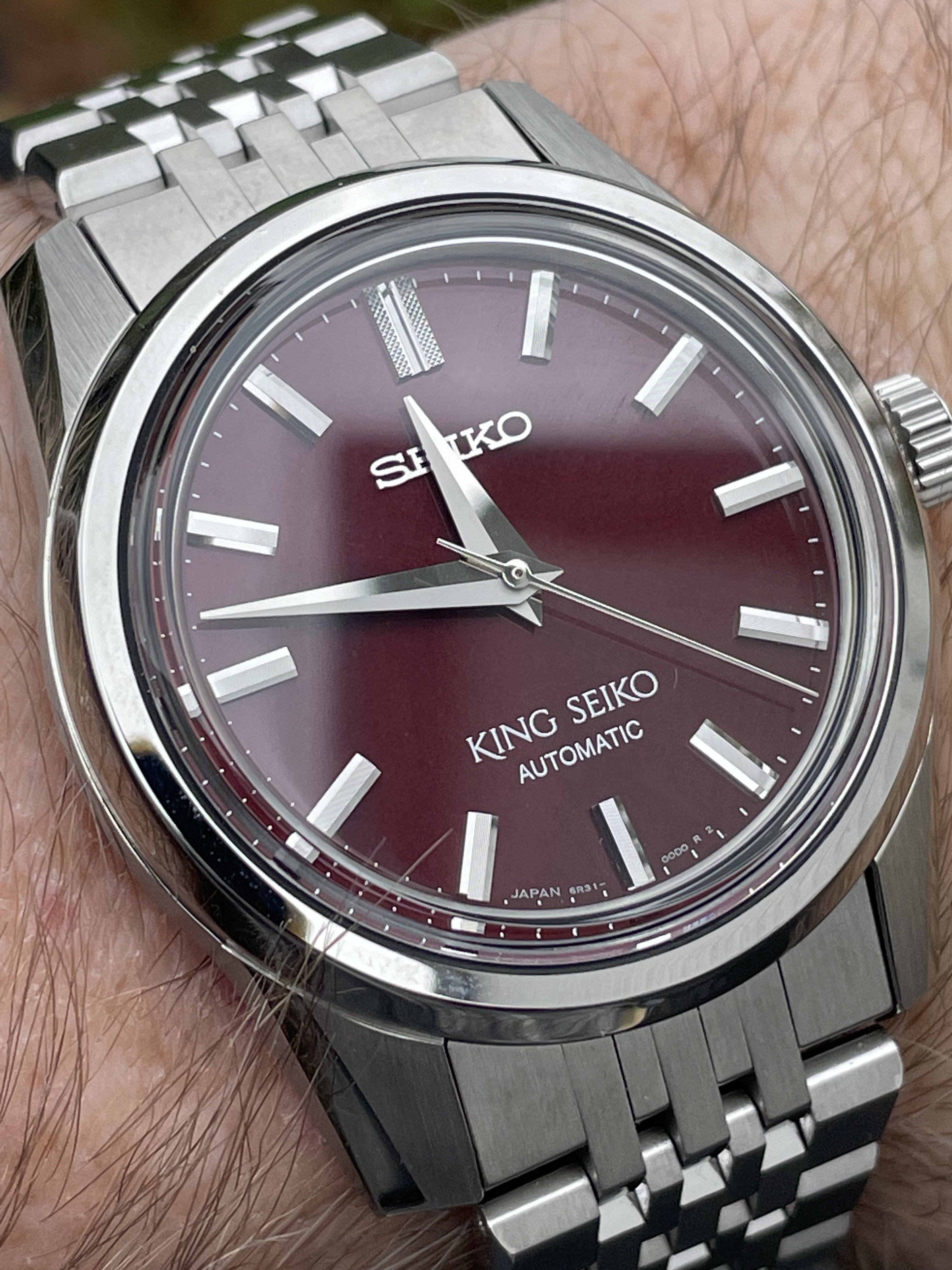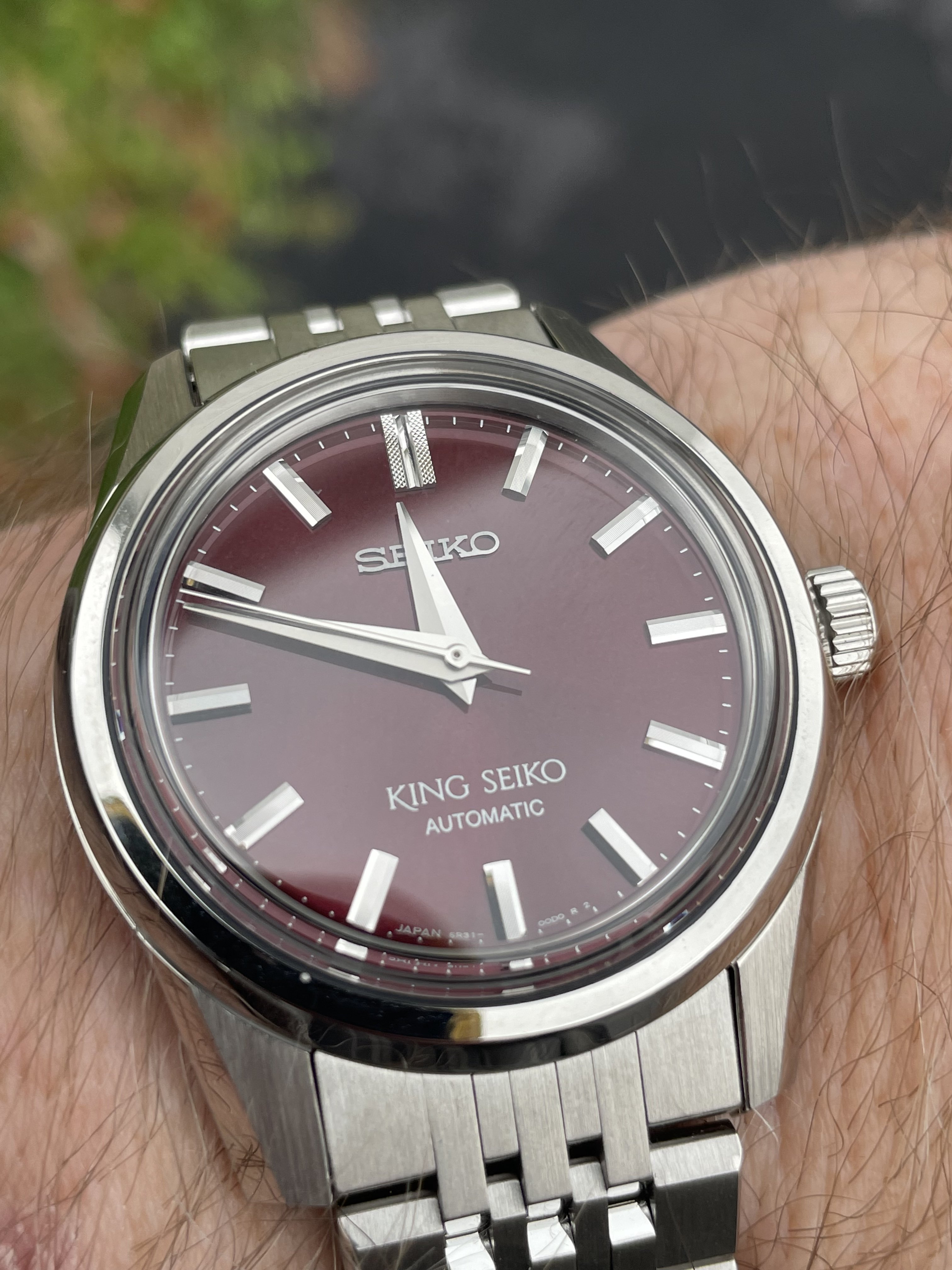 I looked up the seller he was legit so I said wtf and ordered the burgundy dial. First off I didn’t realize the bracelet was collar and pins so it was a battle sizing it. I swore quite a bit. I noticed the burgundy dial looks cool in the sun but no sun today.