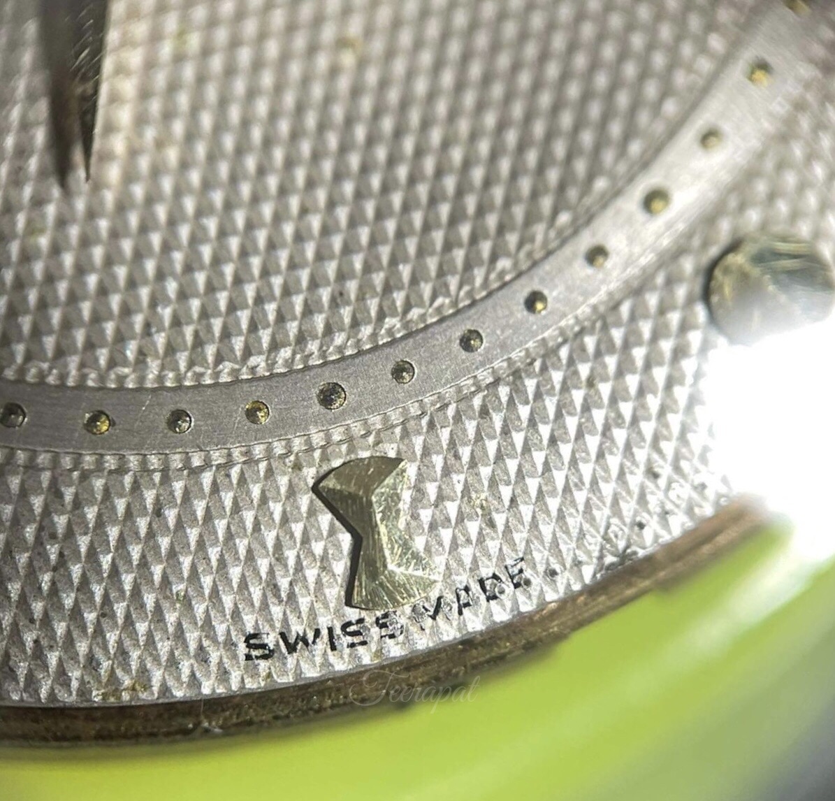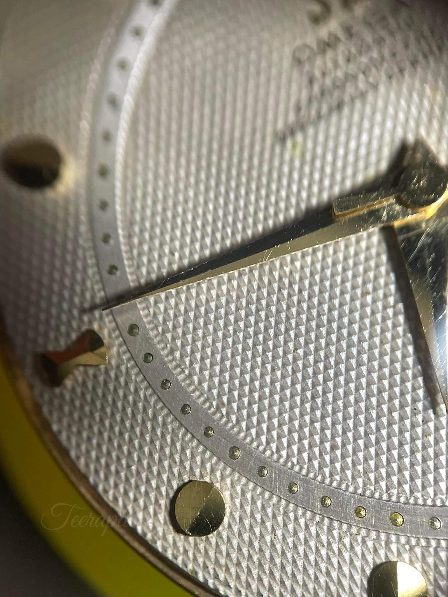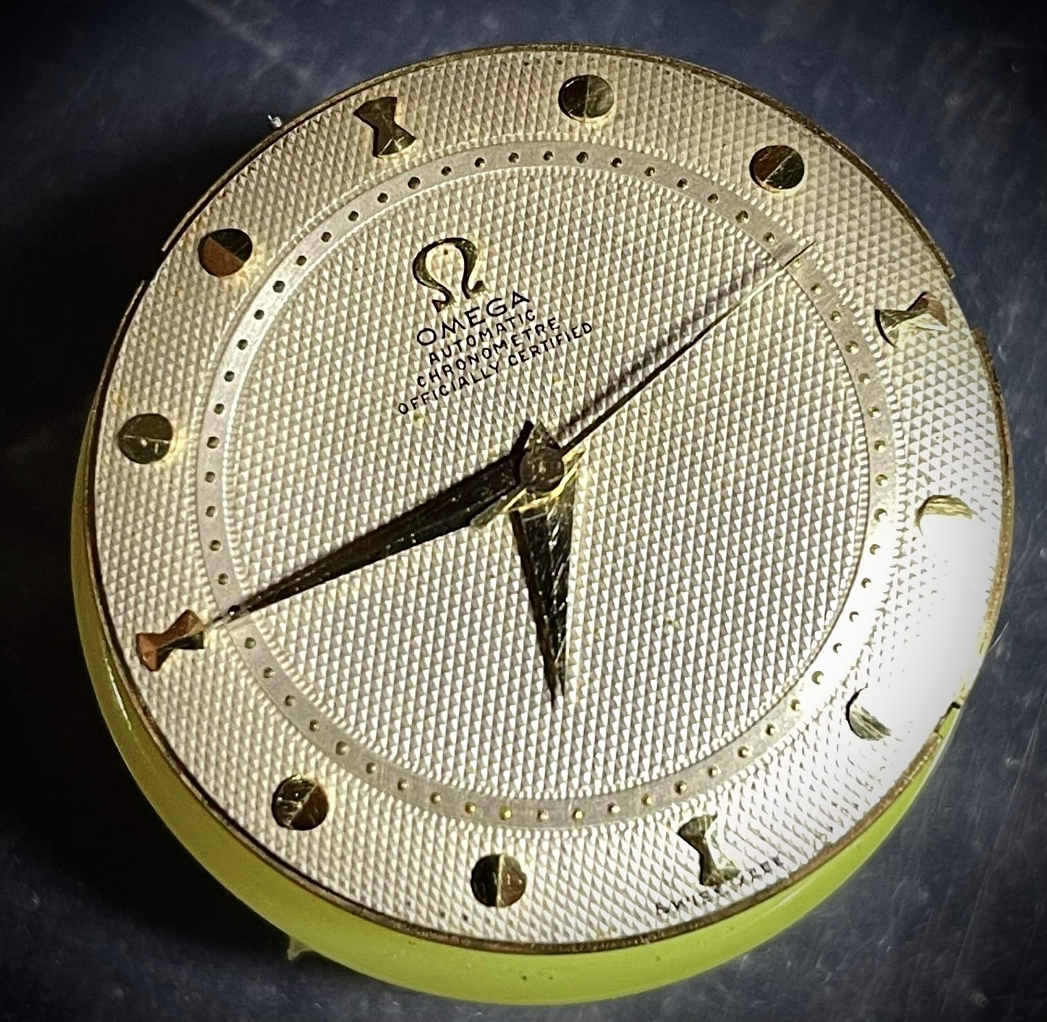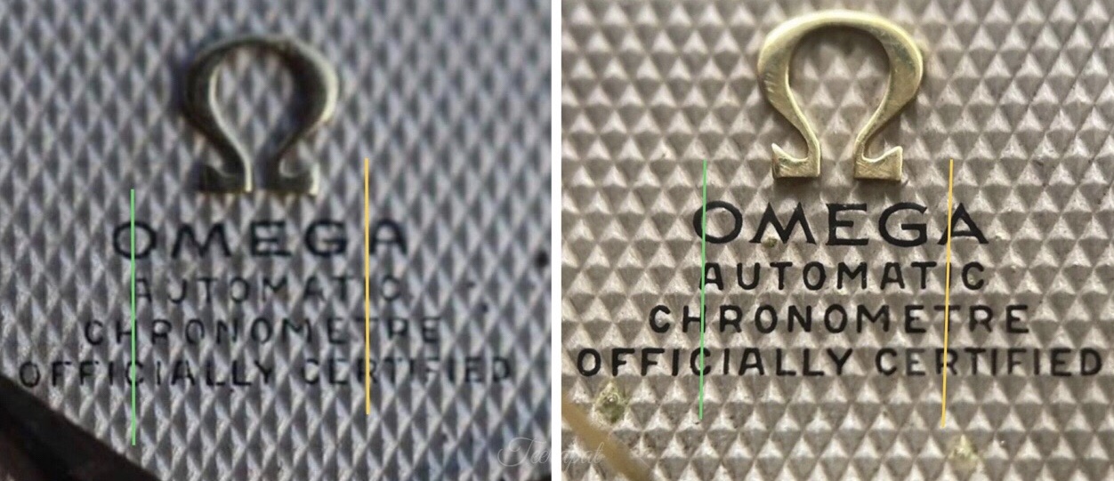 I compare both watches. Even the difference version of “OMEGA” word, please note that the alignment is the same between “A H C” and “I T R” (as marked by the green and yellow lines accordingly).