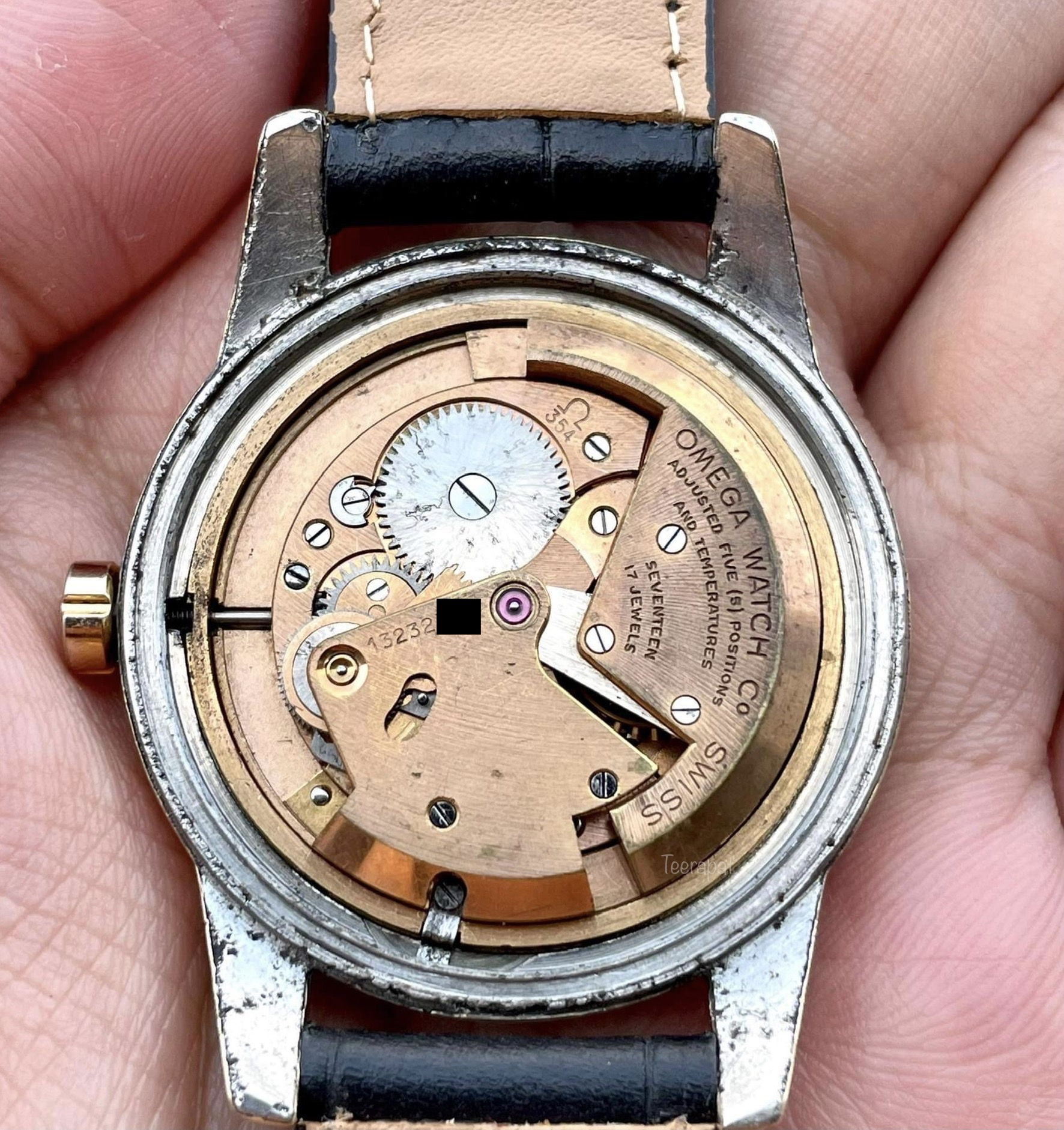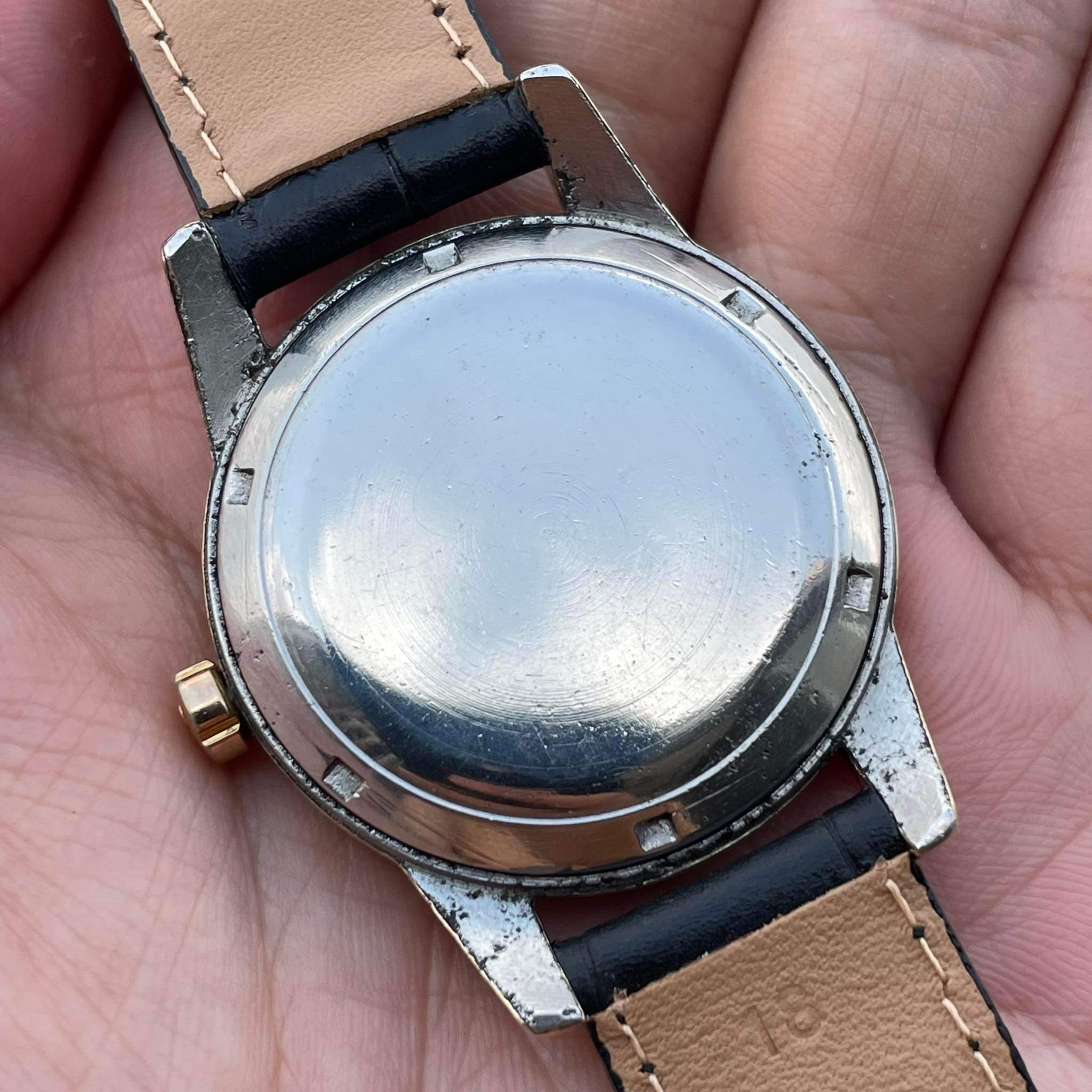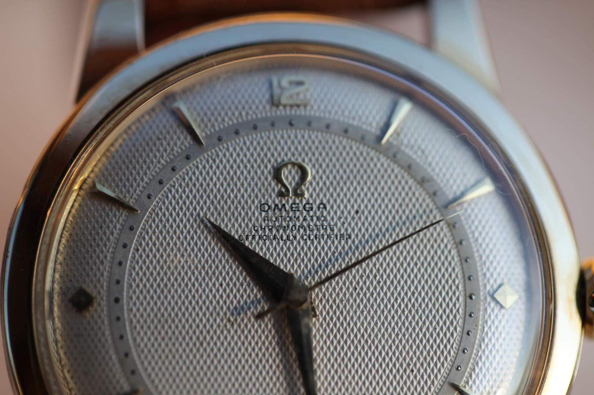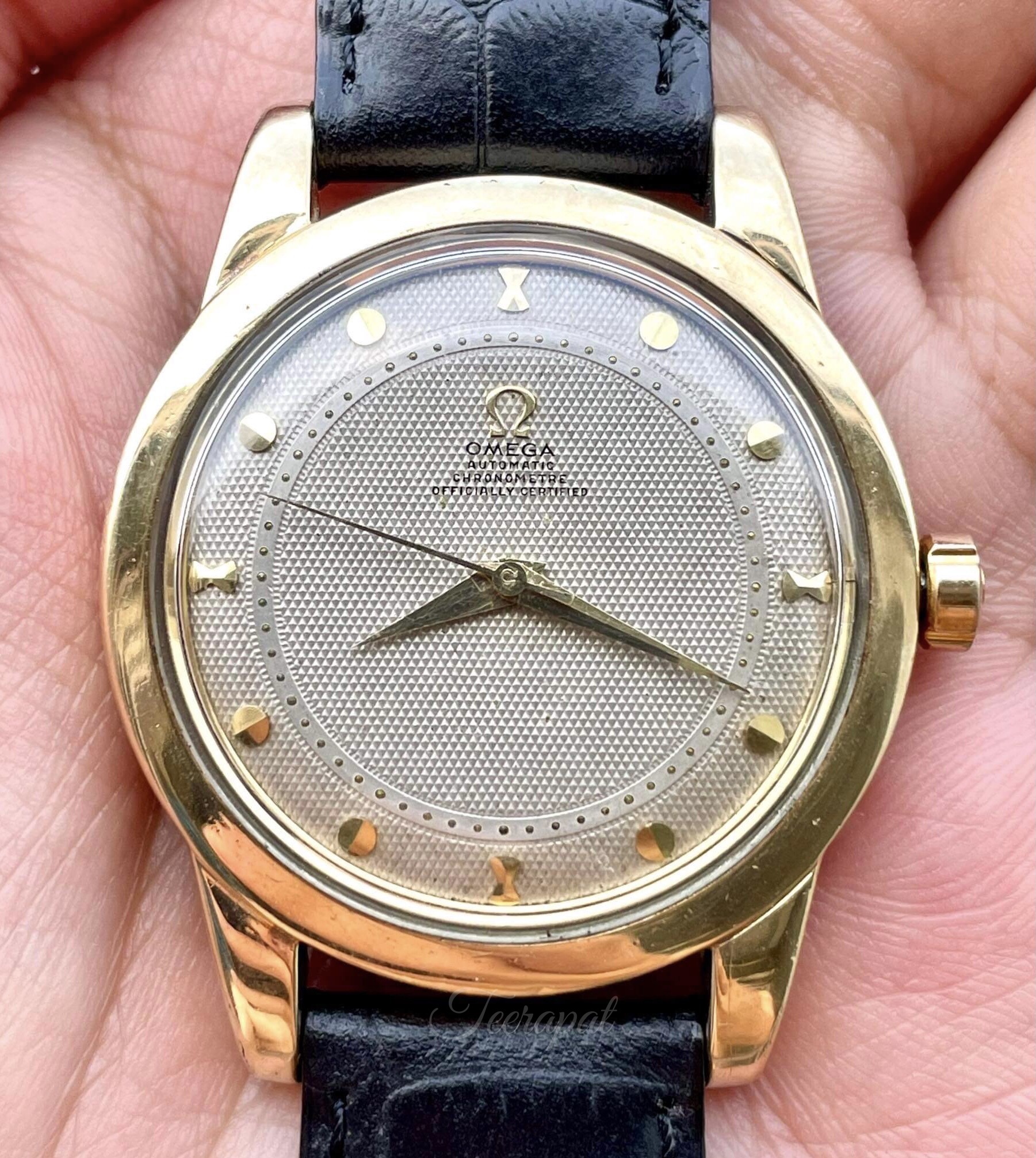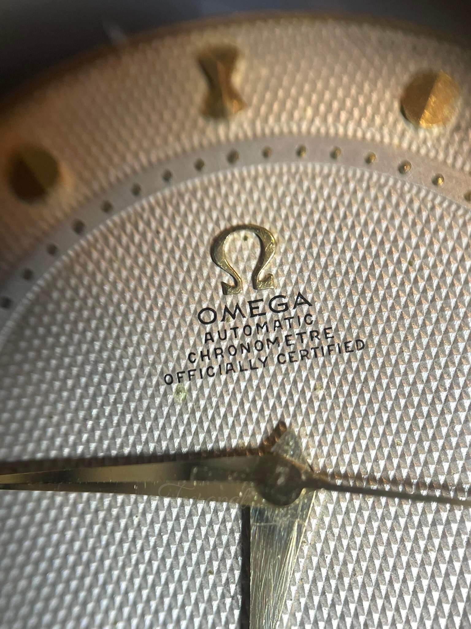 This uncommon omega ref. 2494-2, 2657 SC, used cal. 354 with the larger size than usual (36.5 mm excluding the crown). The serial number was 13,232,xxx (approximately 1953).
