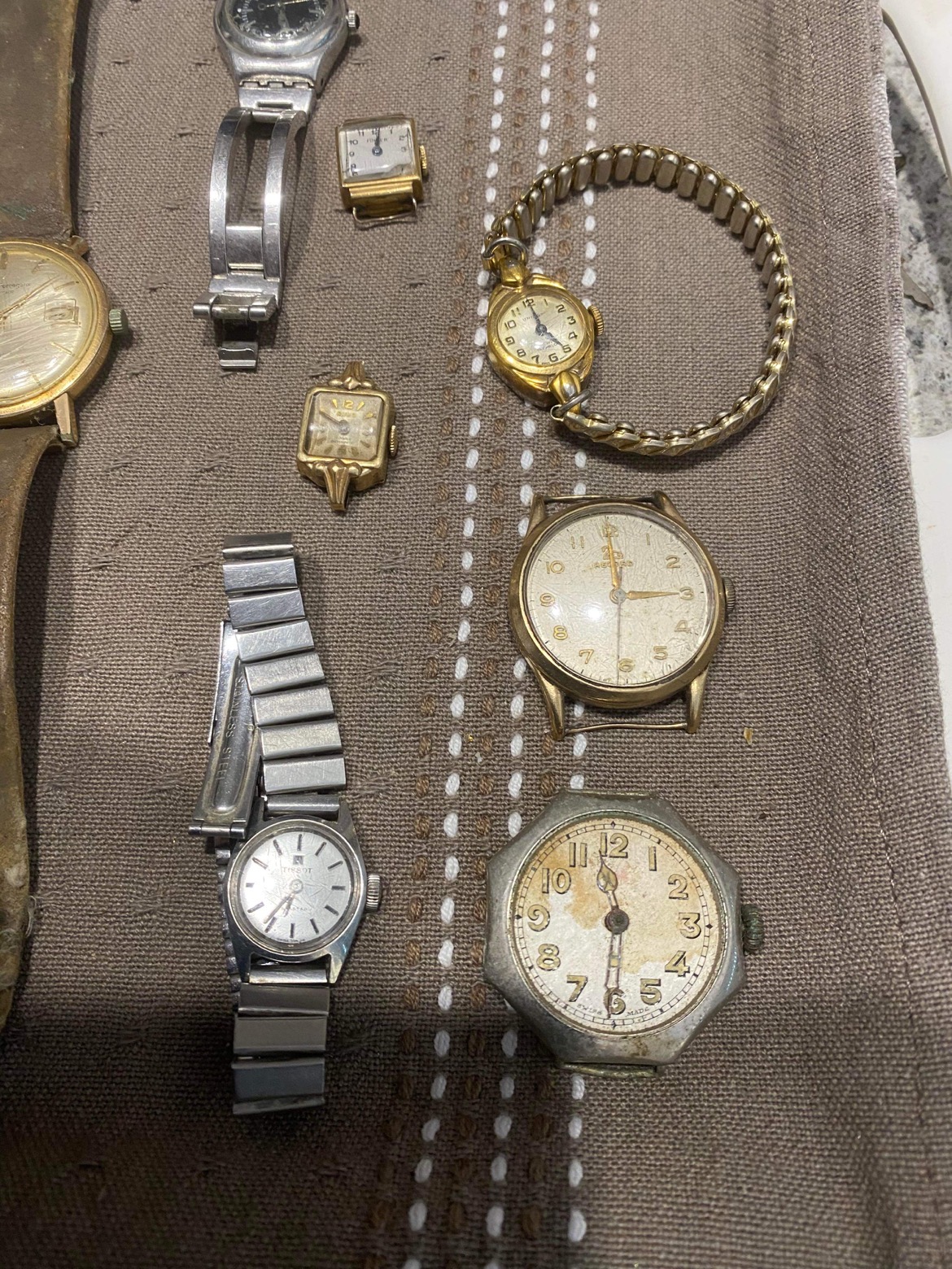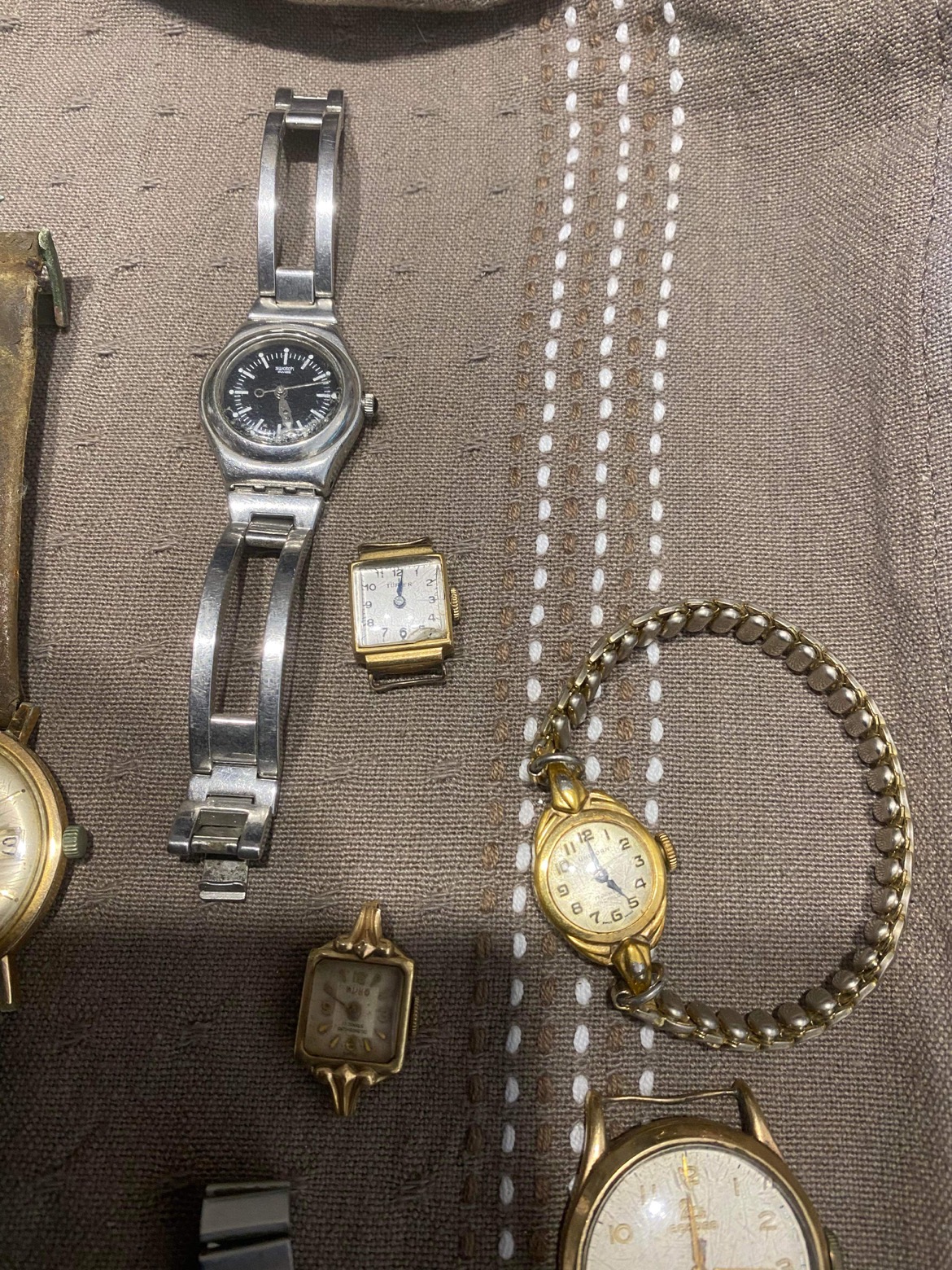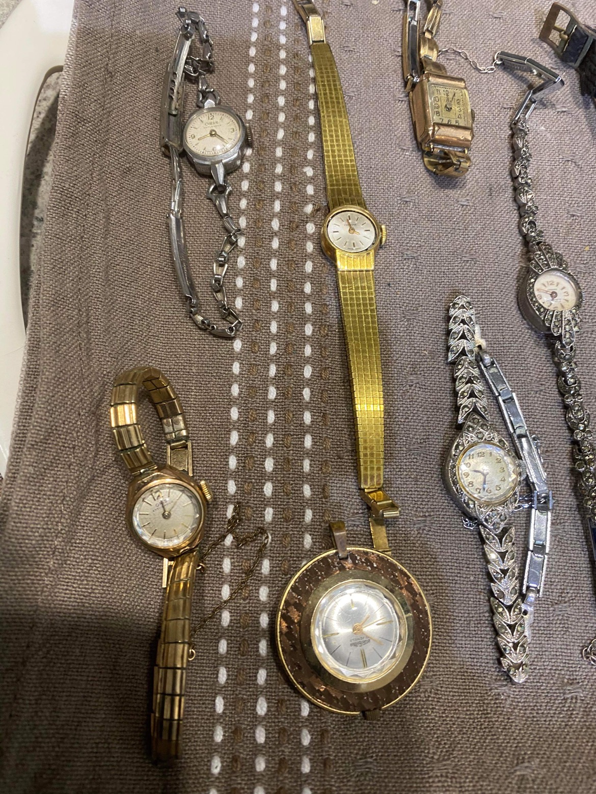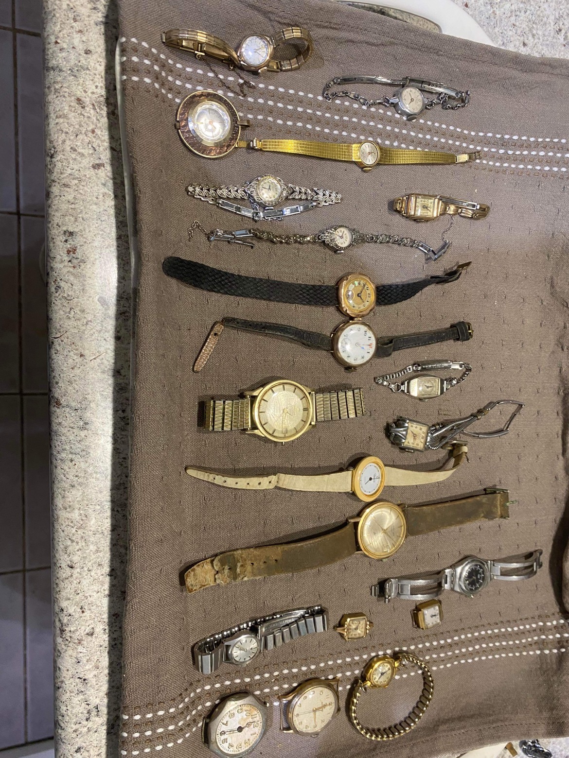 from what I can see I have a pie pan in gold without crown, a couple of lady’s oris, a ladies tissot a trench watch and a bunch of no name or forgotten brands from yesteryear.