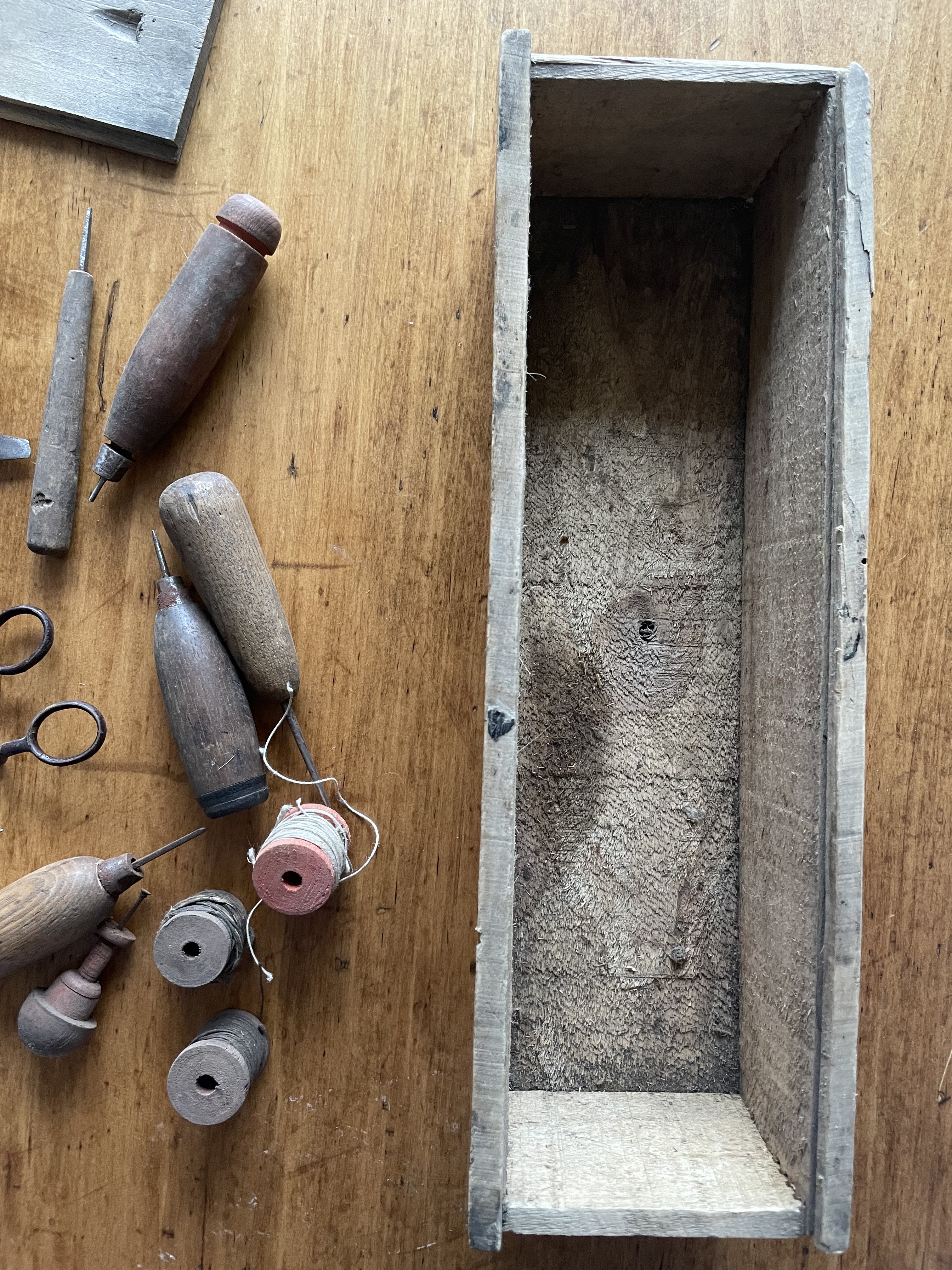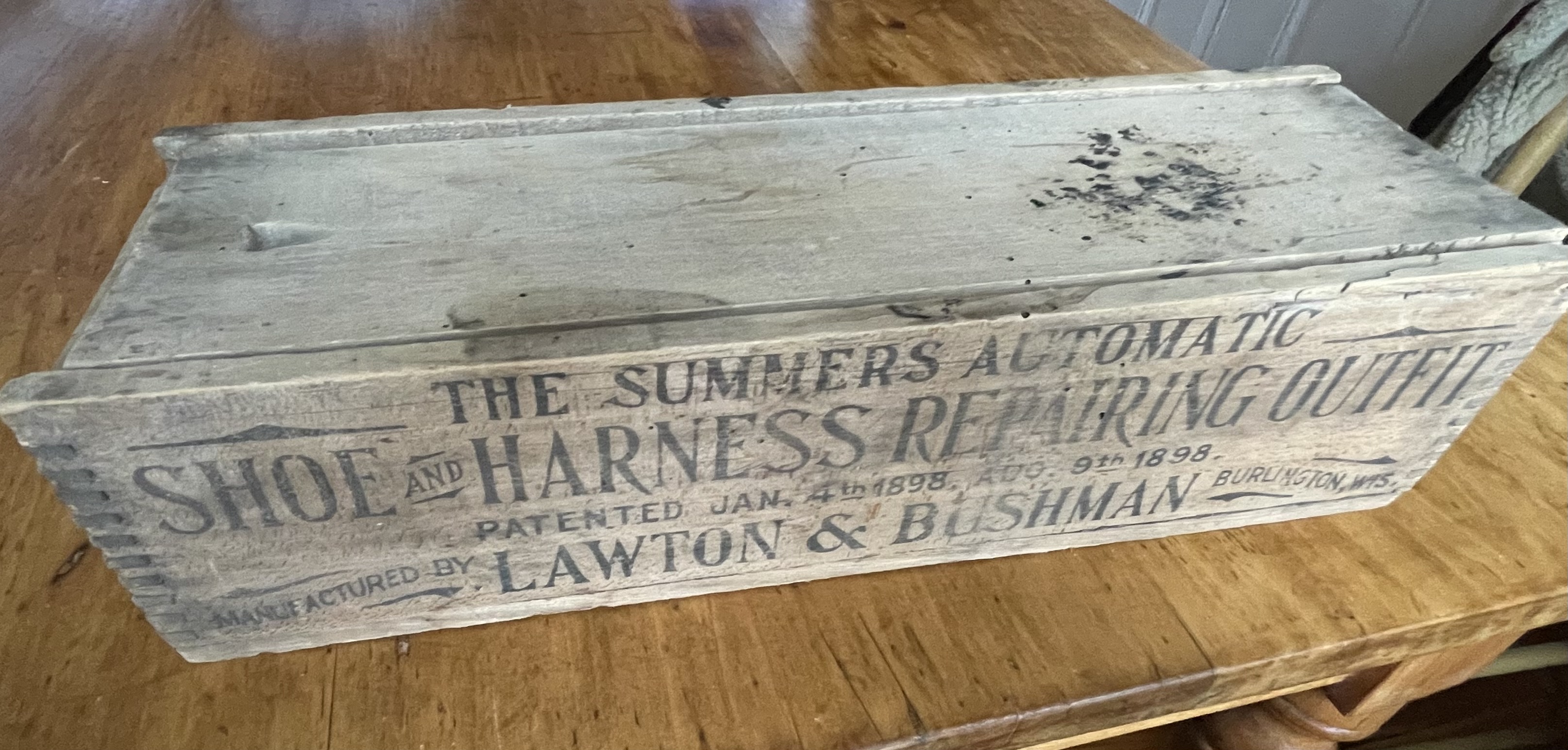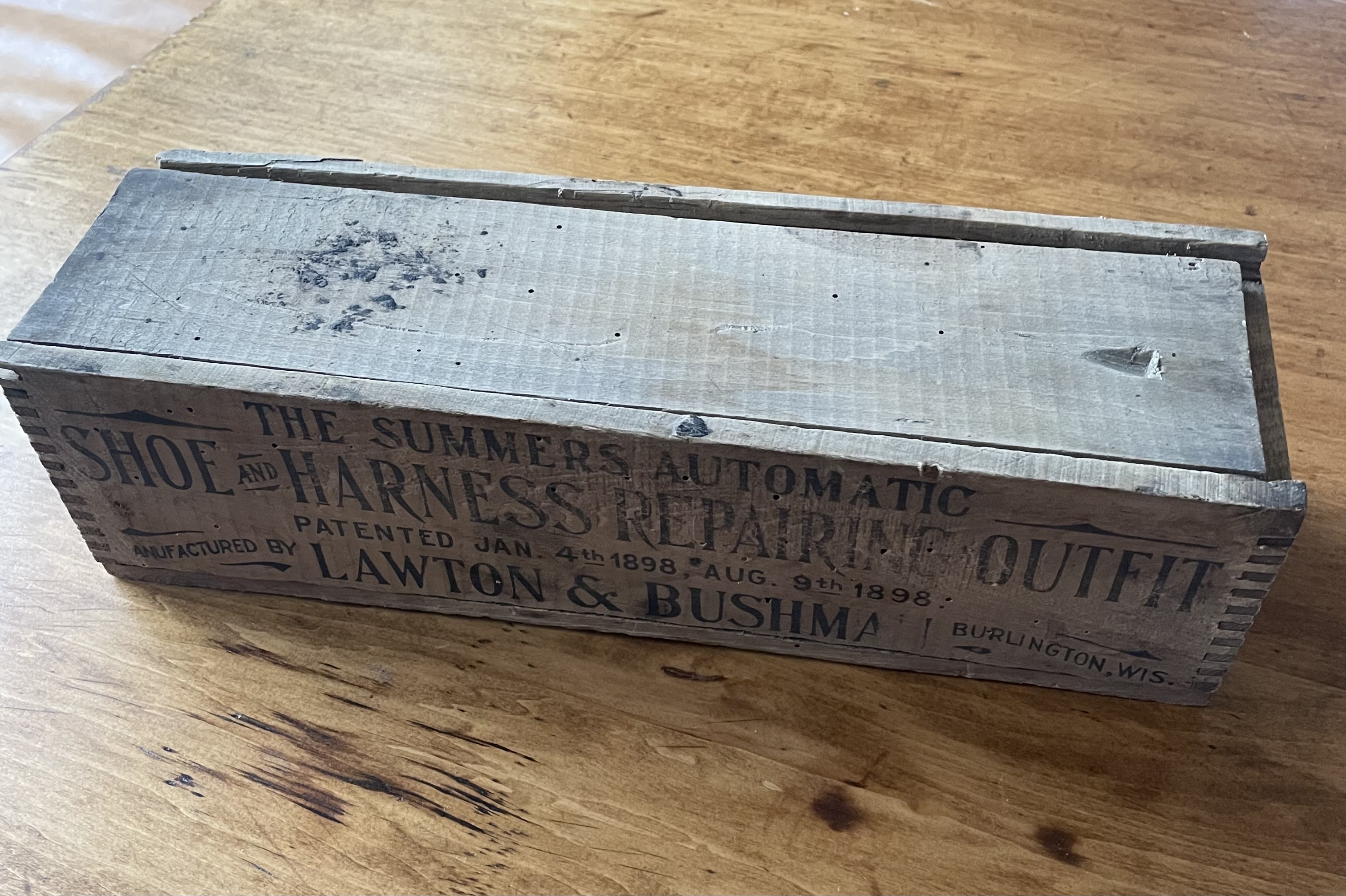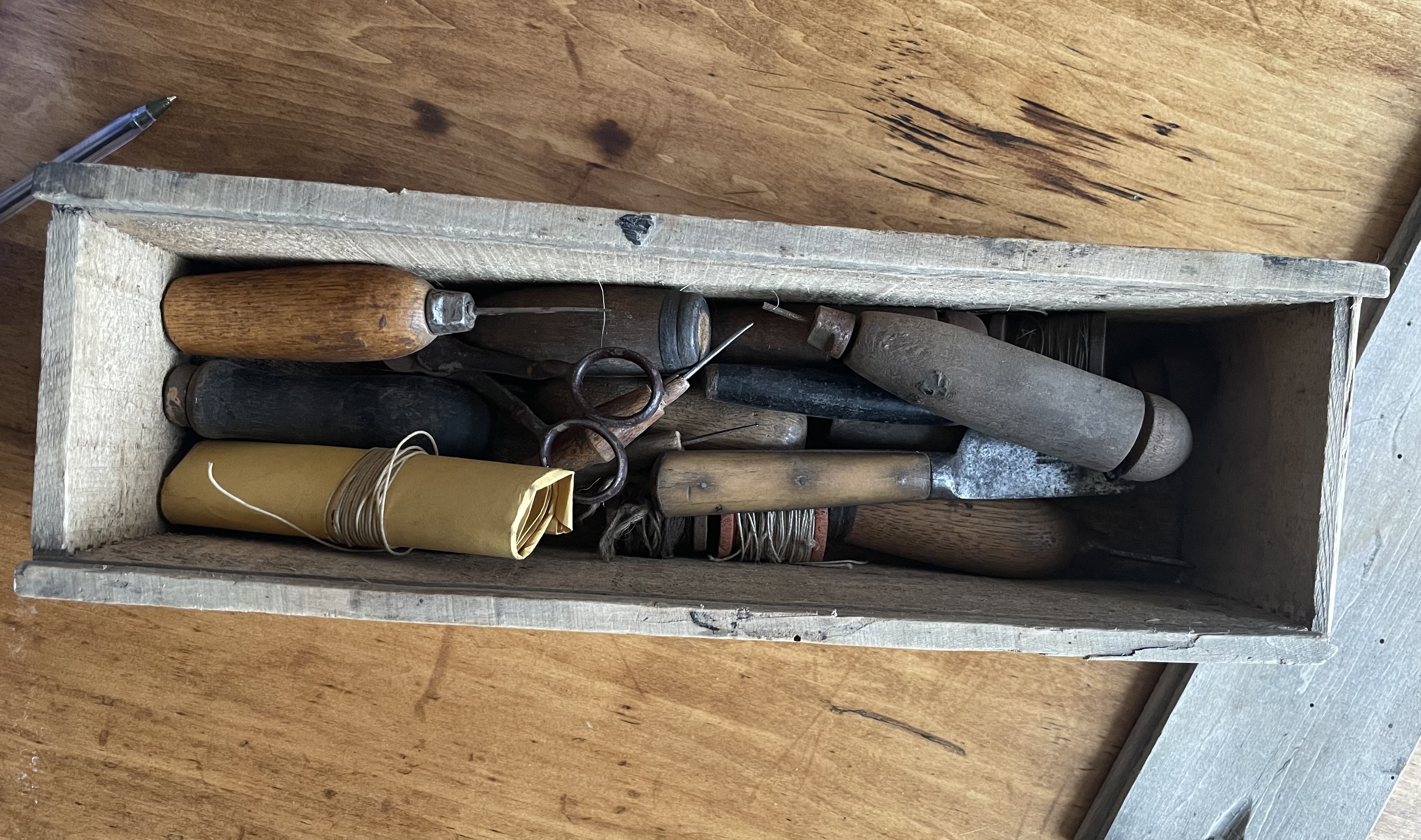 When @DaveK visits I will let him pick an awl from this batch. These tools came with this amazing old box. As a teenager I worked in shoe repair. Leatherwork goes back a long time for me.