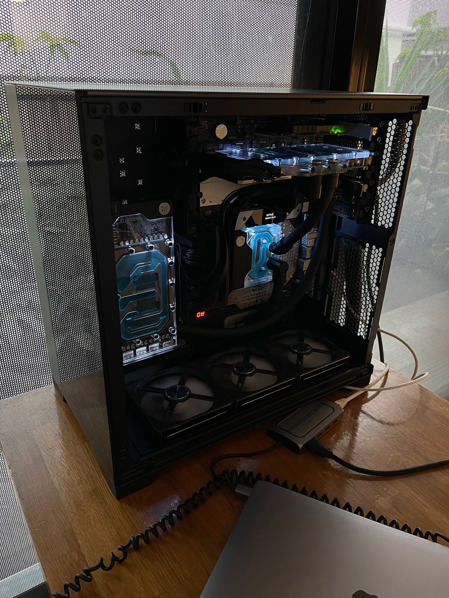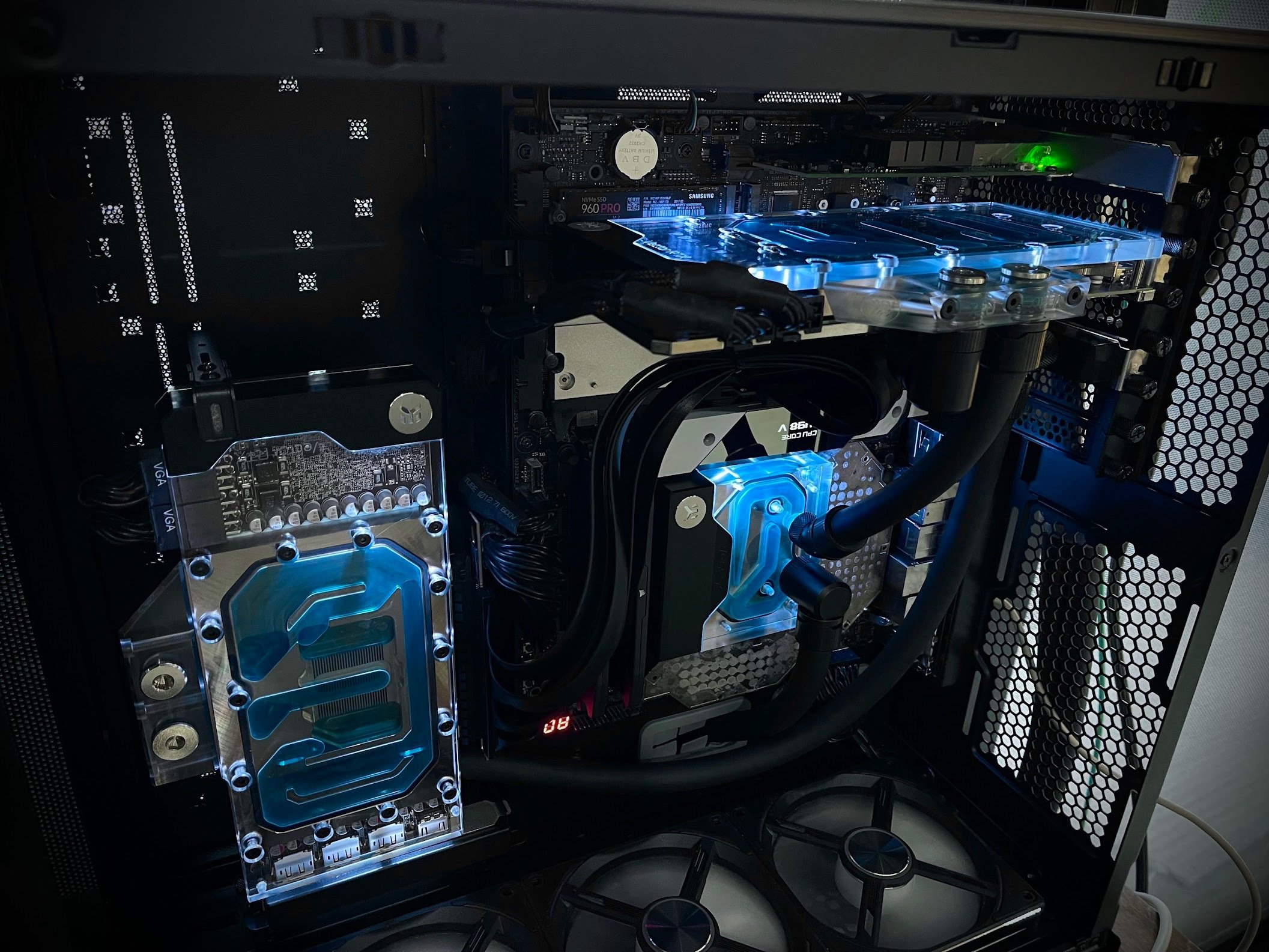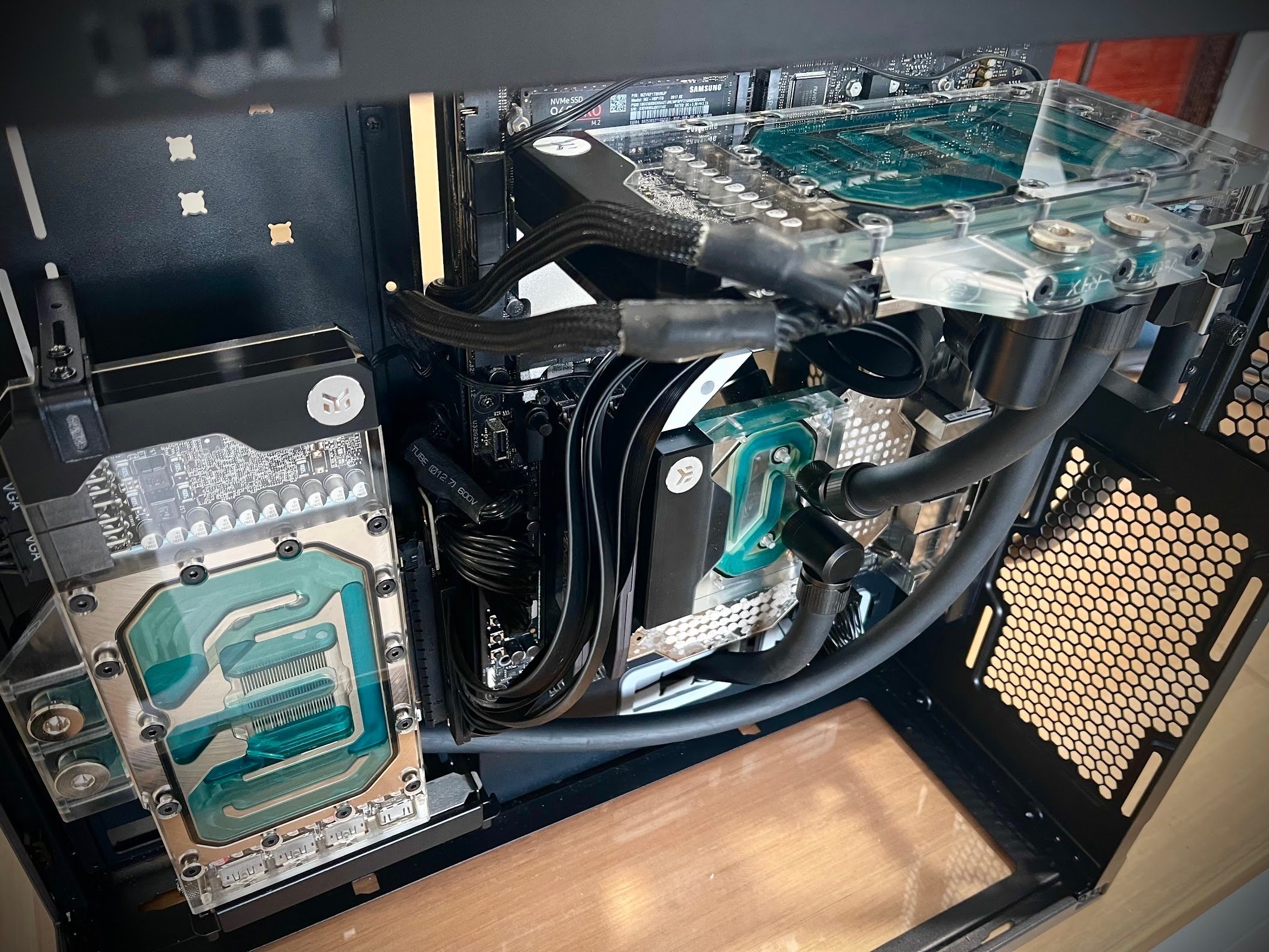 This is @trev’s setup, dual 3080tis so a bit weaker but with 12900k all under water with standalone radiator, resolve, octane etc make good use of the dual cards without SLI so it does pretty well