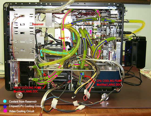 At the time, I was showing off the dual water-cooling circuitry to friends. There was one cooling circuit with it's own pump to cool the twin video cards in SLI mode, complete with it's own reservoir, radiator and cooling fan and there was the primary cooling circuit for the CPU and chipset, also with an independent pump, reservoir and cooling radiator.