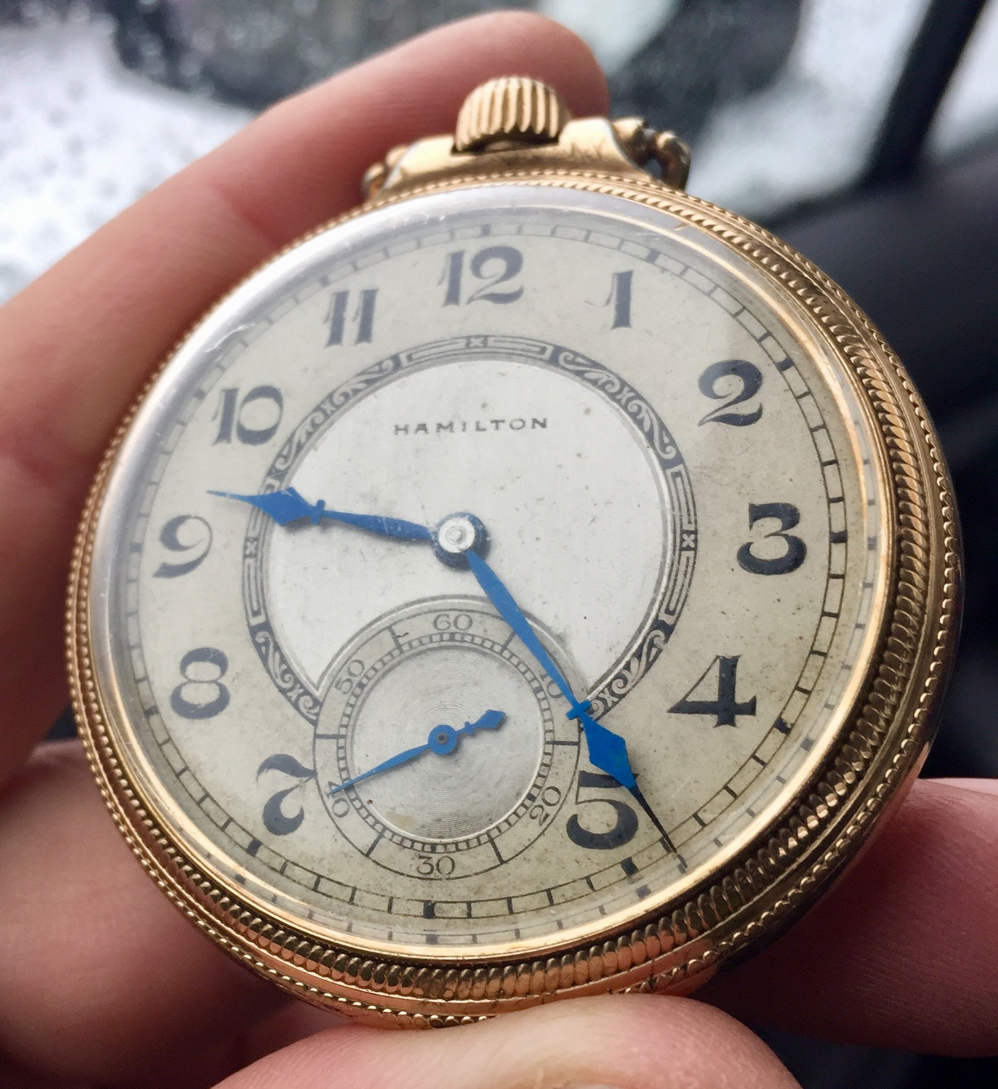 Hamilton grade "Special 974", size-16, with 17 jewels and a 10K yellow gold filled case. Referred to as the “Traffic Special”, it was produced from 1928 through 1940 for electric commuter train services.