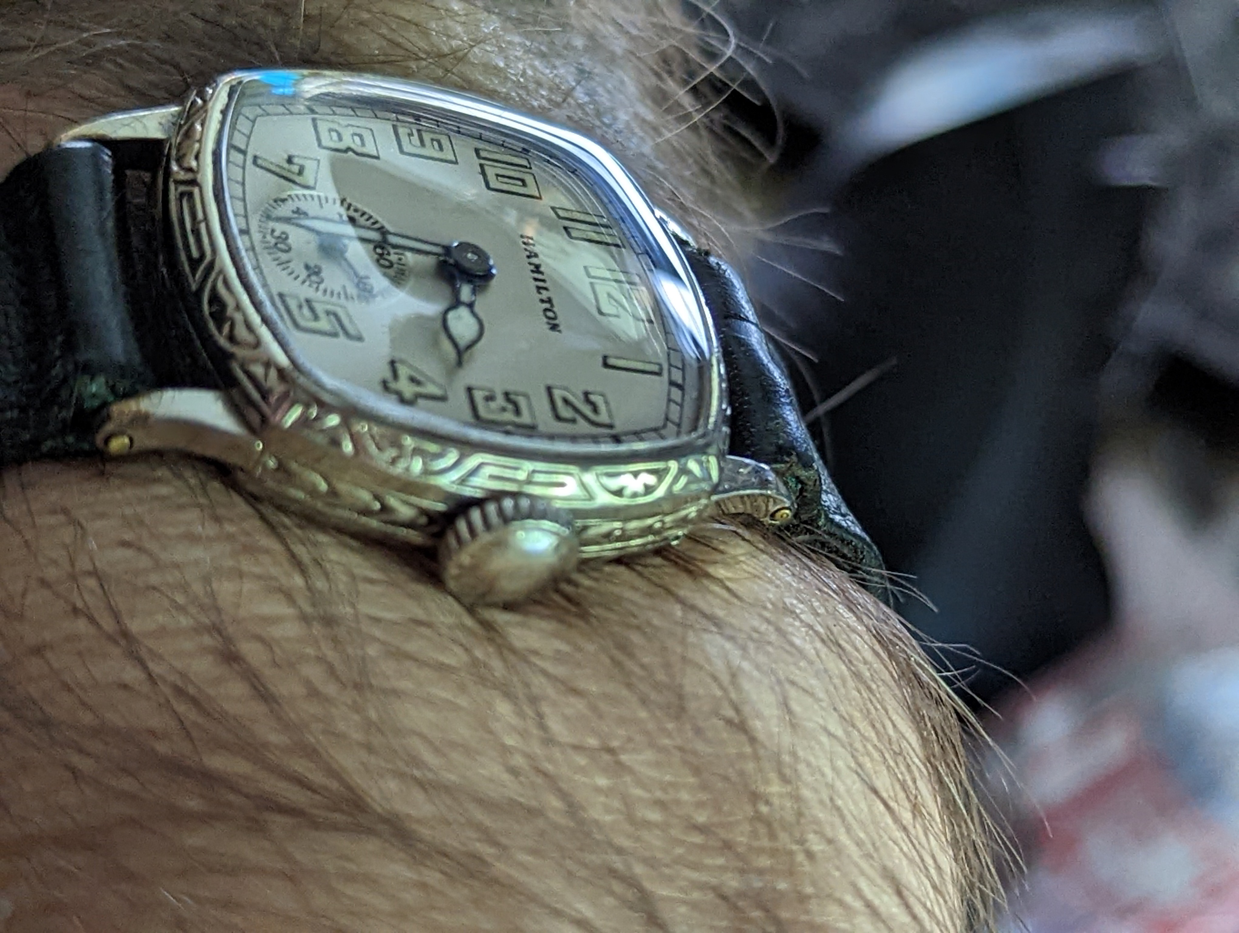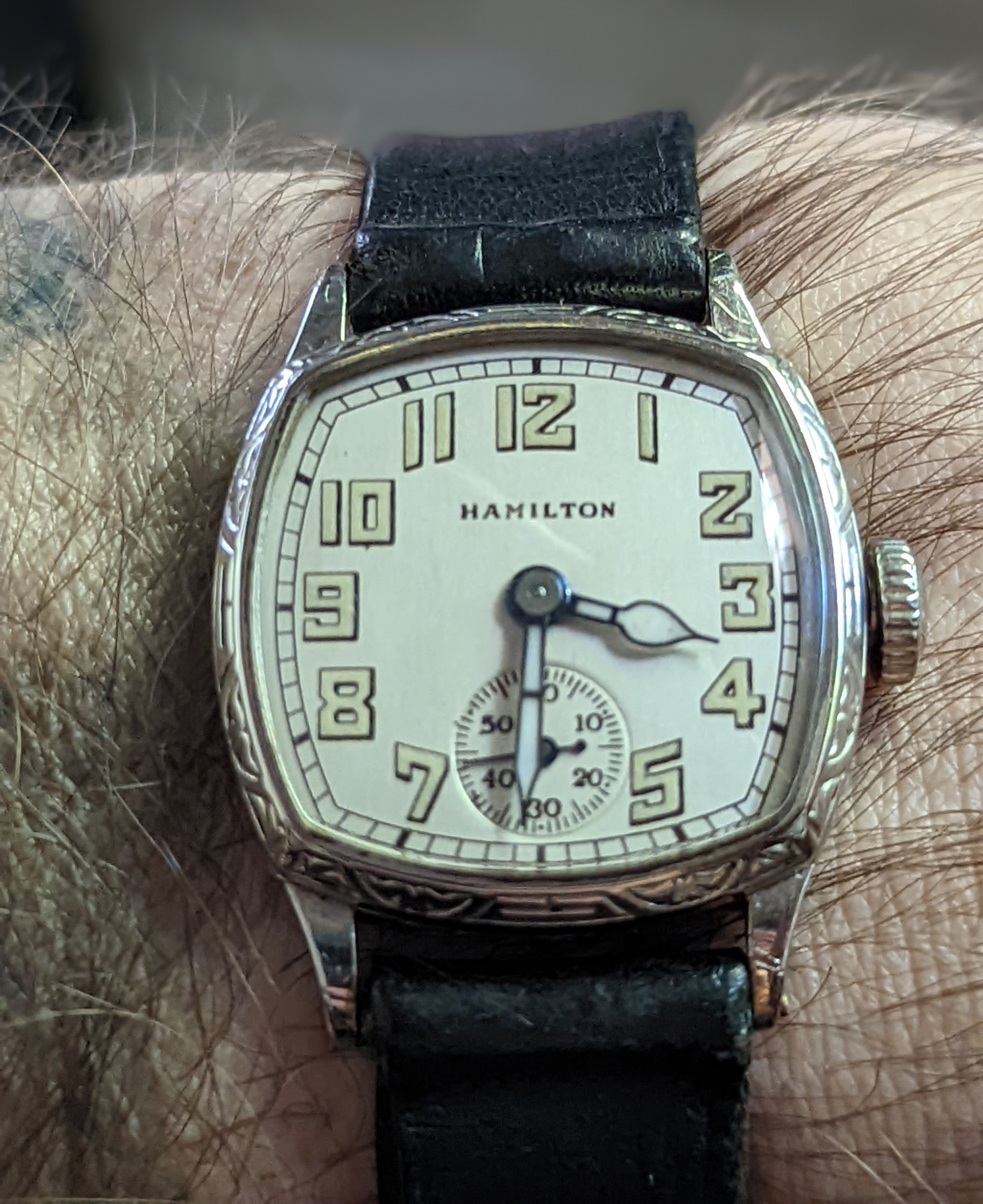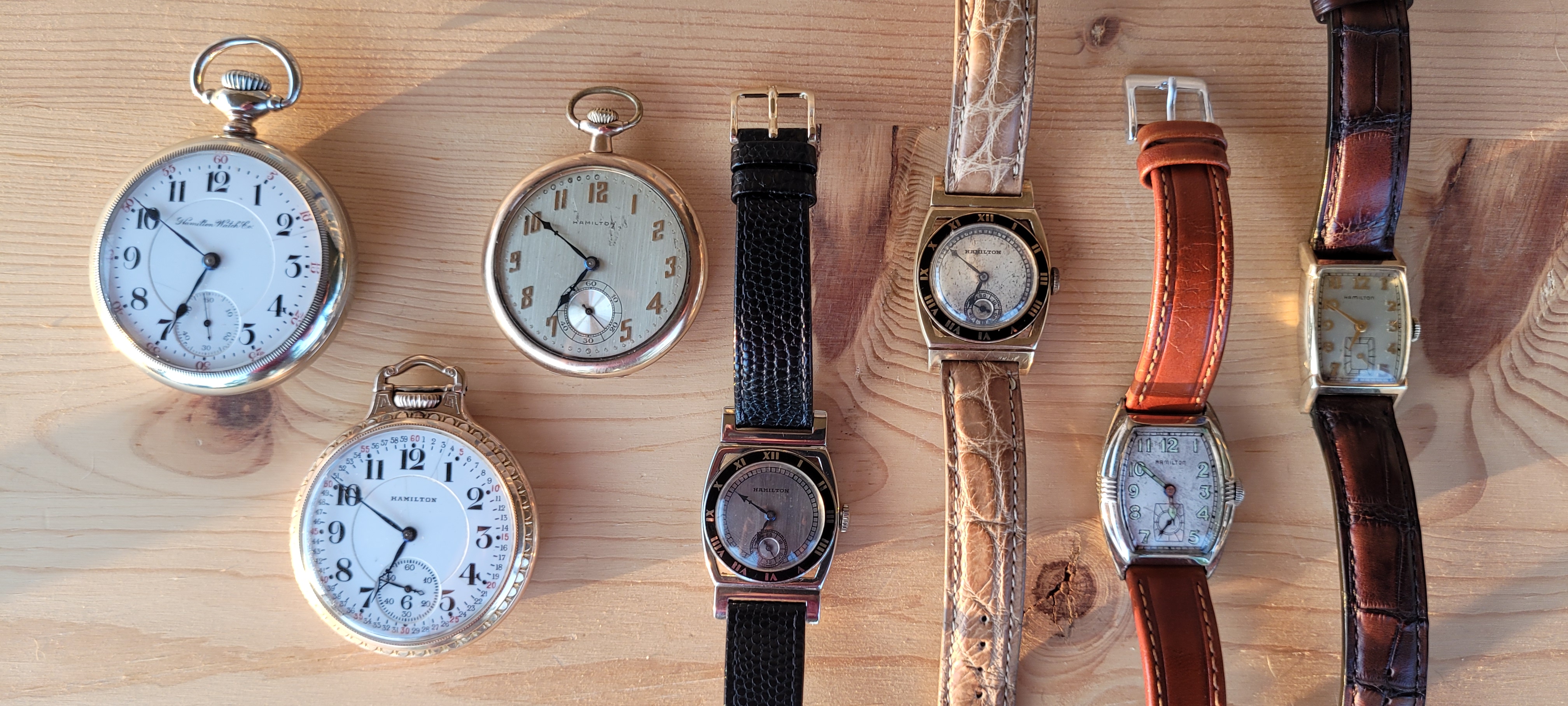 I've never posted a photo of my Hamiltons all together before. Here is my 1903 940, 1923 920, 1926 992, 1929 Piping Rock in white and yellow gold and both powered by the 979f movement, 1930 Perry powered by the 987f movement, and 1948 Turner powered by a 770 movement.