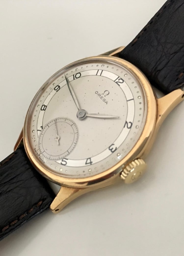 I always associate the dial type of your watch with the ones found in Sweden from time to time - these use a Swedish made case: https://omegaforums.net/threads/14k-gold-omega-from-the-late-40s-need-some-help-with-the-case.71796/