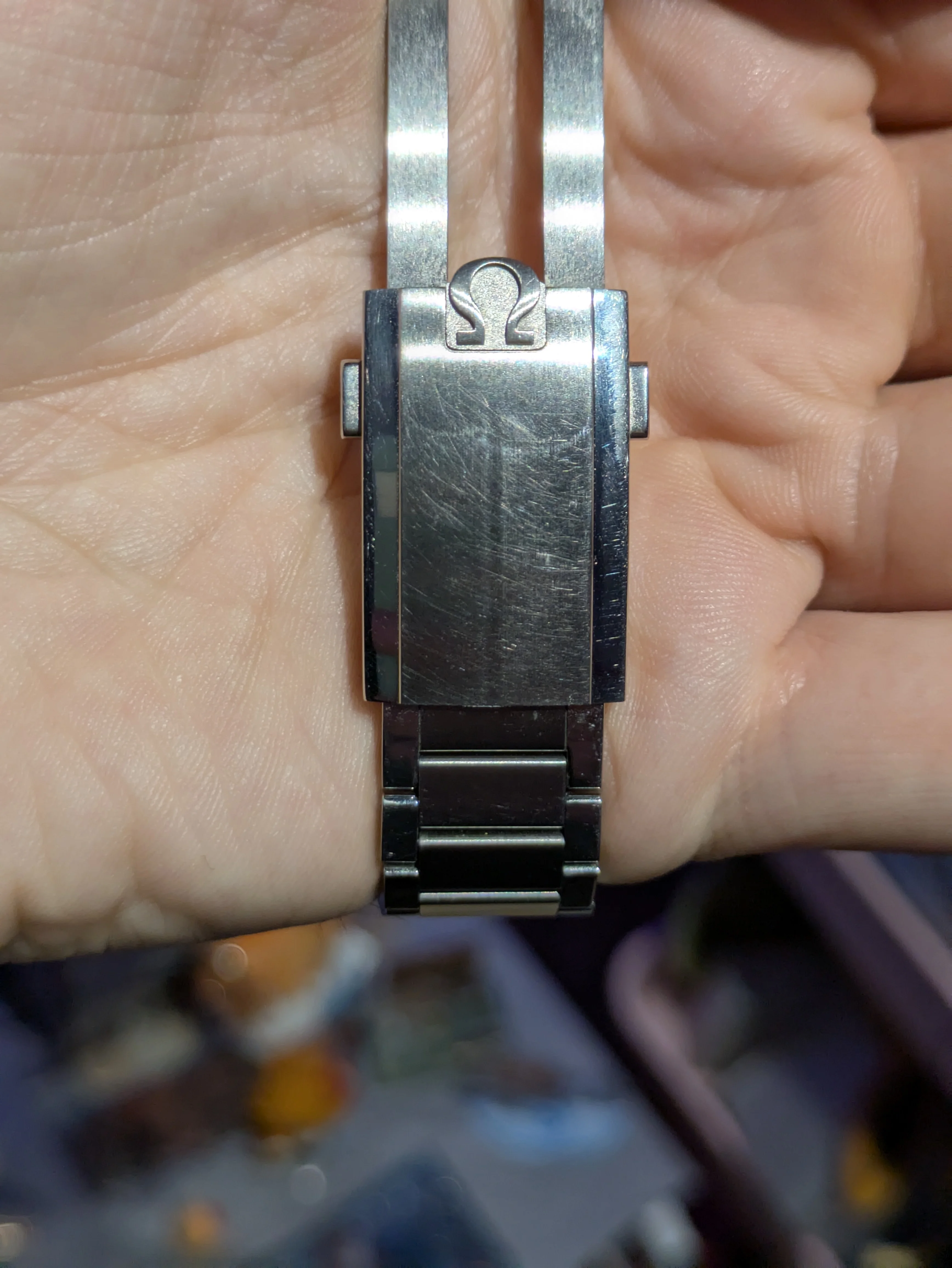 ·I picked up this bracelet as a direct order from Omega just before Christmas 2024 (it's the 50th Anniversary Apollo 11 bracelet) and now that I've started using it quite a bit in the summer and wearing it out in bright daylight and the sunshine I noticed this big long dark streak right down the centre of the clasp leading on from the Omega logo.