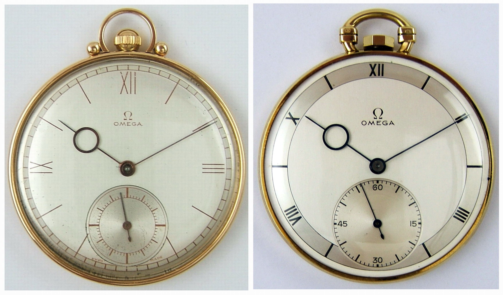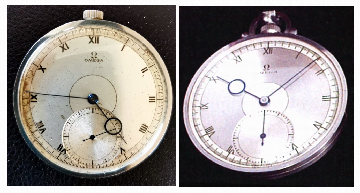 At this time, Omega made pocket watches with calibres 37.5, 37.6 and 38.5, with many variations of dial, hands, stem/bow, case and case material. What is unusual here are the 1/5th marks on the minute scale - which would normally have been used on a watch with a centre second hand (such as a chronograph). The reference 1055 (CK1055 for steel, OJ- /OT1055for gold) had these 1/5th marks - and also the (lovely!) pontife hands.