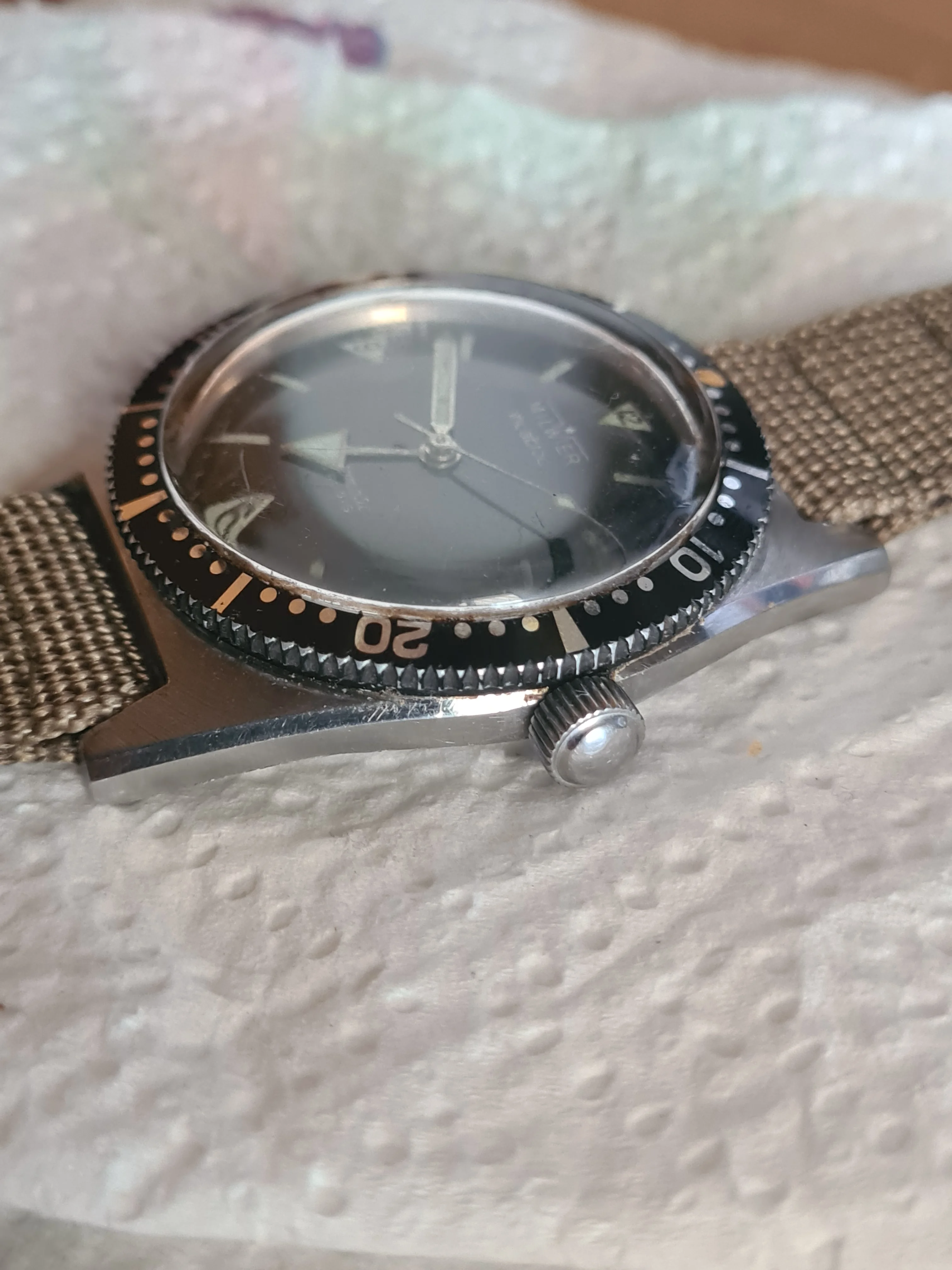 ·Barn find on a recent trip to Italy. I can't find any info on the brand, and it's not listed on Microlisk. It looks like a Seiko 62mas-style case (also used by Stowa, the Smith's Astral, and in several other divers from the period), though with some nice additional beveling. The dial most closely resembles the Yema "skin diver" model, and the hands and bezel, those on the Smith's Astral. I've seen that particular style of "w" on a Waltham, but that might be coincidence. Any info appreciated!
