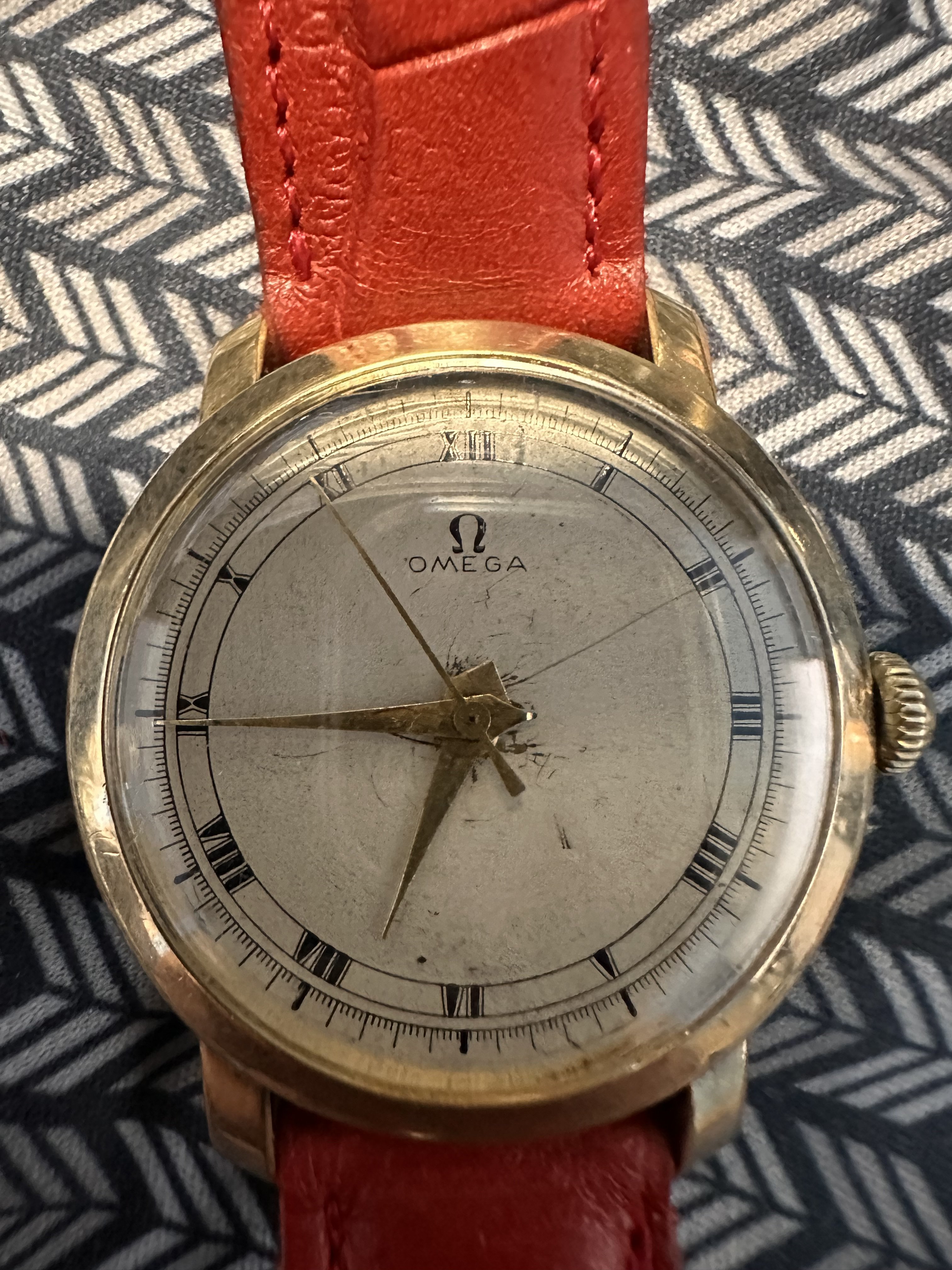 I have a watch that has a 30T2SC movement with serial number that puts it in 1944. The case is not appear to be Omega, no Omega marks. 10k gold filled. It has some stamped letters in script. Look like "SD", "LD", or something similar. The case has watchmaker's marks inside. The dial has scratches likely from when hands were removed. Is the dial a redial or original? Any information on the case? Did Omega send movements to the US and jewelers put in a case as a way around taxes? Due to war time and this looks like a civilian version, did cases switch? Any info would be appreciated, thanks.
