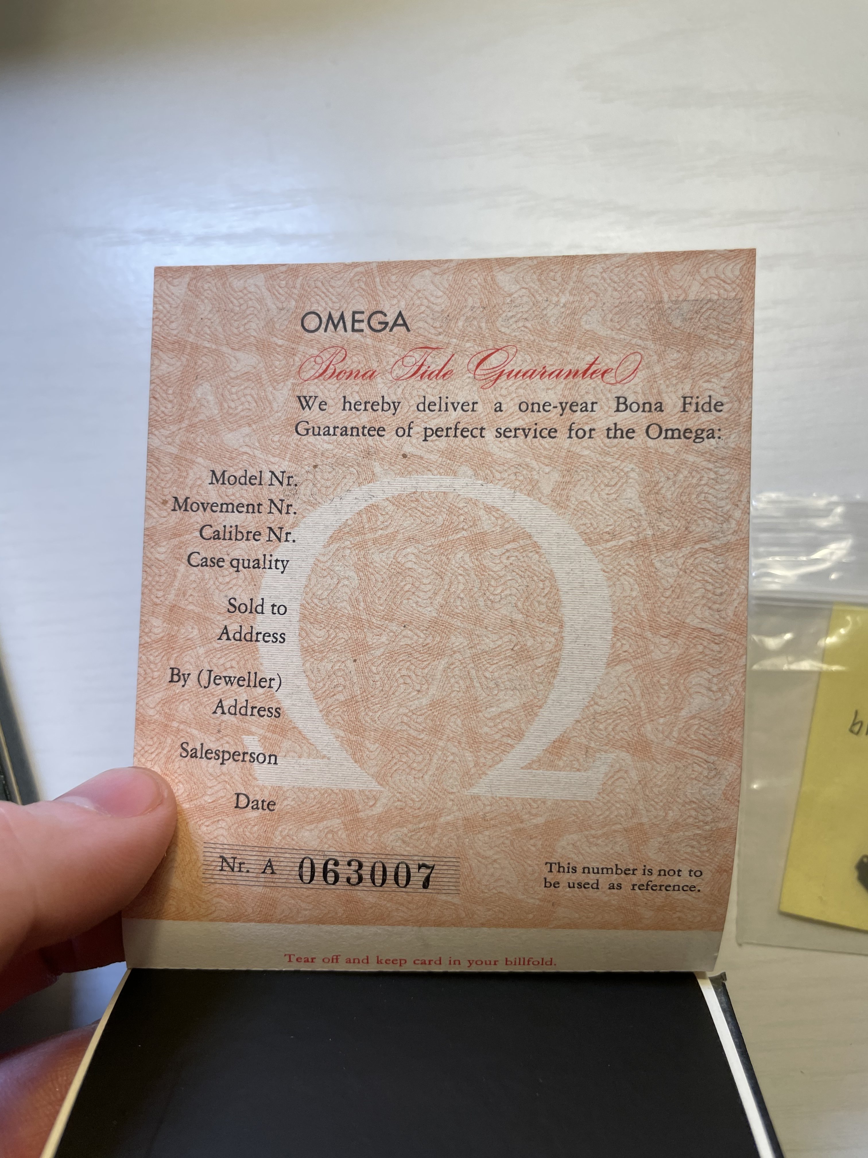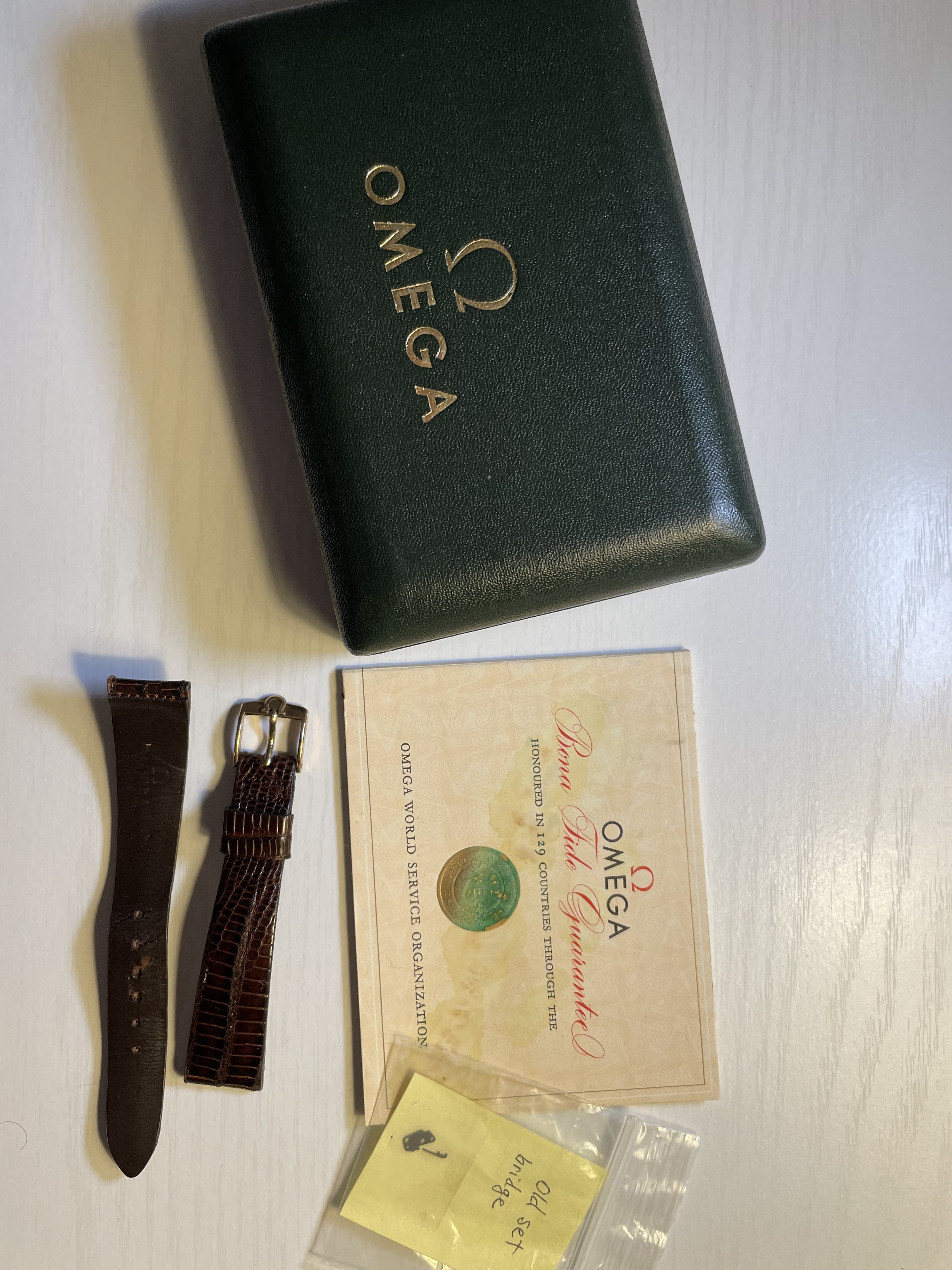 I have the box and papers, though the warranty paperwork was never filled out by the dealer. There is also an omega strap and buckle, but it is a 16mm strap even though the watch has 18mm lugs. I do not have a pic of the inside of the case back, but I do have the serial number written down somewhere.