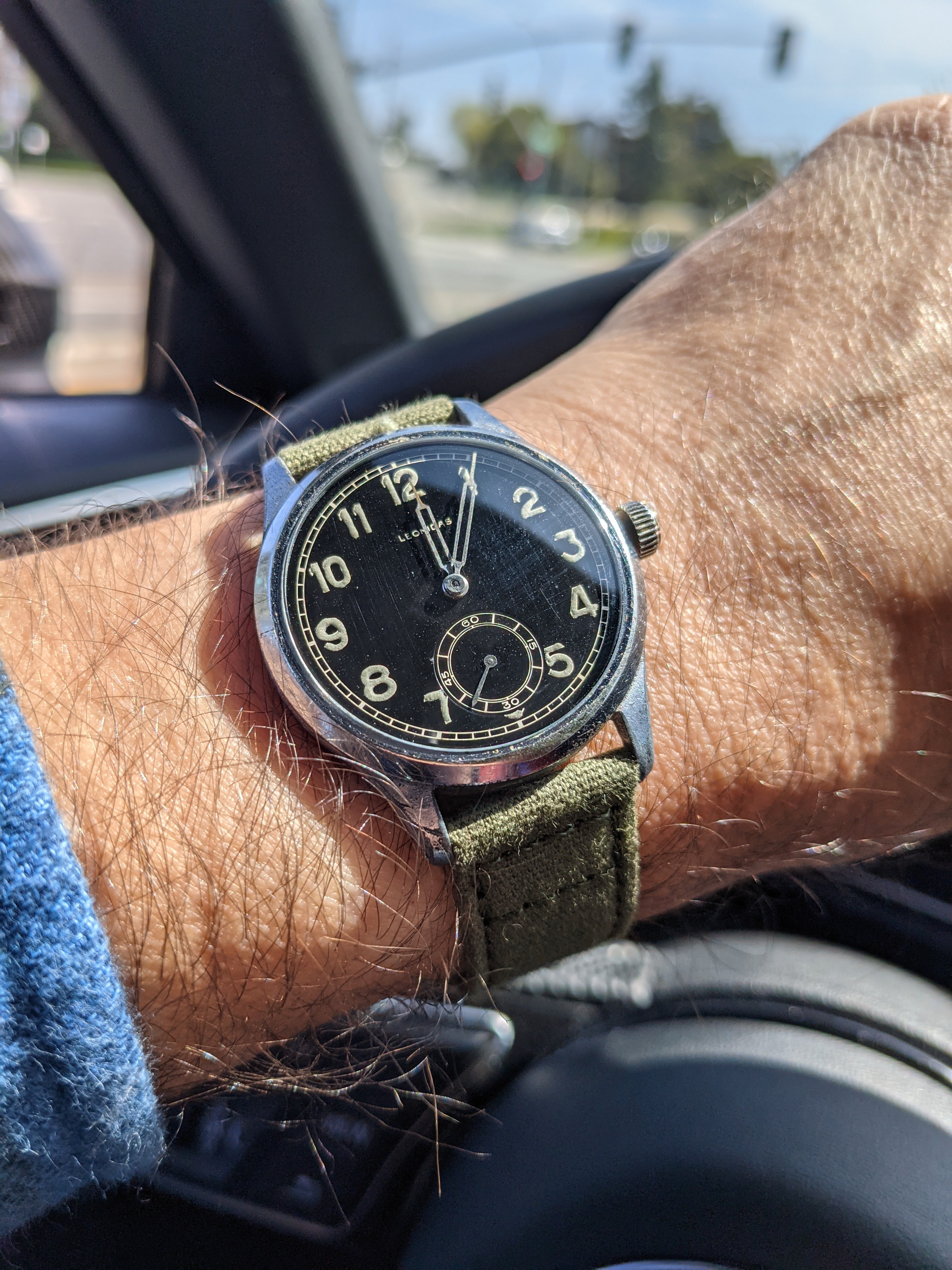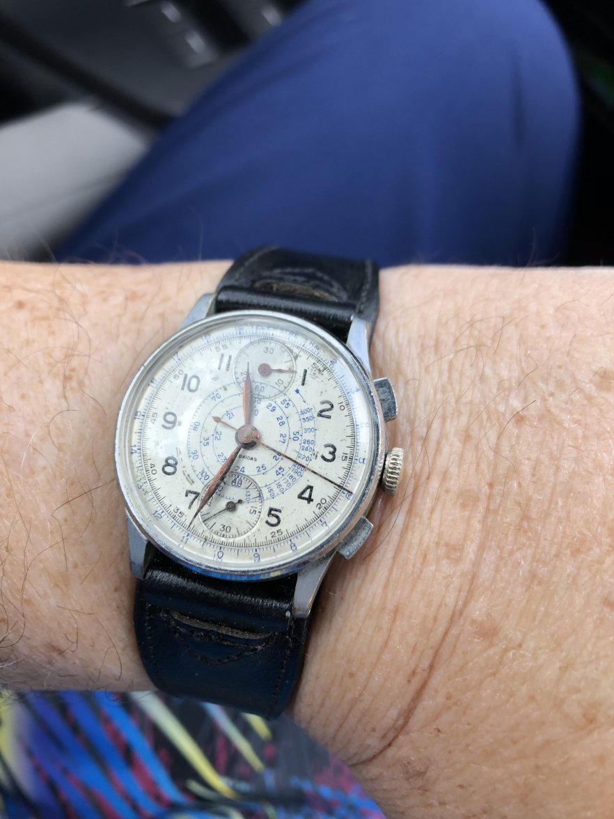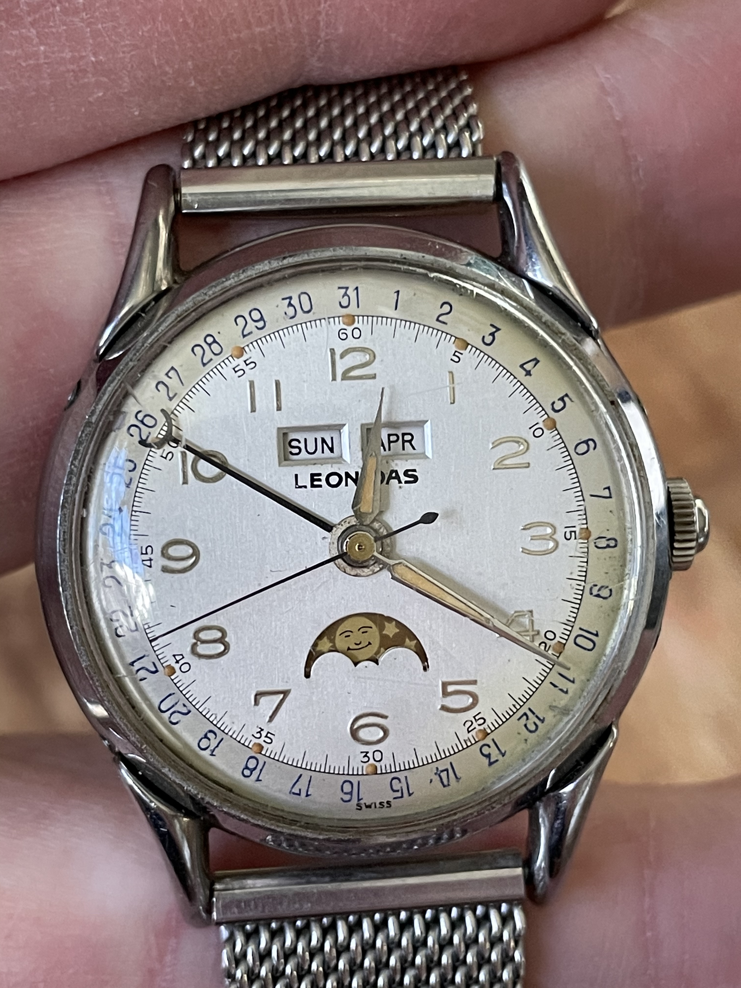 I ended up deciding a moonphase was it; I'm sure at some point he mentioned particularly liking them. I got a Leonidas in gorgeous, nonworking shape, and then had to find a watchmaker locally, since obviously I couldn't send it to my dad. At some point while waiting for the watch to be fixed, I ended up bidding on *another* Leonidas moonphase, and figured that I'd never get it at the price I entered (I think a few hundred dollars). It's still one of my favorites, and one of the very few never-to-be-sold watches I own.