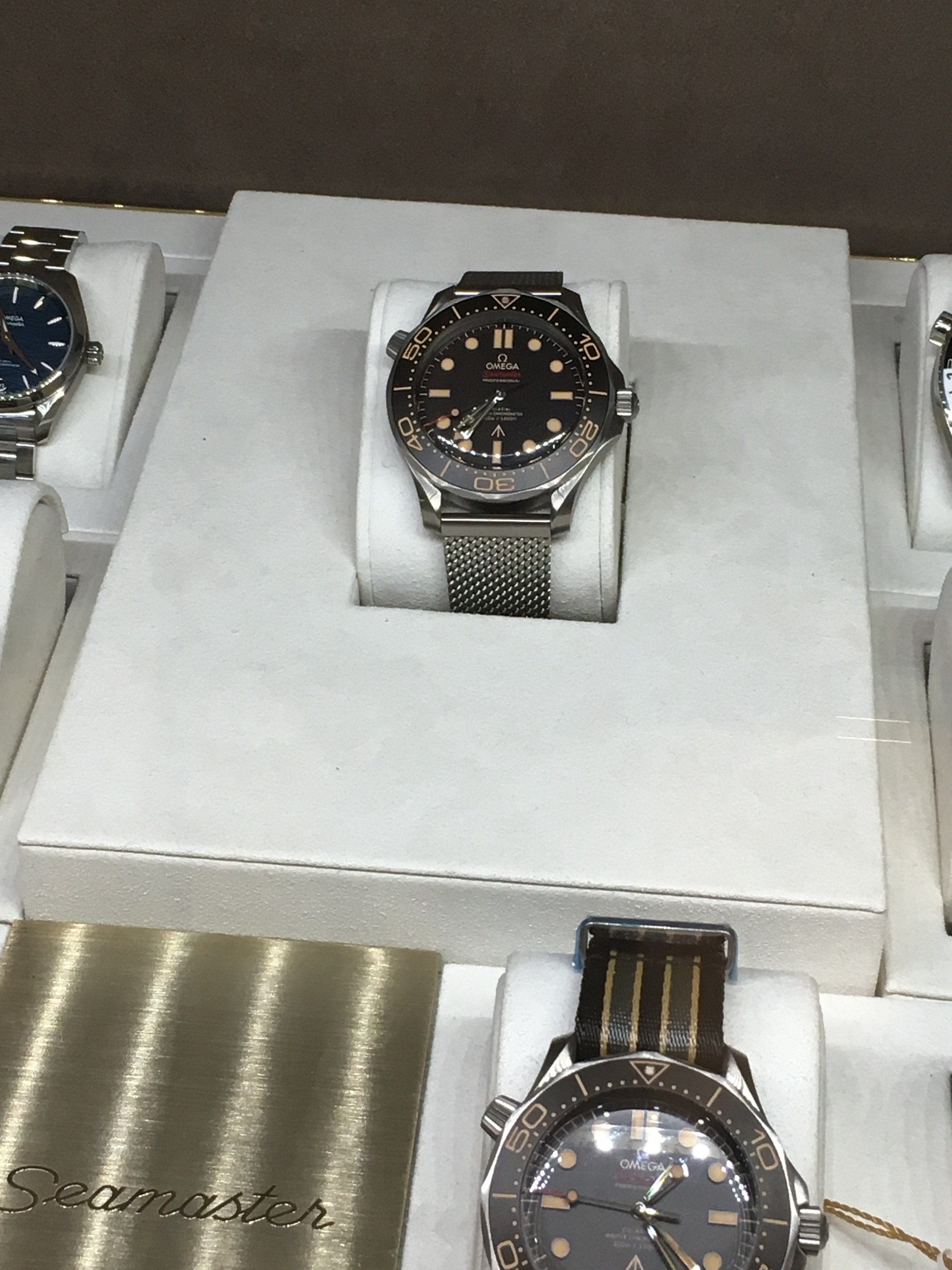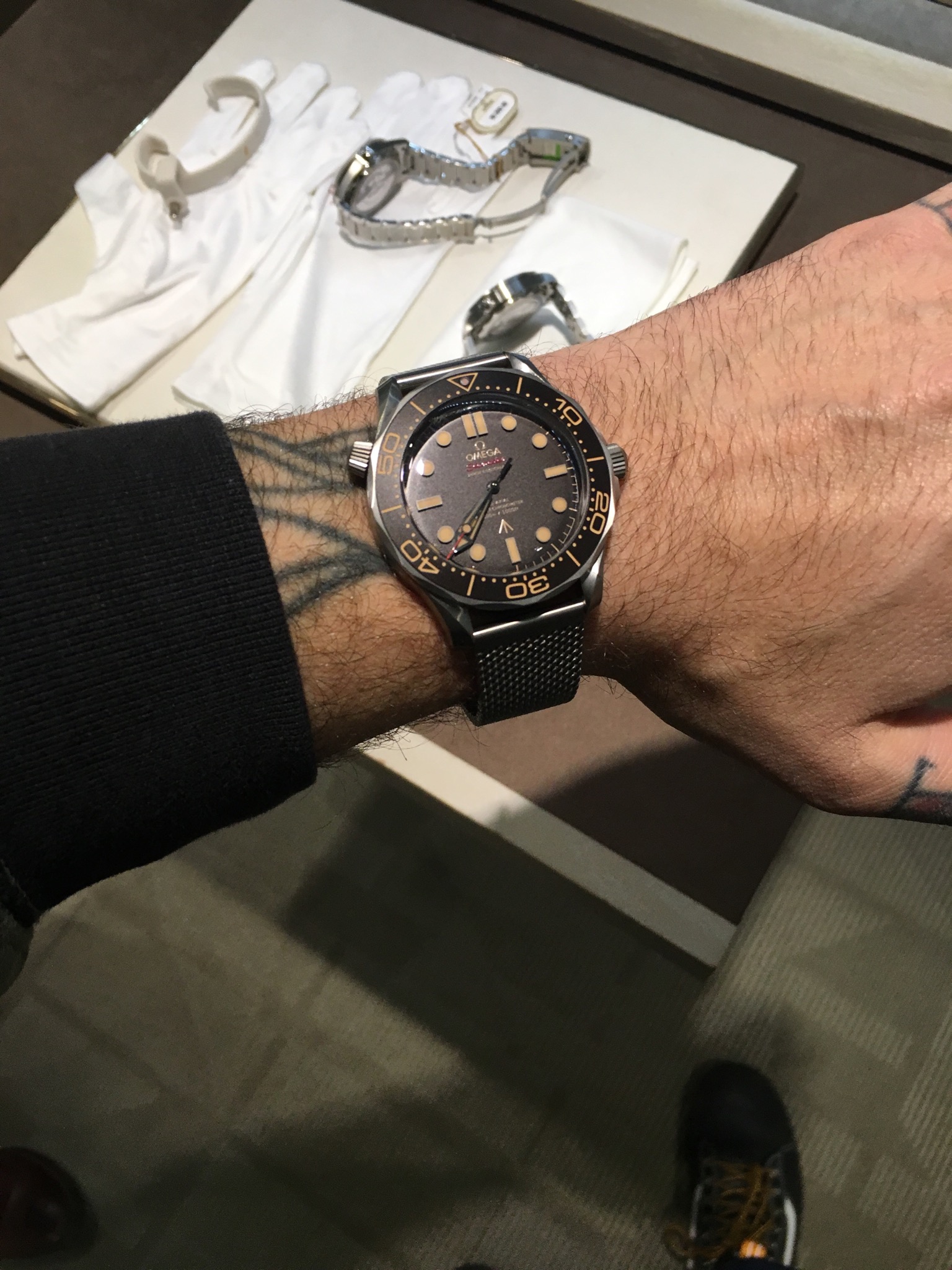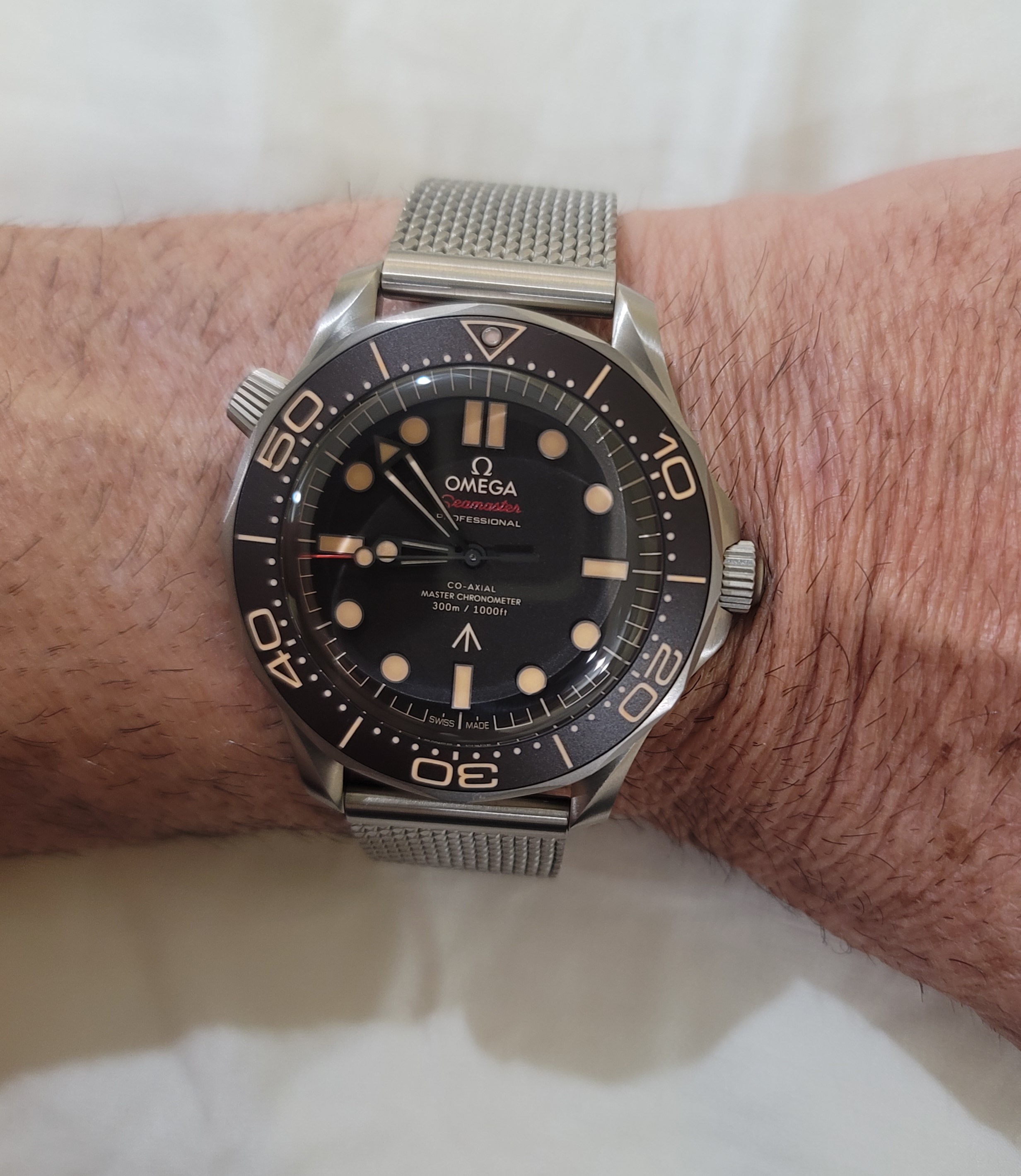 Just picked one up yesterday from my AD. Love it ! The bracelet reminds me of my dad's old watch he owned with a simlar mesh bracelet. Between the tropical dial, beige markers and mesh bracelet you feel like your wearing a vintage watch, fresh from a time capsule. I've always been a 007 fan, but glad they put the markings on the case back and not the dial. Omega hit a home run on this one.