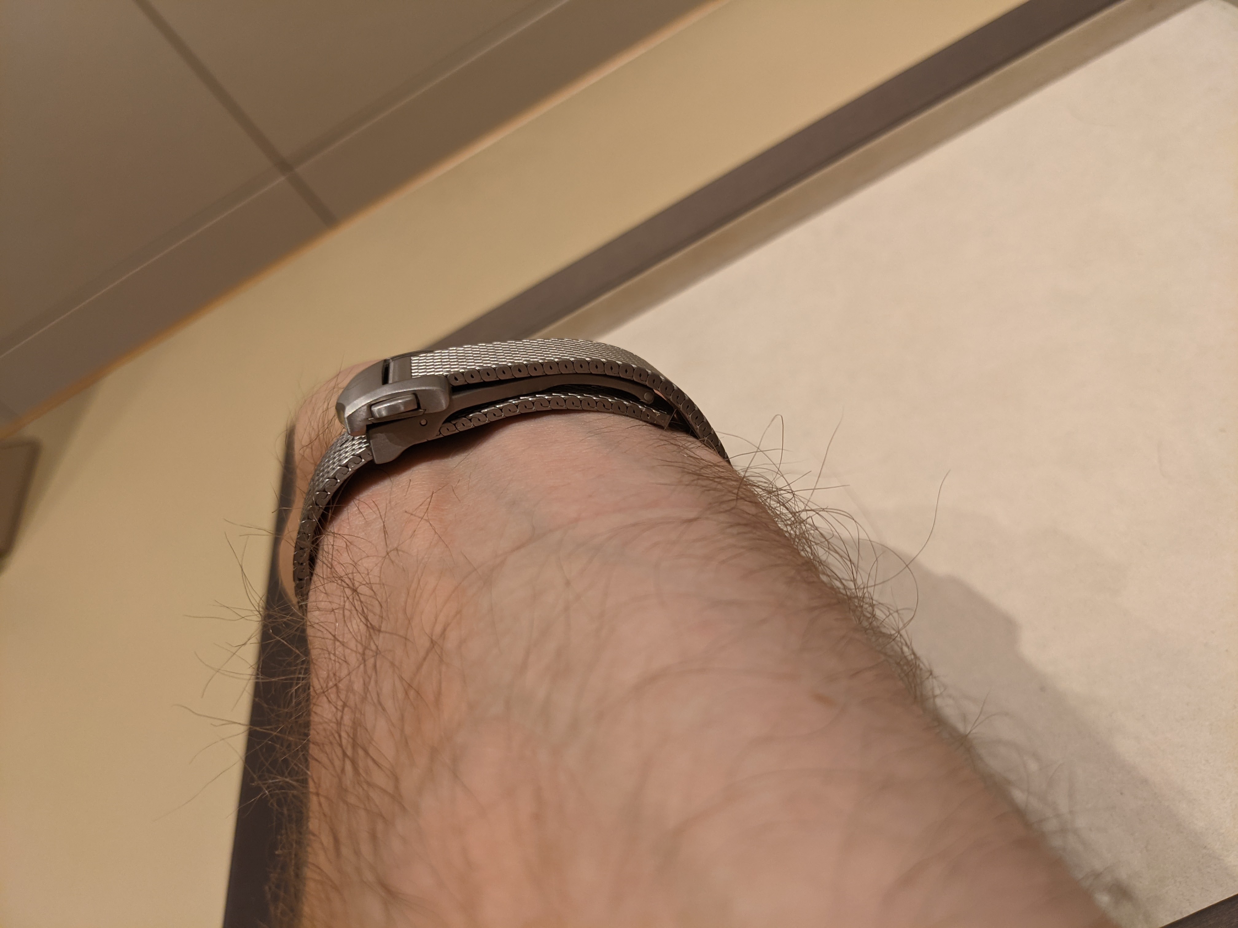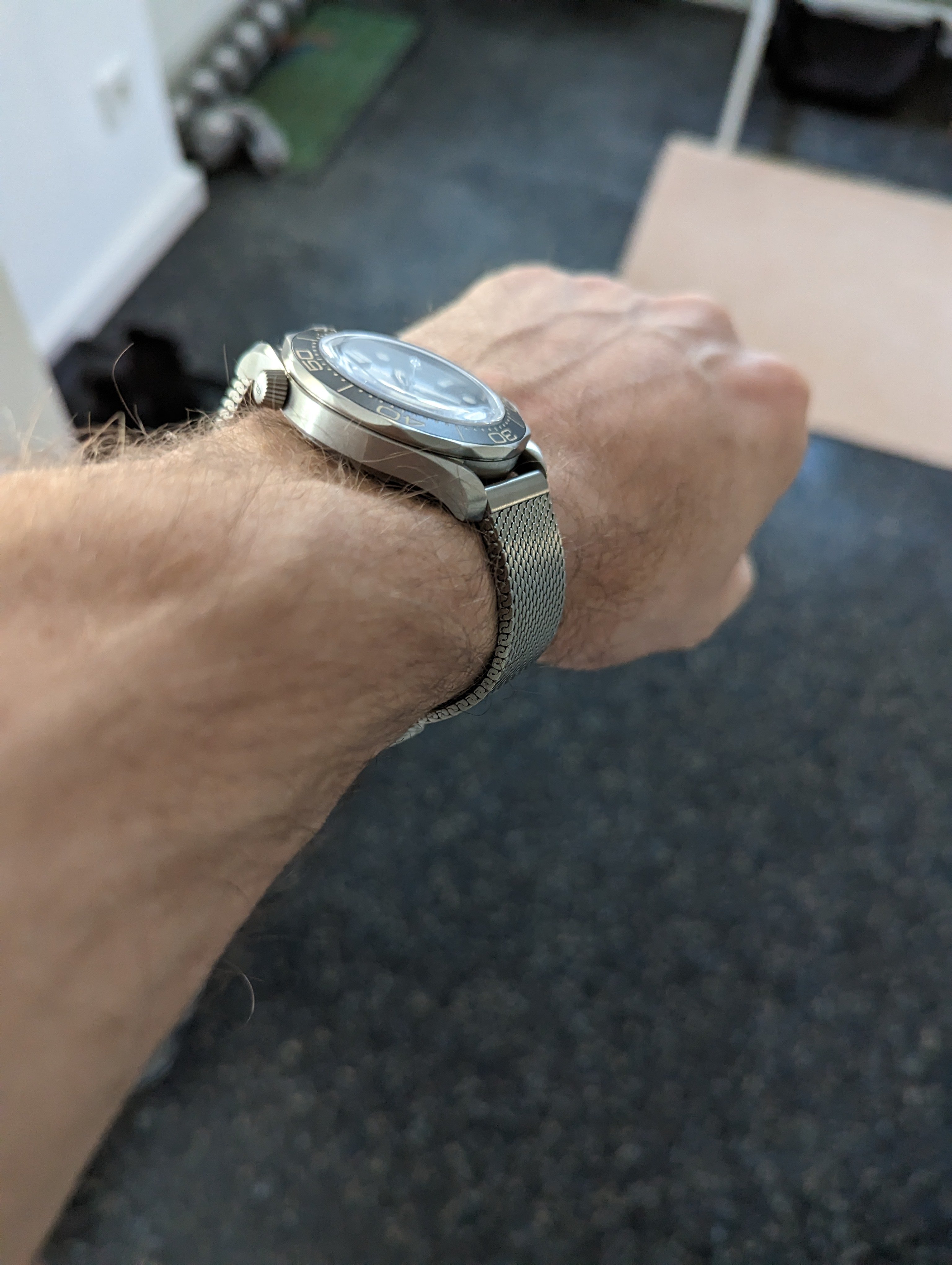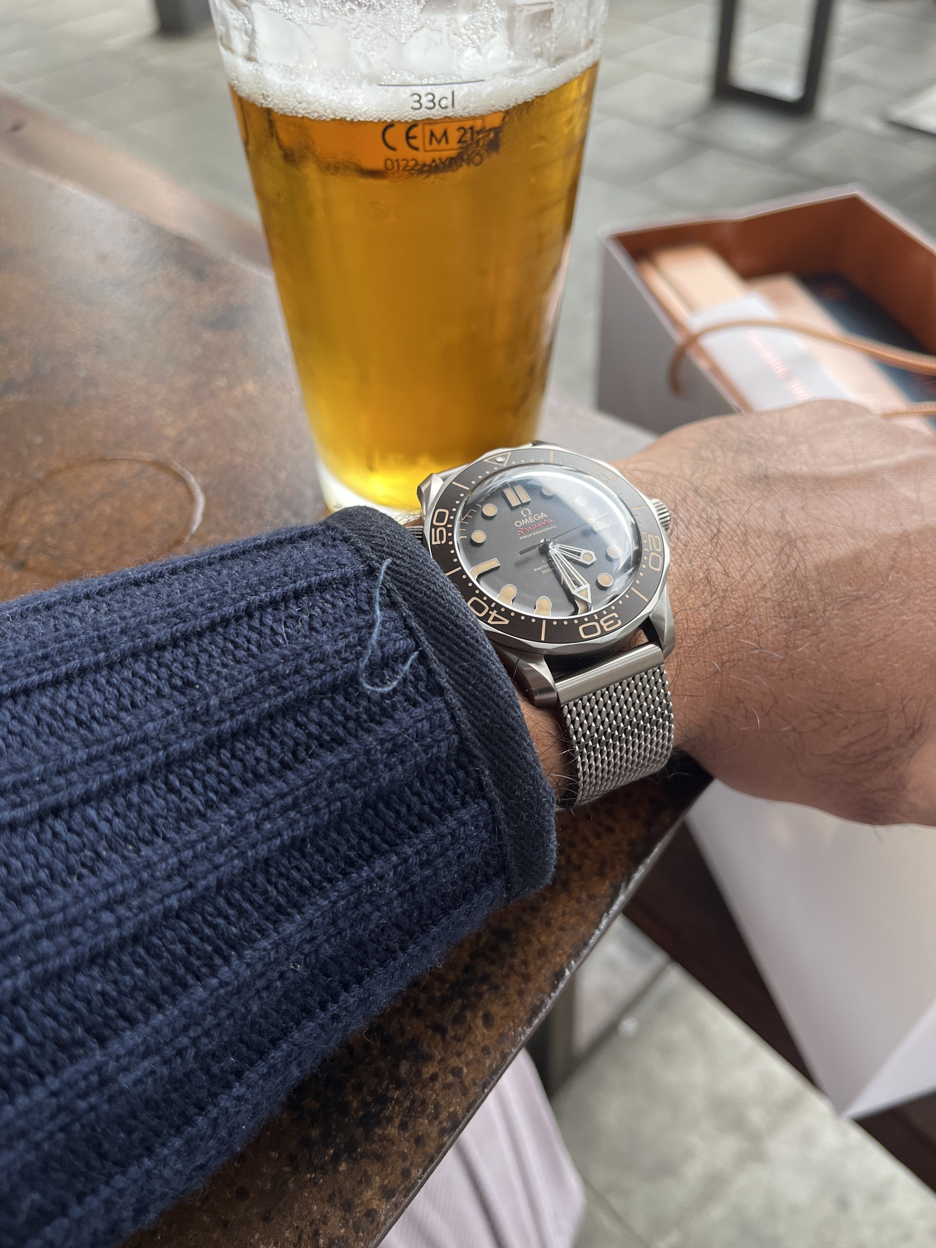 Just picked one up yesterday from my AD. Love it ! The bracelet reminds me of my dad's old watch he owned with a simlar mesh bracelet. Between the tropical dial, beige markers and mesh bracelet you feel like your wearing a vintage watch, fresh from a time capsule. I've always been a 007 fan, but glad they put the markings on the case back and not the dial. Omega hit a home run on this one.