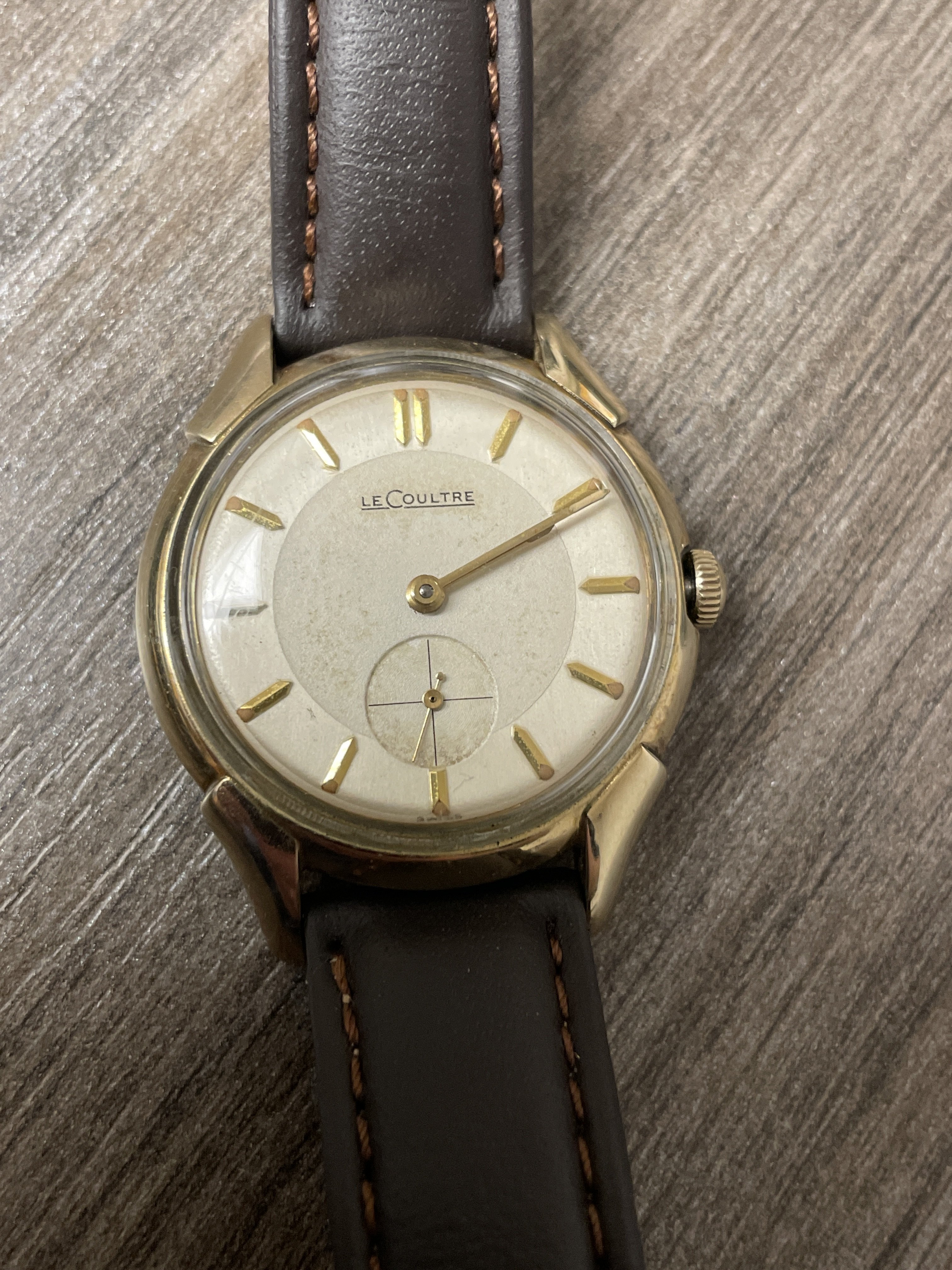 Took a little stroll down a street known for bad happenings. So many cops driving by I started feeling like I was doin something wrong but I was on my way to a watch shop in the 700’s (number of the street. At around 500 I realized it was going to be past my lunch break and I wouldn’t make it but saw this little shop that had some omegas and this LeCoultre. It’s a Spanish neighborhood the watchmaker didn’t speak fluent English but I think this is legit, movement was properly marked but then again I know nothing about LeCoultre so it could be a redialed POS but I like the lugs, back a bit scratched up.