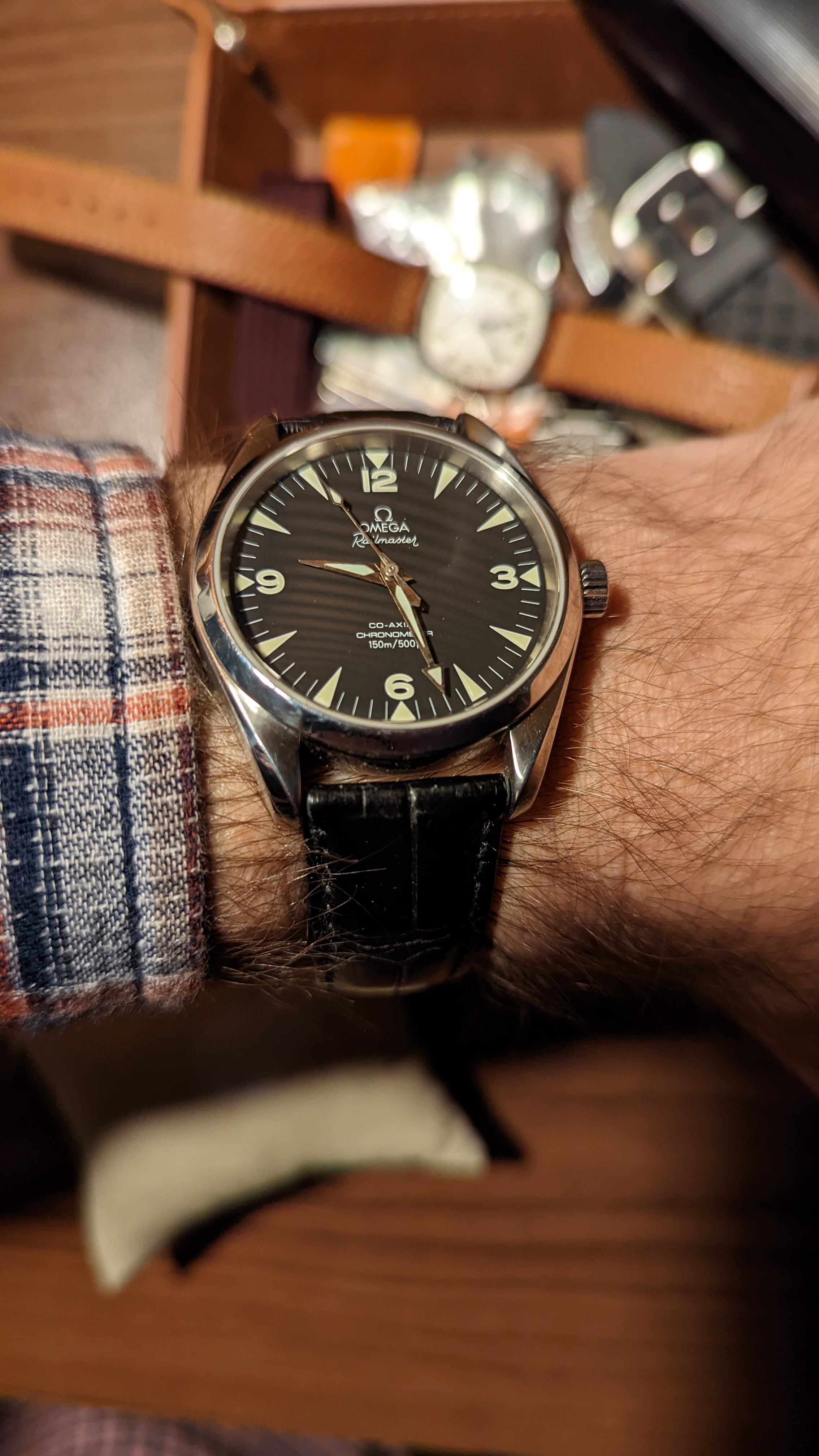 Mine originally had the brown croc leather strap with deployant, but as of the other day it's on it's second calf leather pin buckle strap, with this new one being a fau black croc that's matte with white stitching and it looks better than it ever has in it's life since 2005.