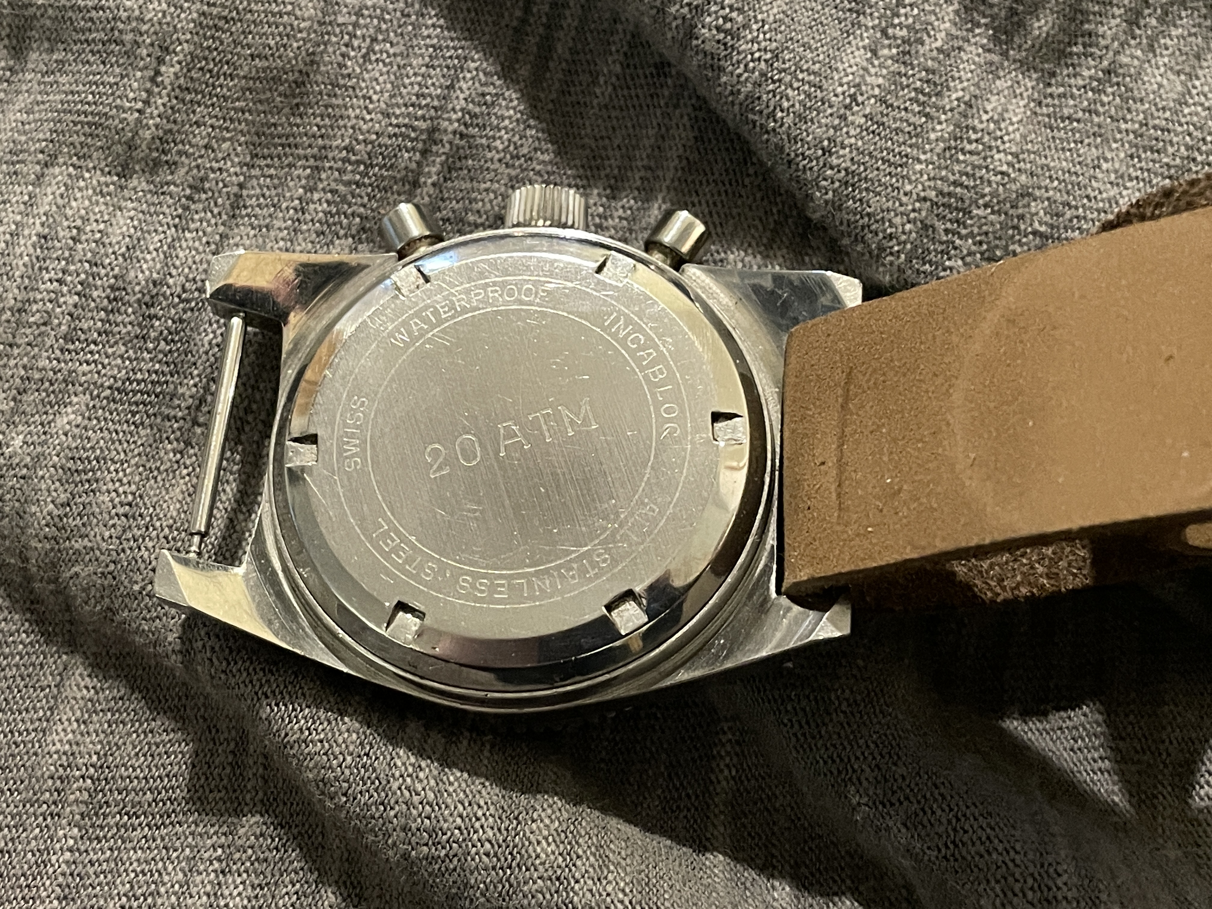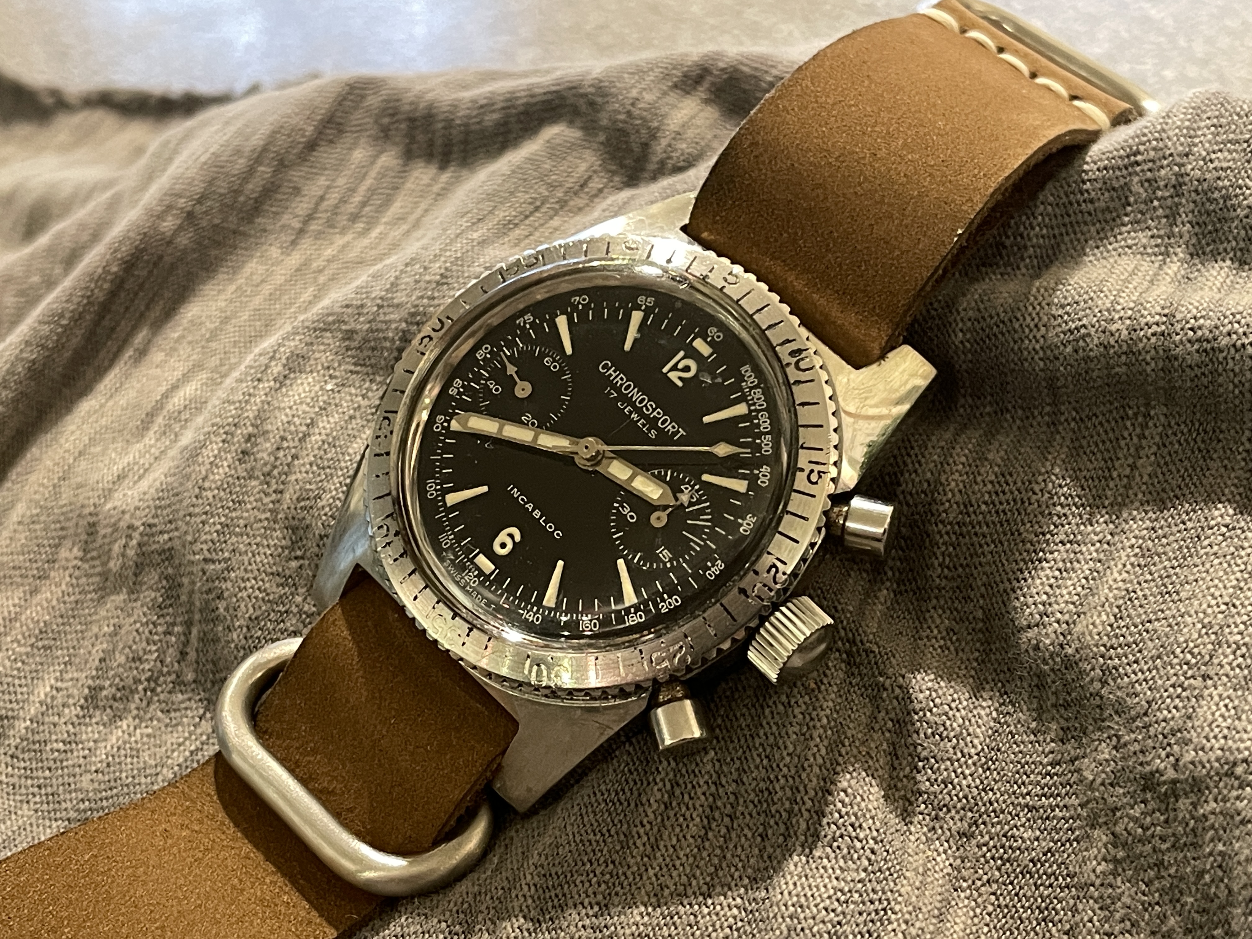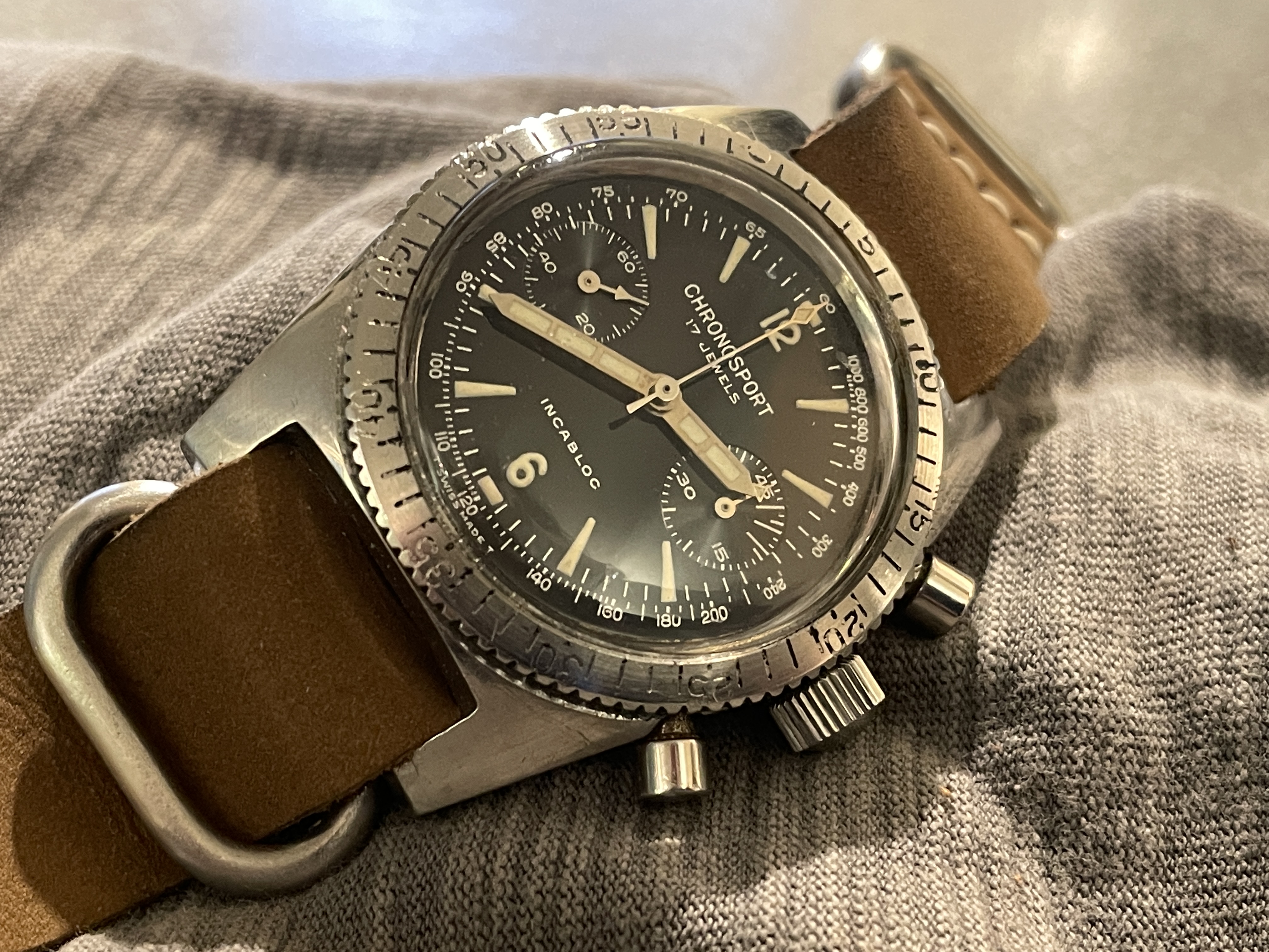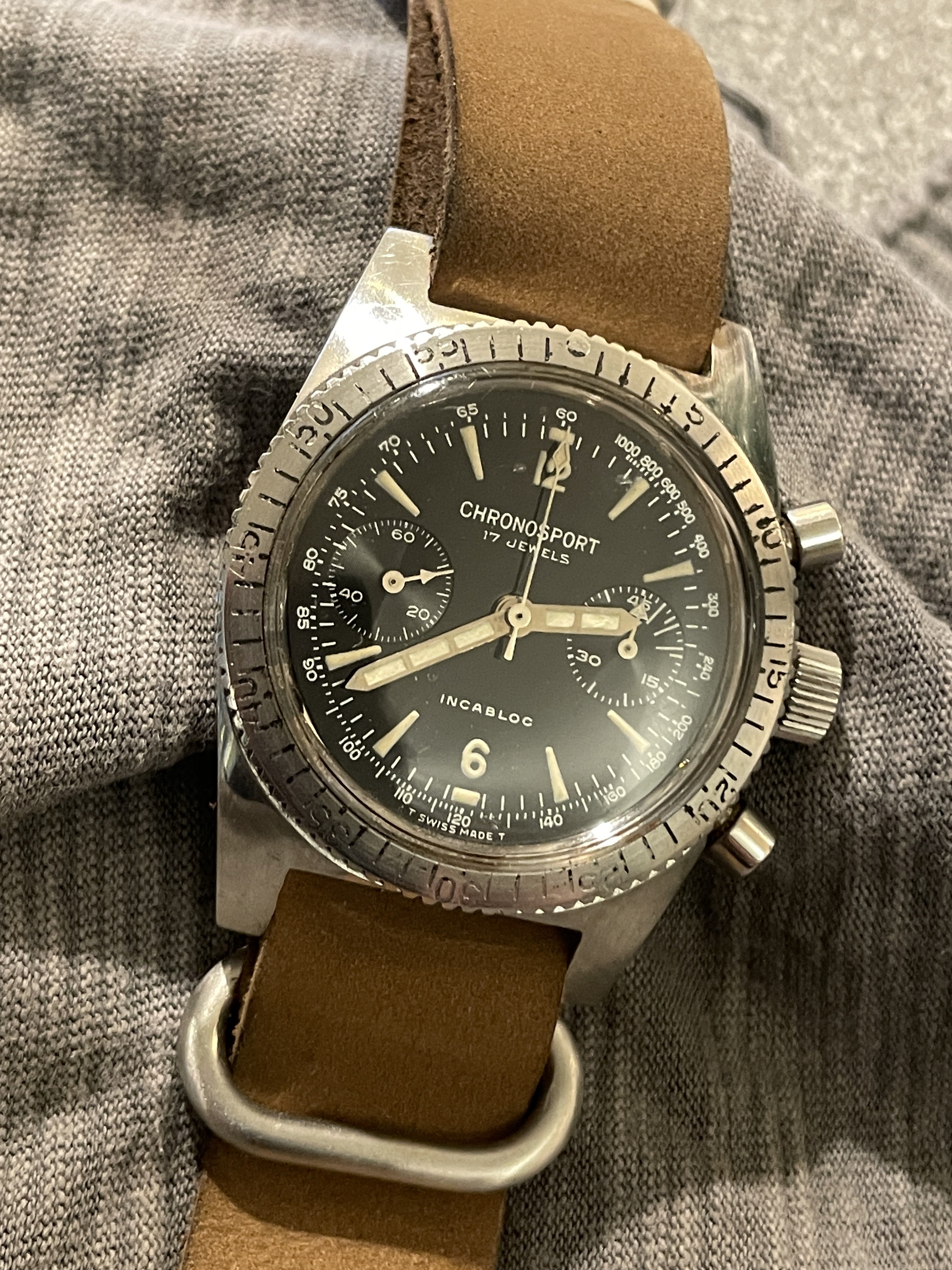·I have just got myself another Chronosport chronograph bought slightly blind at an auction. This was a very nice surprise as it looks much better in the flesh than in the single picture (with no condition info) of the listing. It is in great condition except for the pushers that were jammed and a basic service was all that was required. The dial & hands are particularly nice, with crisp lettering and a golden glow to the hands (nickel plated?) at certain angles. The Landeron 248 is very smooth and show great specs on the Timegrapher. My other Chronosport has a Valjoux 7734 and the aeroplane logo. This one has no logo on the dial. I guess this one is slightly older. Would it be one of the Sinn ownership period watches?