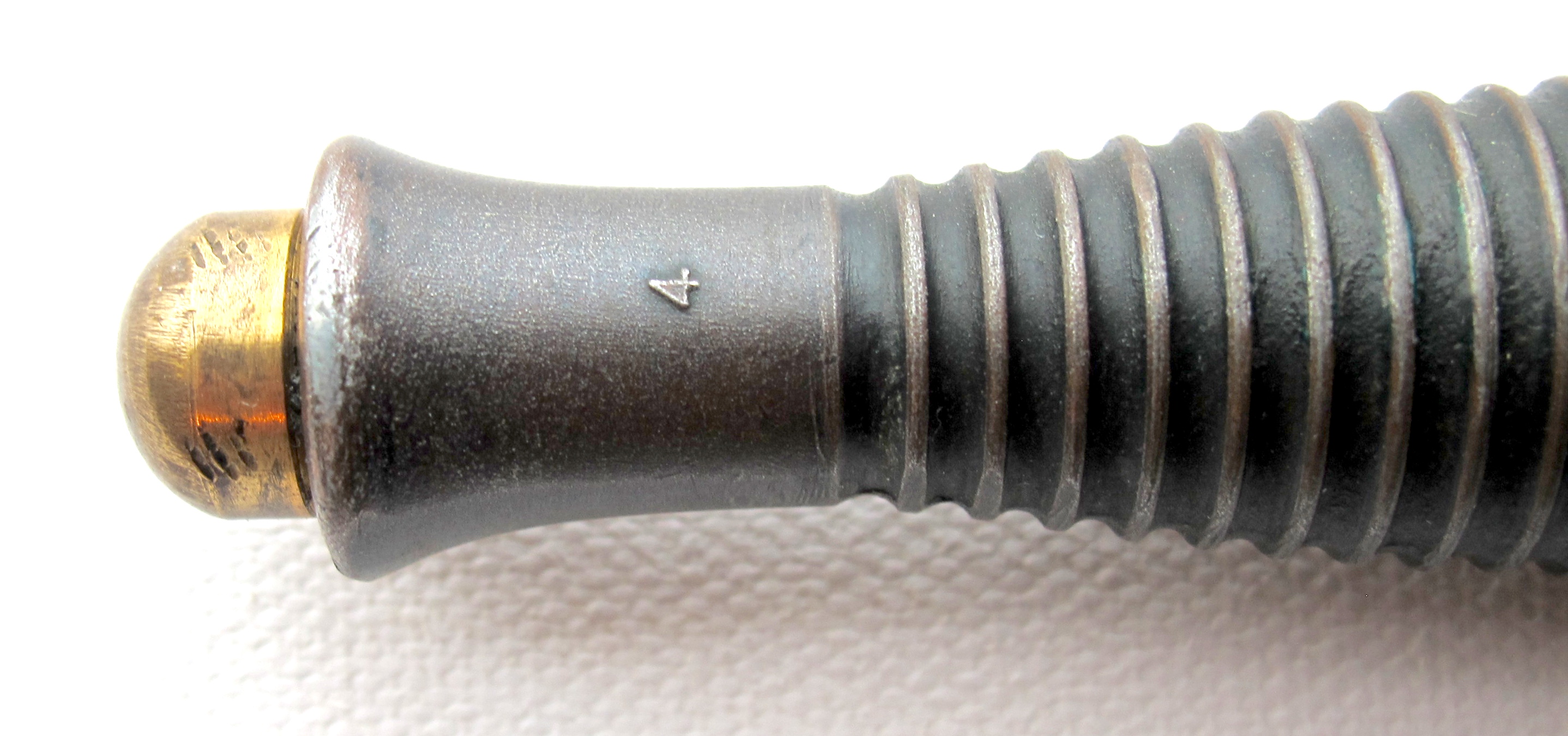 4 cast into the grip near the pommel confirms this knife as WWII manufactured, as wartime moulds were numbered in batches 1 to 4, believed to indicate which of four contracting firms had supplied them. The moulds were destroyed at war’s end.