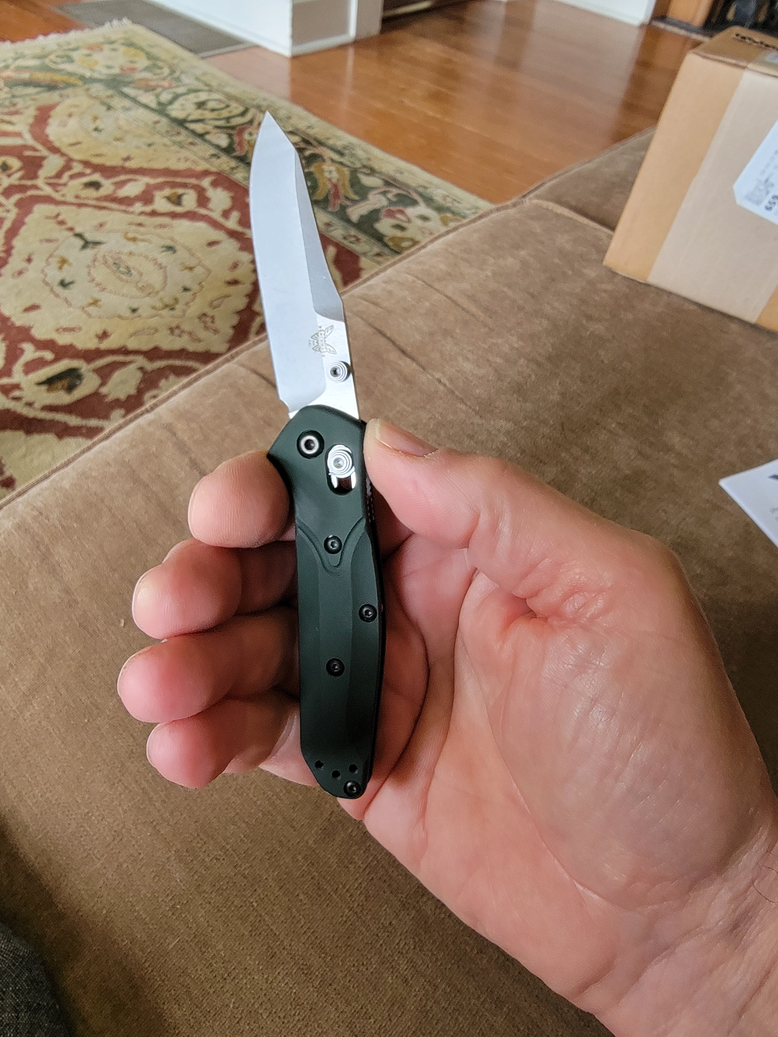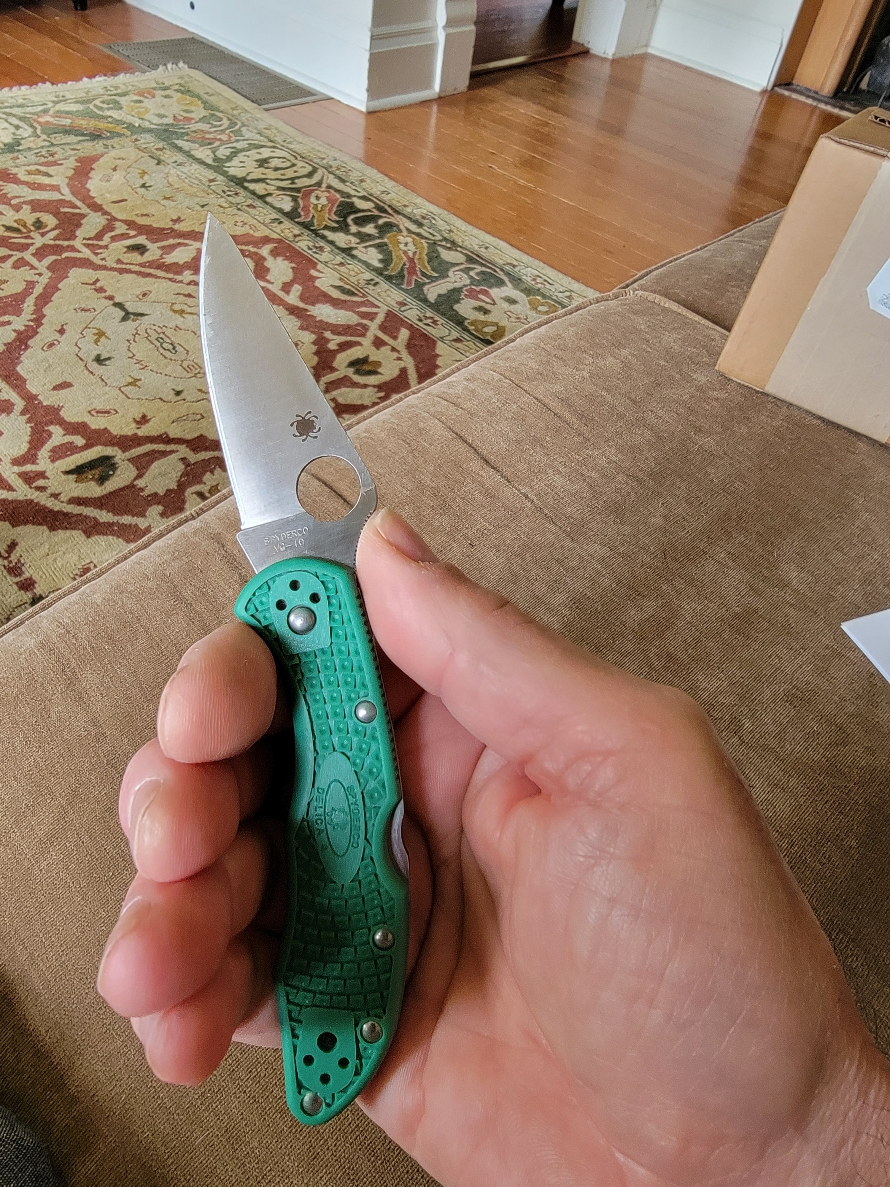 I like it. The handle has a sort of suede texture. It's slightly less long, which is noticeable when opening one handed. The size is less noticeable in the pocket though. It can be opened one handed but isn't as fast to pop open as the Spyderco, which is fun to flick open. But this mini Osborne is easier to close one handed than the Spyderco, which I have to be more conscious of keeping my fingers out of the way. Closing the Osborne seems more ergo, that is a natural feeling. It also feels more "refined" snapping shut. Like it's softer and more controlled. It is even quieter closing. The Spyderco has a satisfying metallic click when it snaps shut. Not that one is better than the other but they are different.