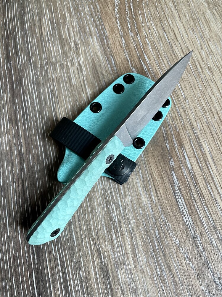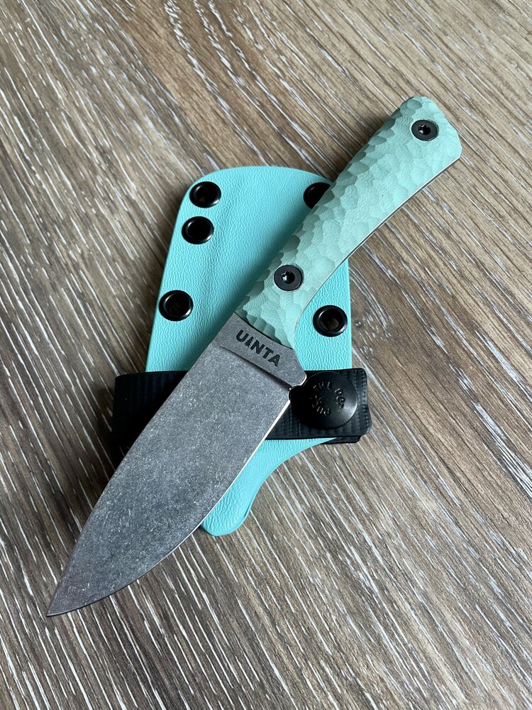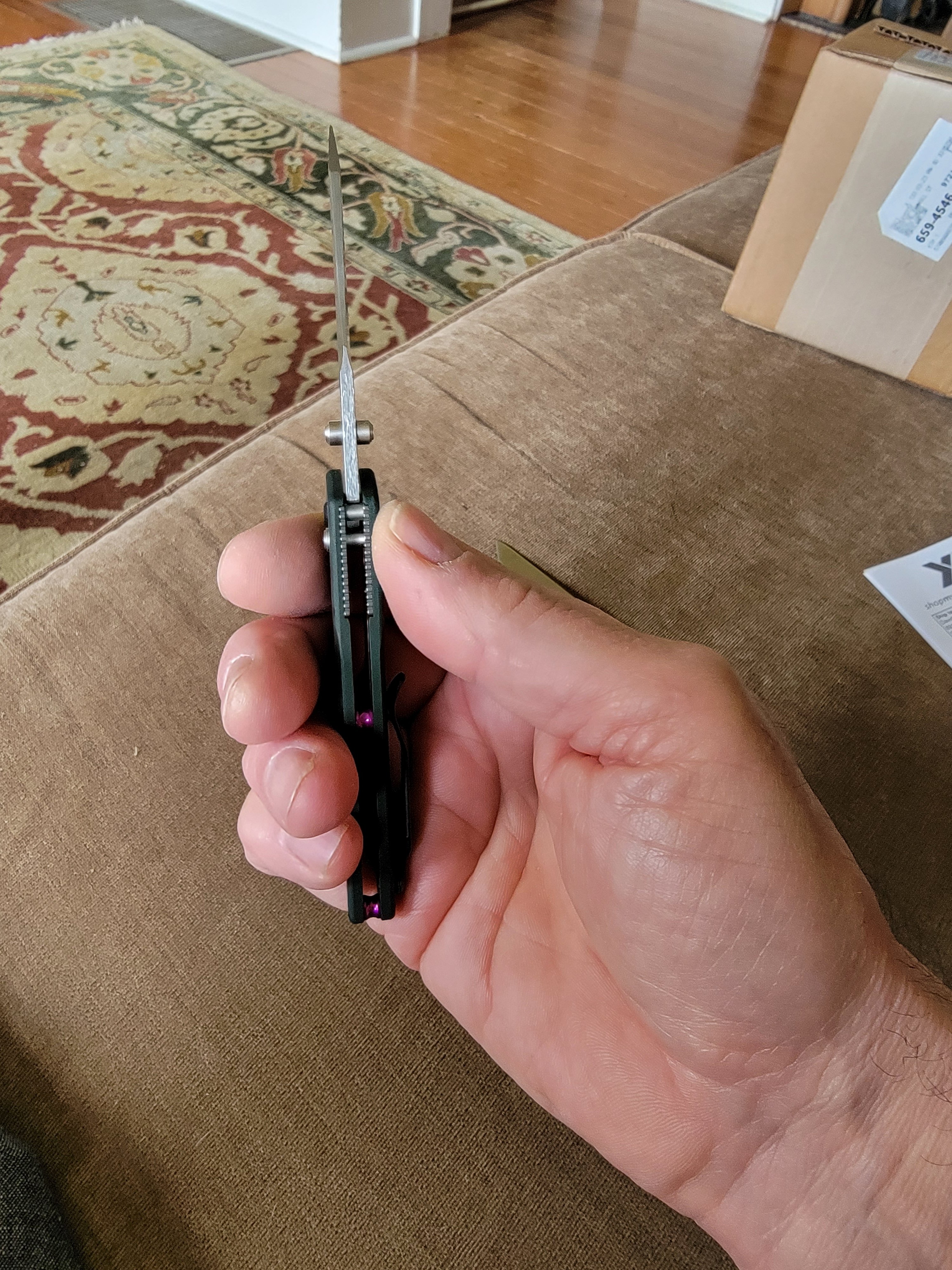 It's a nice looking and feeling knife. The darker green is very attractive and I like the little purple accents.