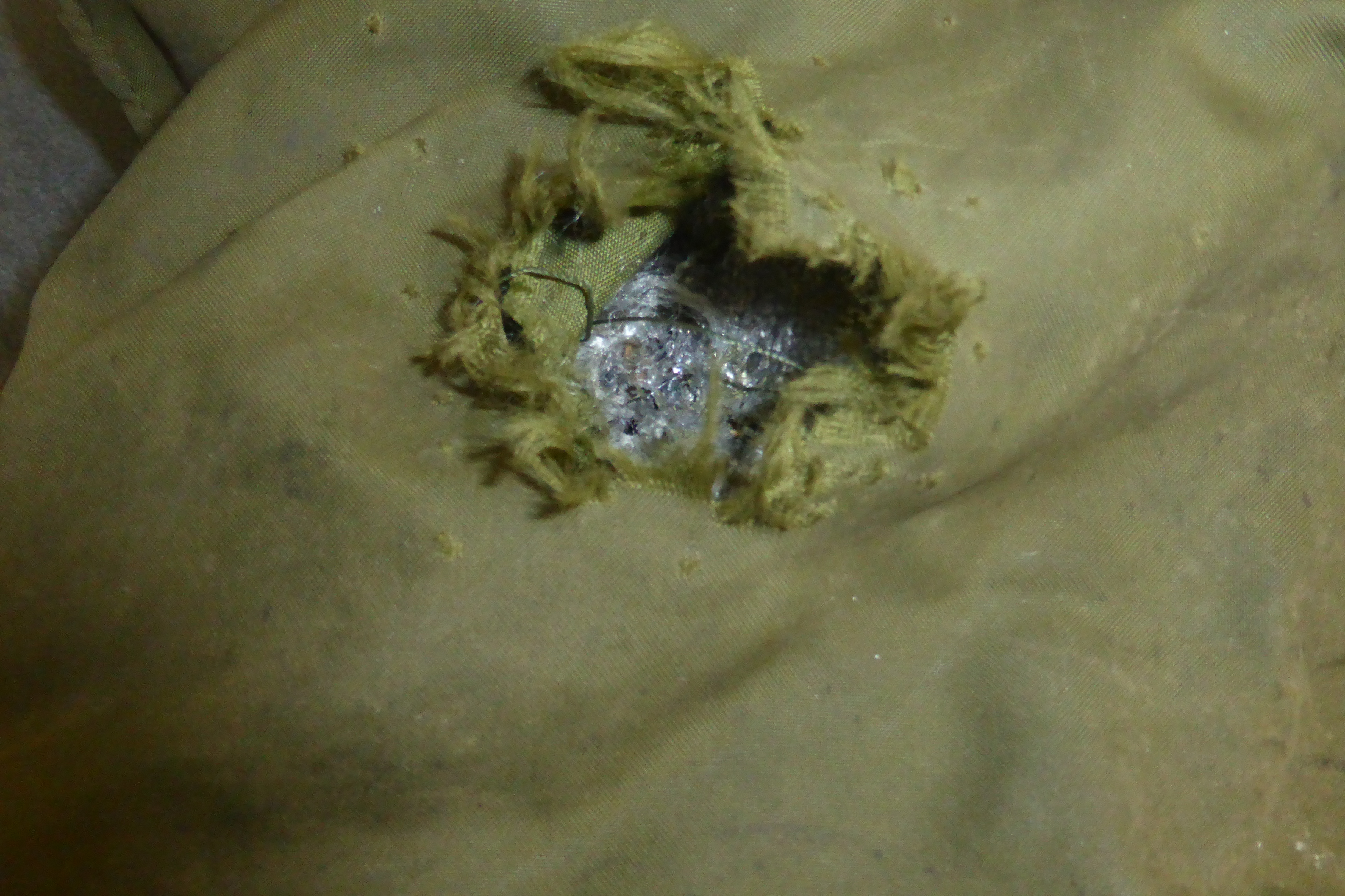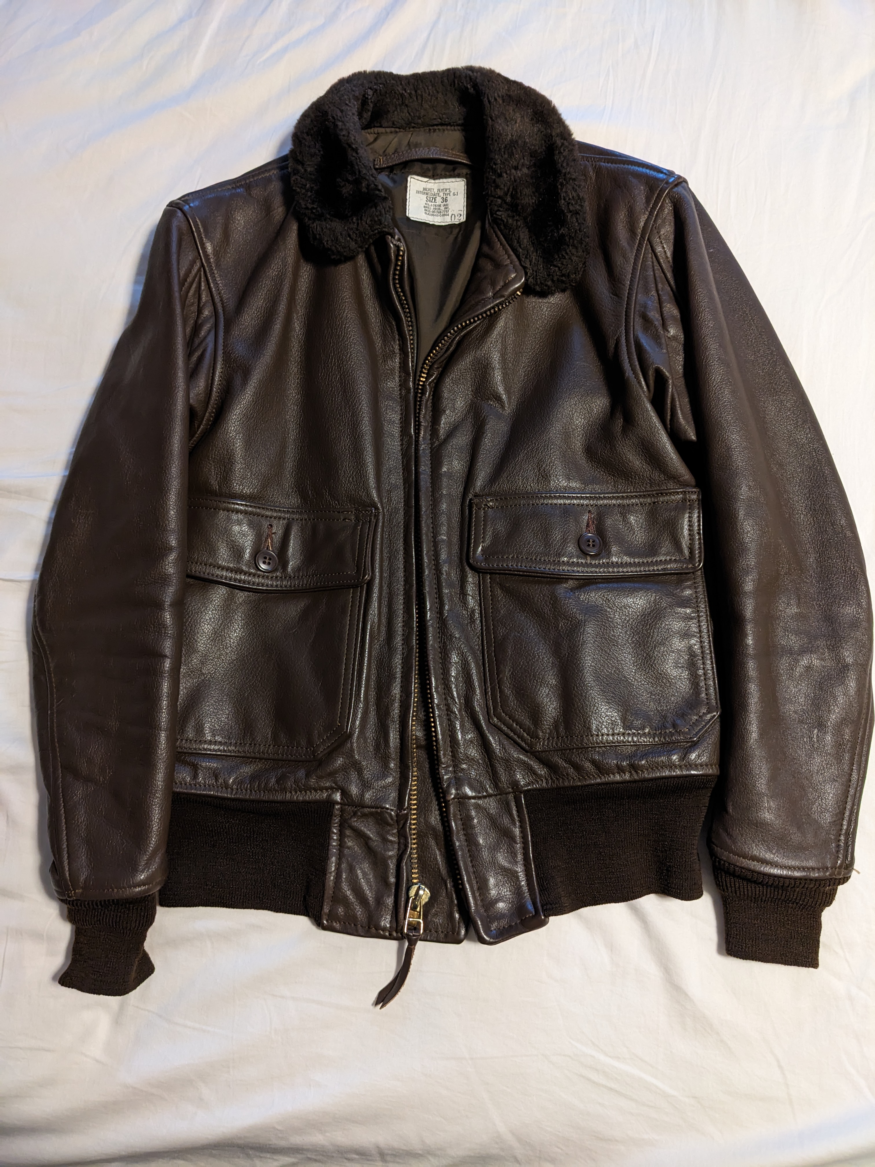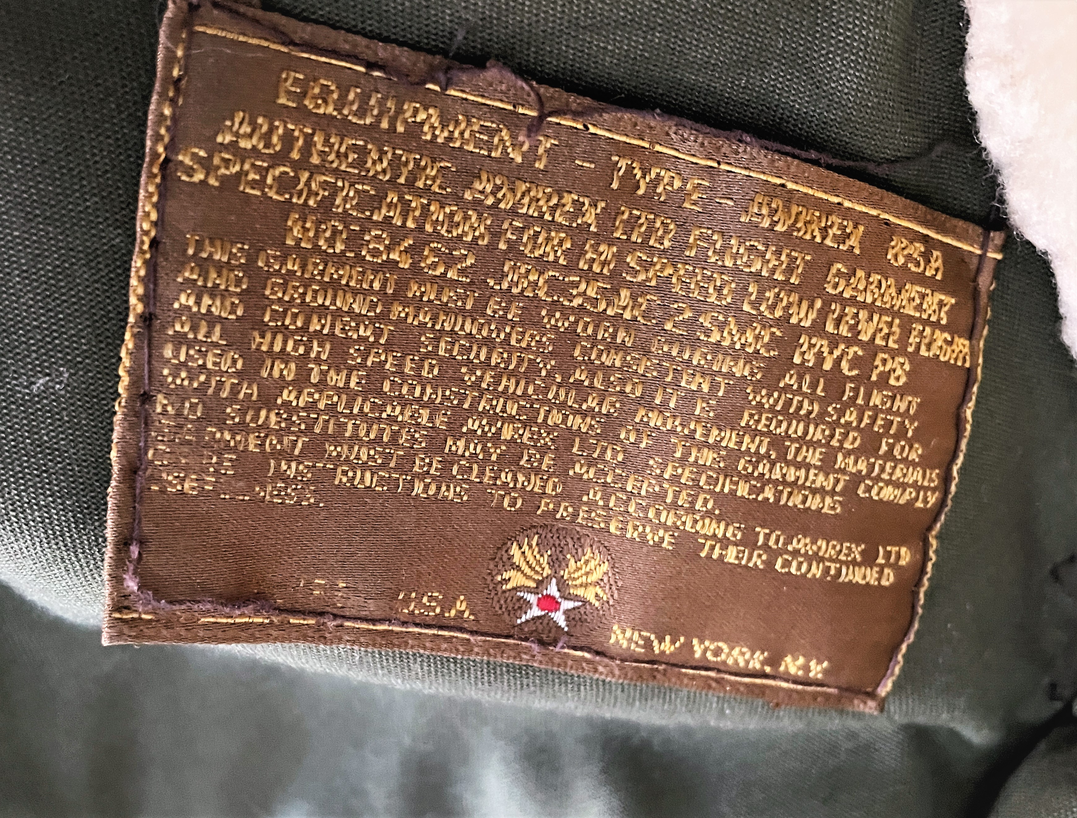 - Bottom picture shows the spec tag found inside the jacket's left hand pocket, stating the contract date for the jacket.
