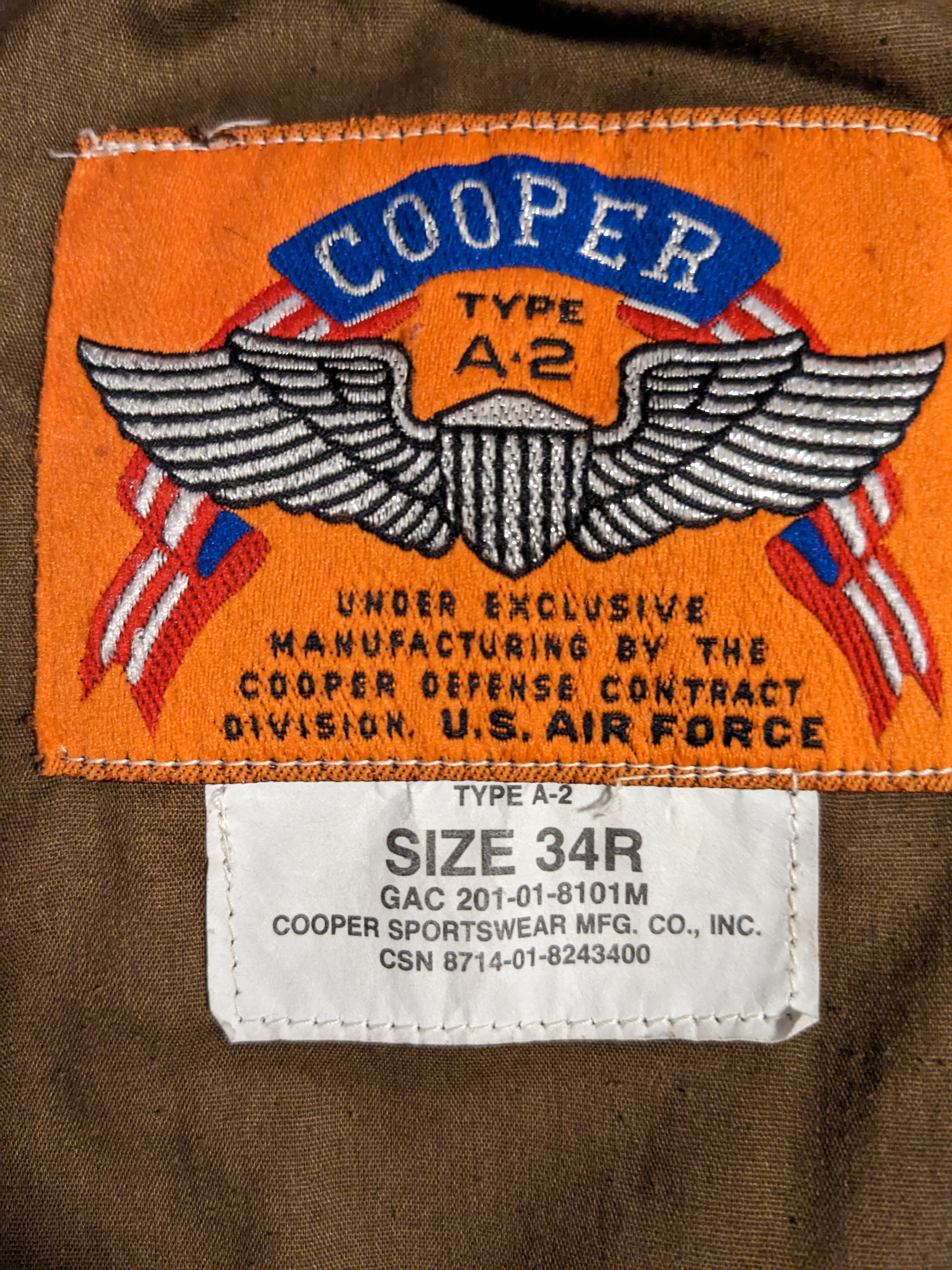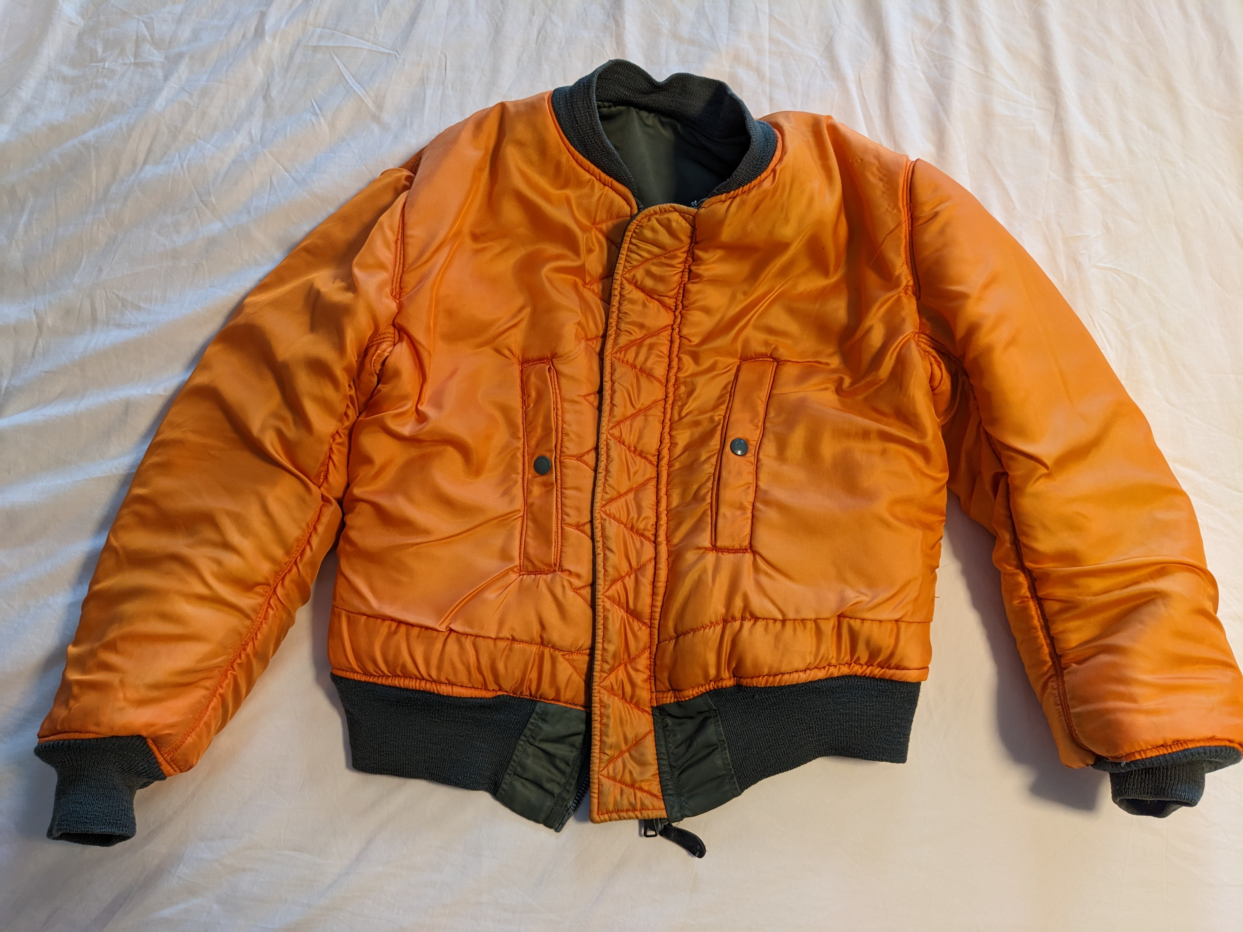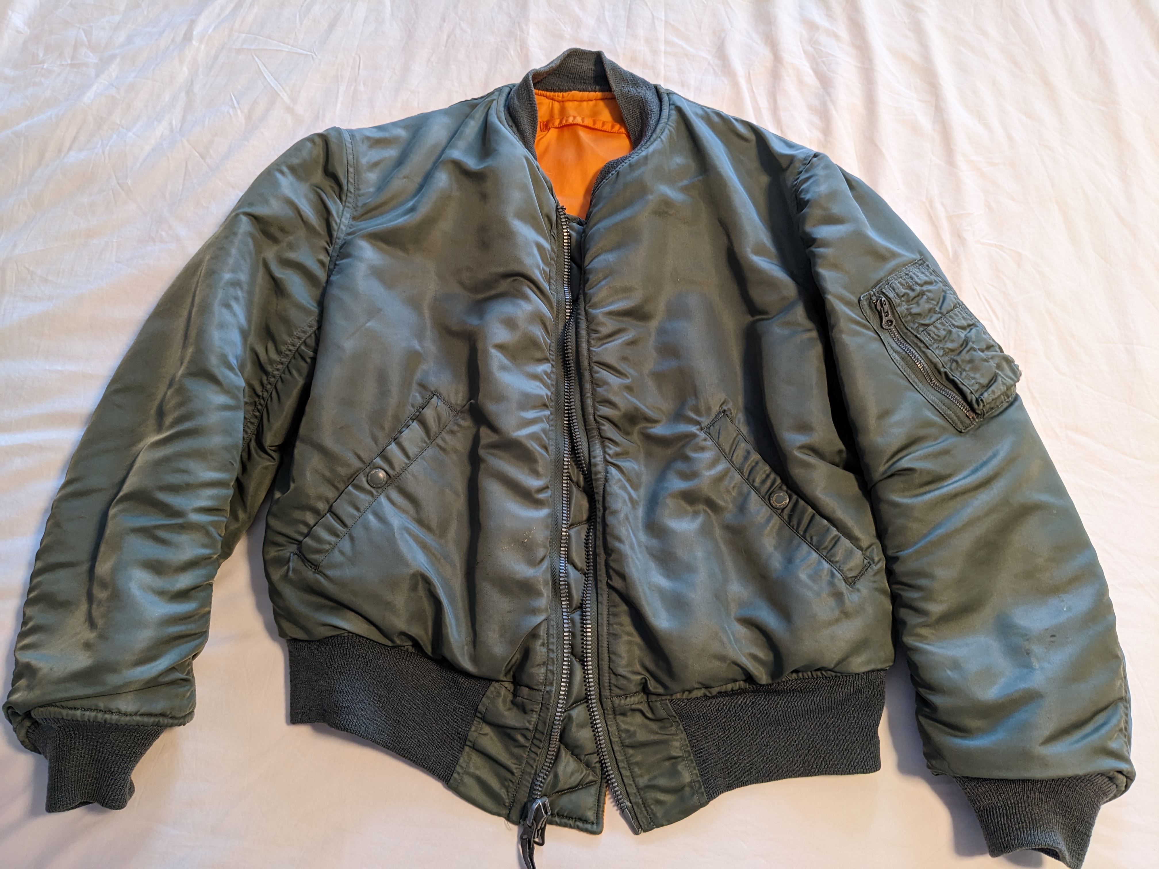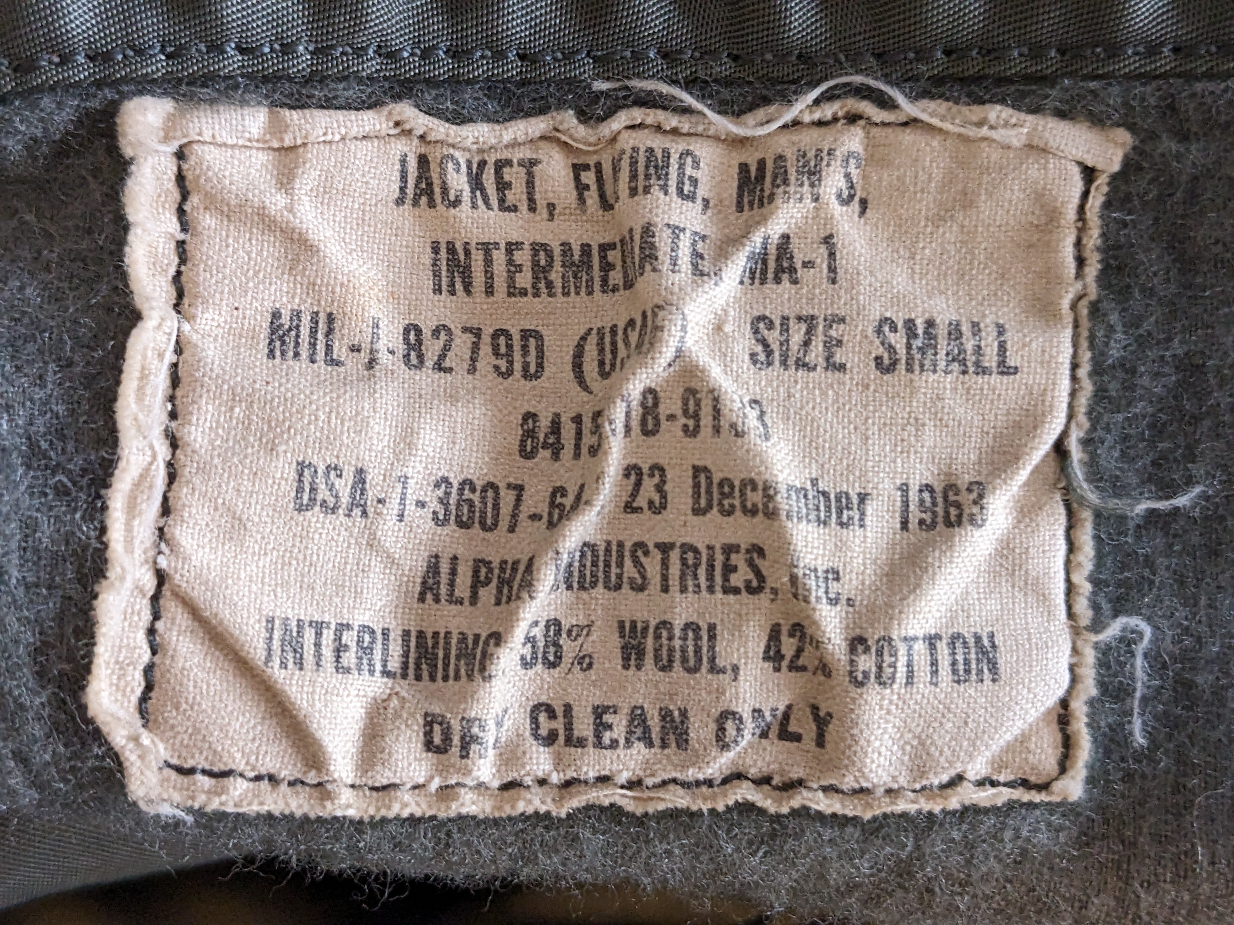 - The interlining material is wool/cotton compared to the polyester used in the more modern iterations of the MA-1, making this jacket much thicker and heavier.