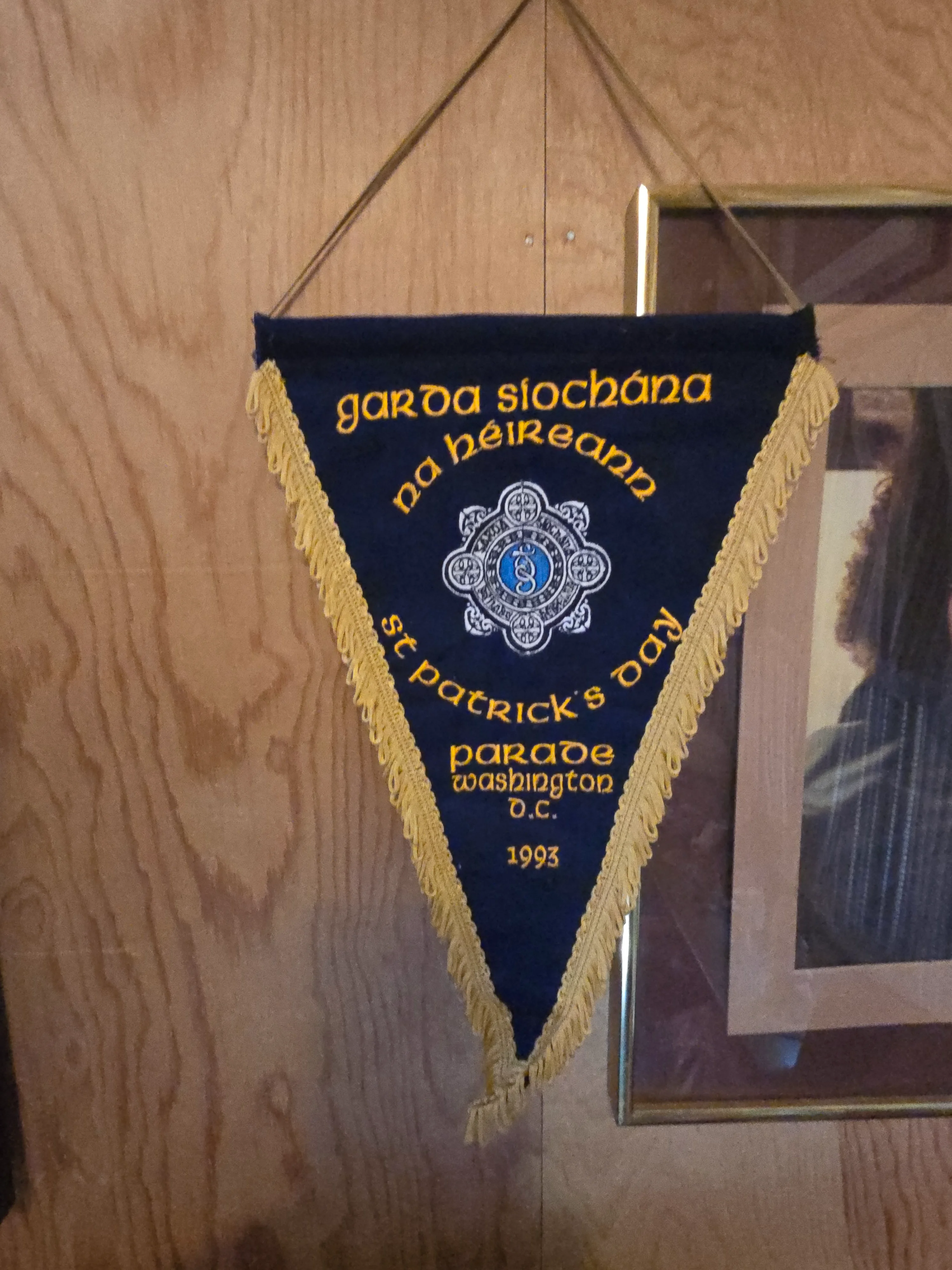 I still have a little pennant from the St Paddy's day parade. The police officers came to march in a parade in DC but the parade got snowed out. They had brought a bunch of gear to trade with the local cops. So when the parade got canceled, they had this extra stuff, which is how I ended up with a full Dublin police officers uniform and my girlfriend, now wife, dancing with the Dublin police commissioner. I wasn't a cop, but my wife wanted to go to the local church where all the police officers were attending mass. Afterwards there was a big party in the basement and we ended up hanging out with a couple guys for the weekend.