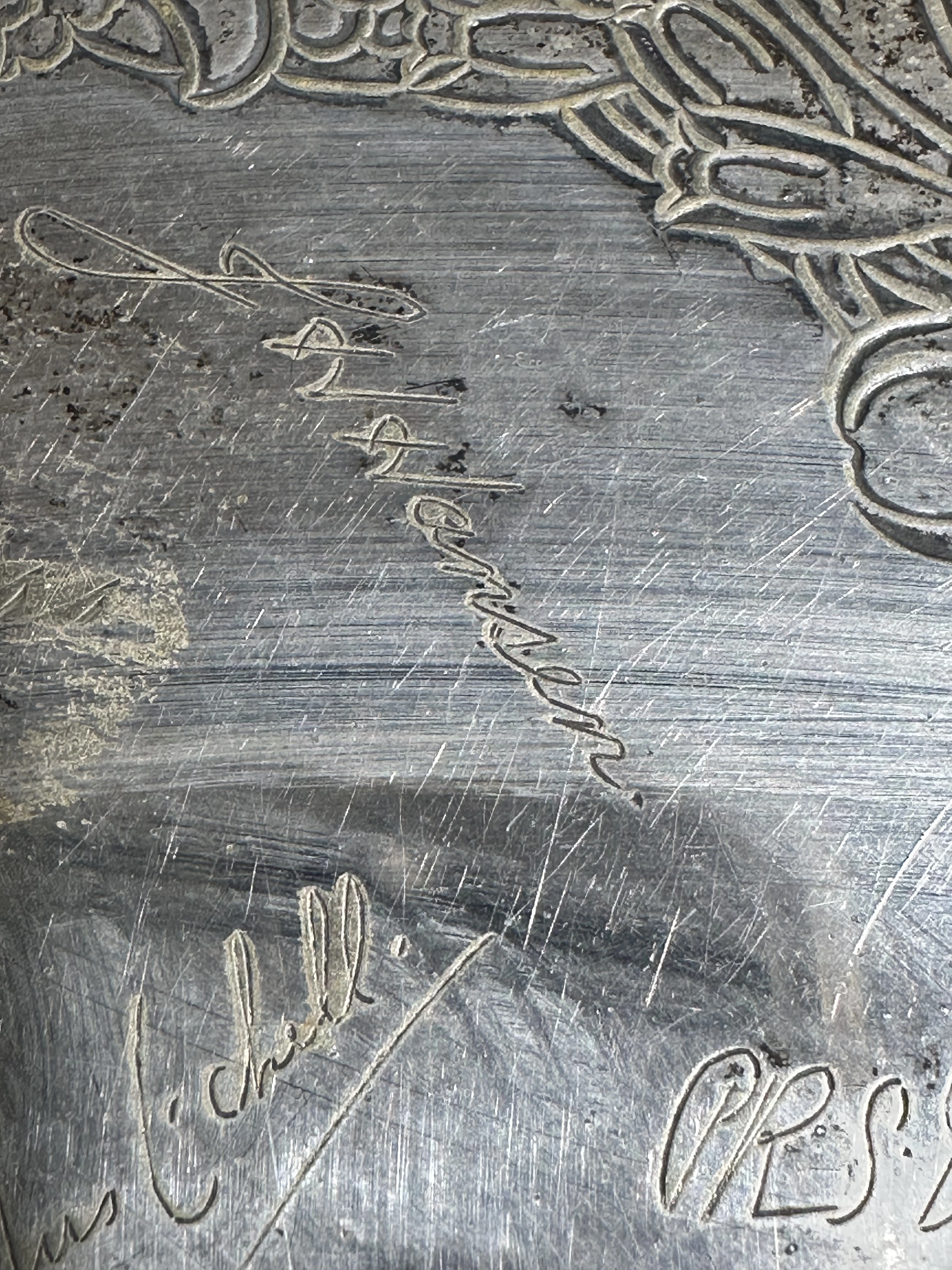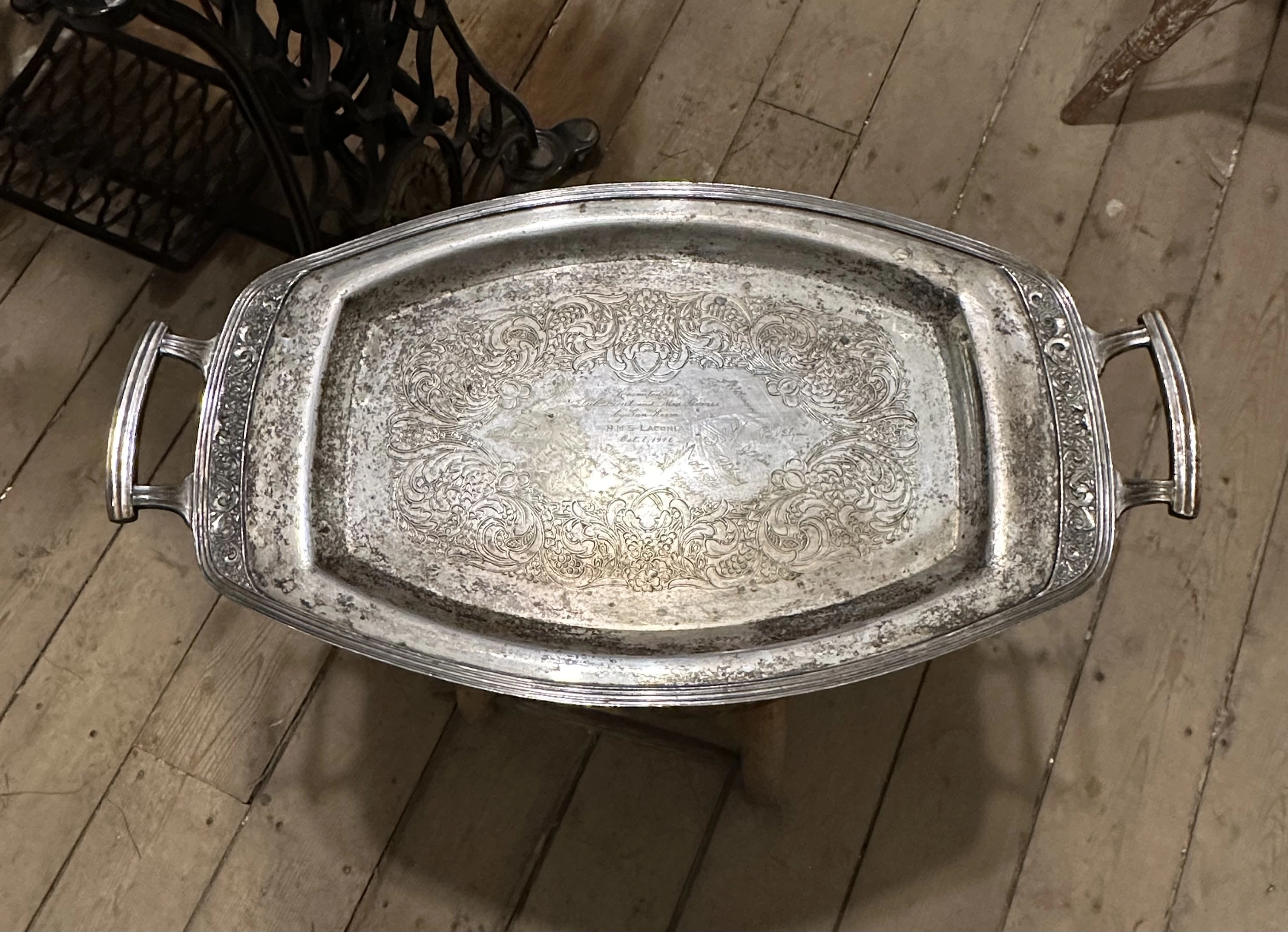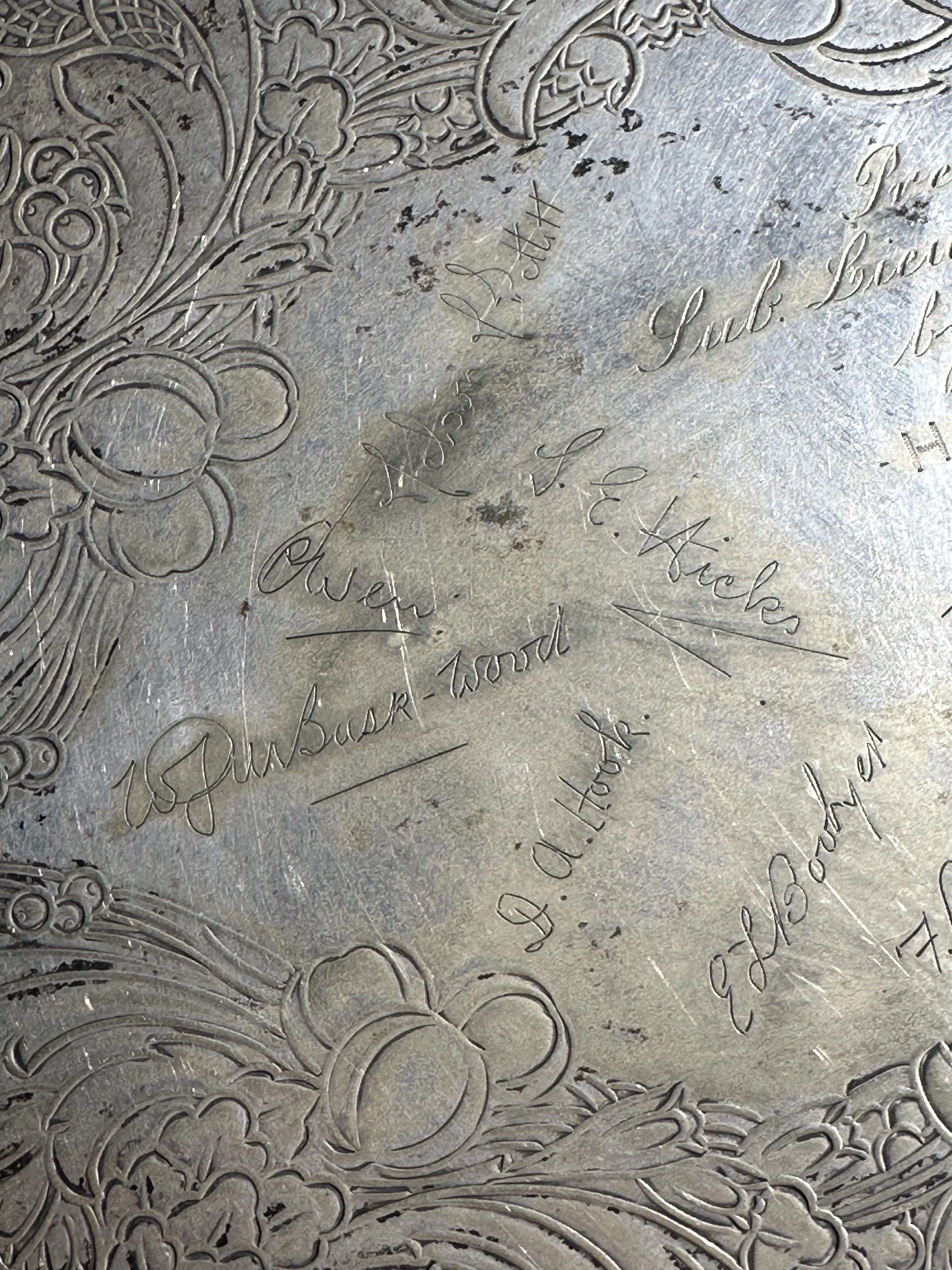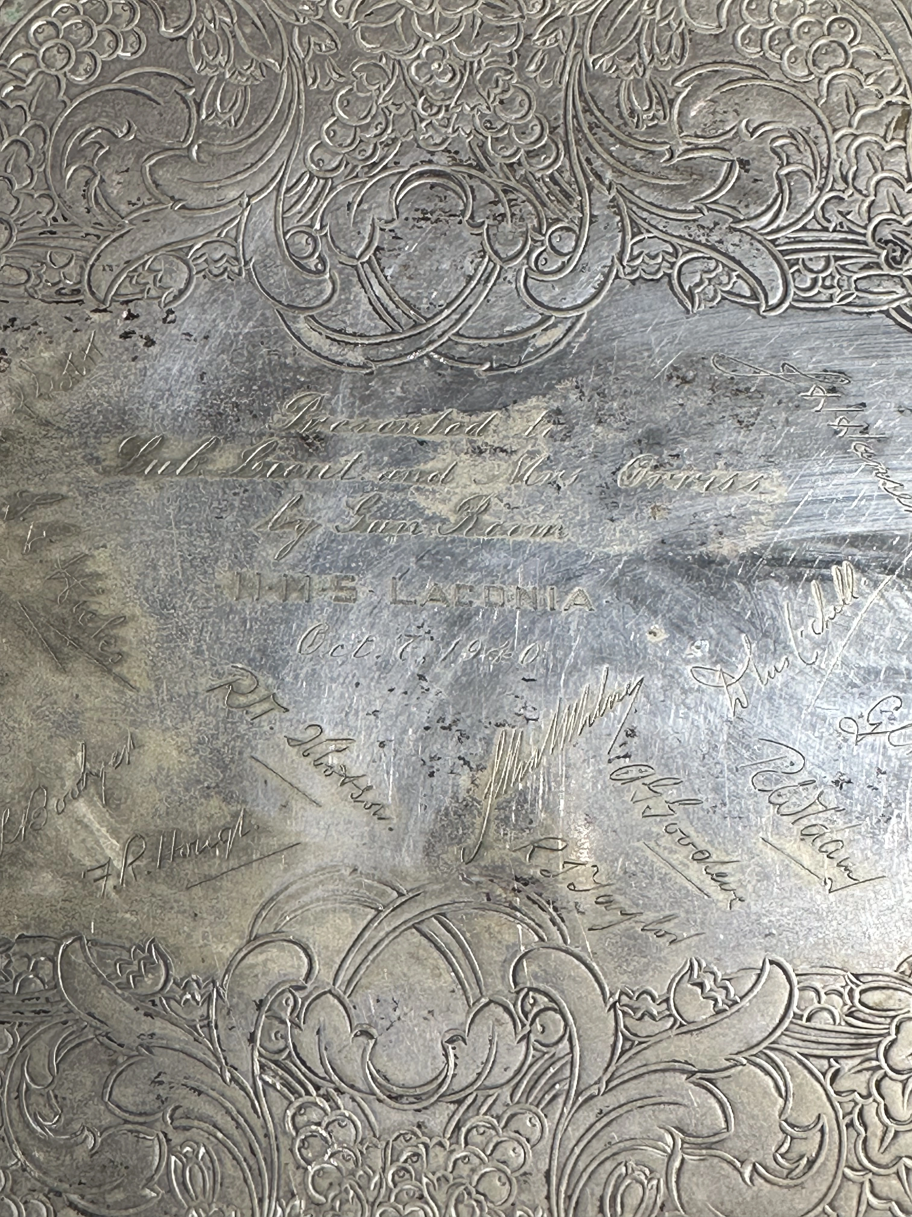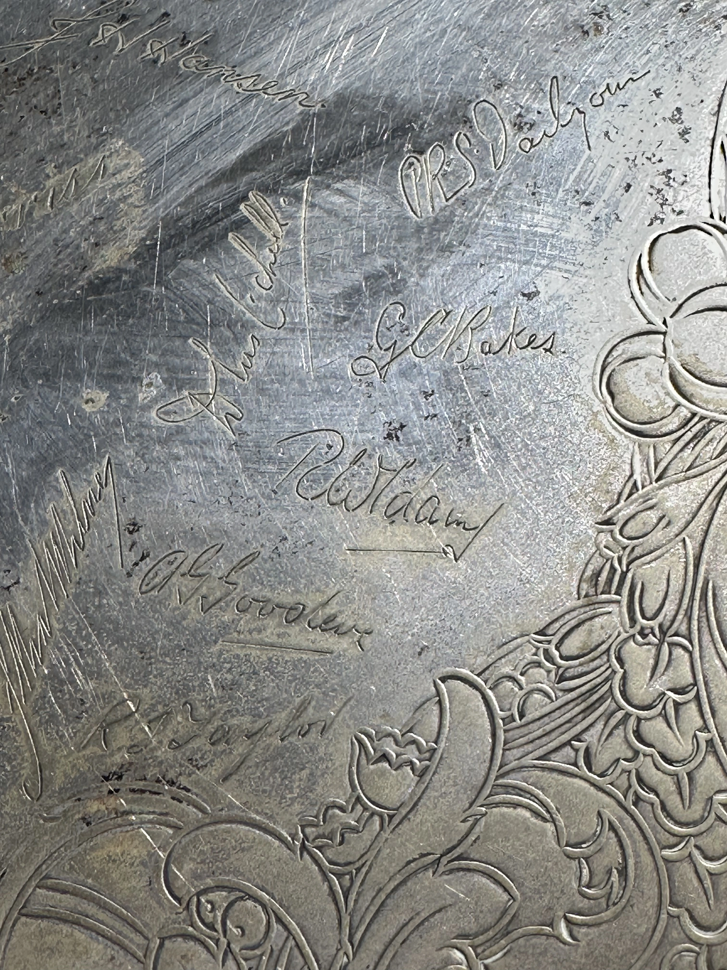 Have a look at the photos. The tray was presented to a Sub Lieutenant Orris and signed by members of the gun room.