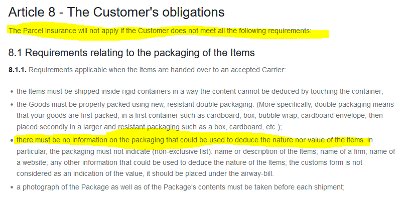 Then common practice -> International parcels have a usual requirement : customs declaration. As far as I know, this is the only bit of 'information on the packaging' (at least to my experience) that could disclose the nature and value of the items. See further description in point 3 -> The customs form is not considered as an indication of the value. Unless it is, which they clearly do not want anywhere outside the package, then you have defaulted (according to the T&C). Well, badly packed items could be 'fingered and guessed'. For that, see point 1 under 8.1.1.