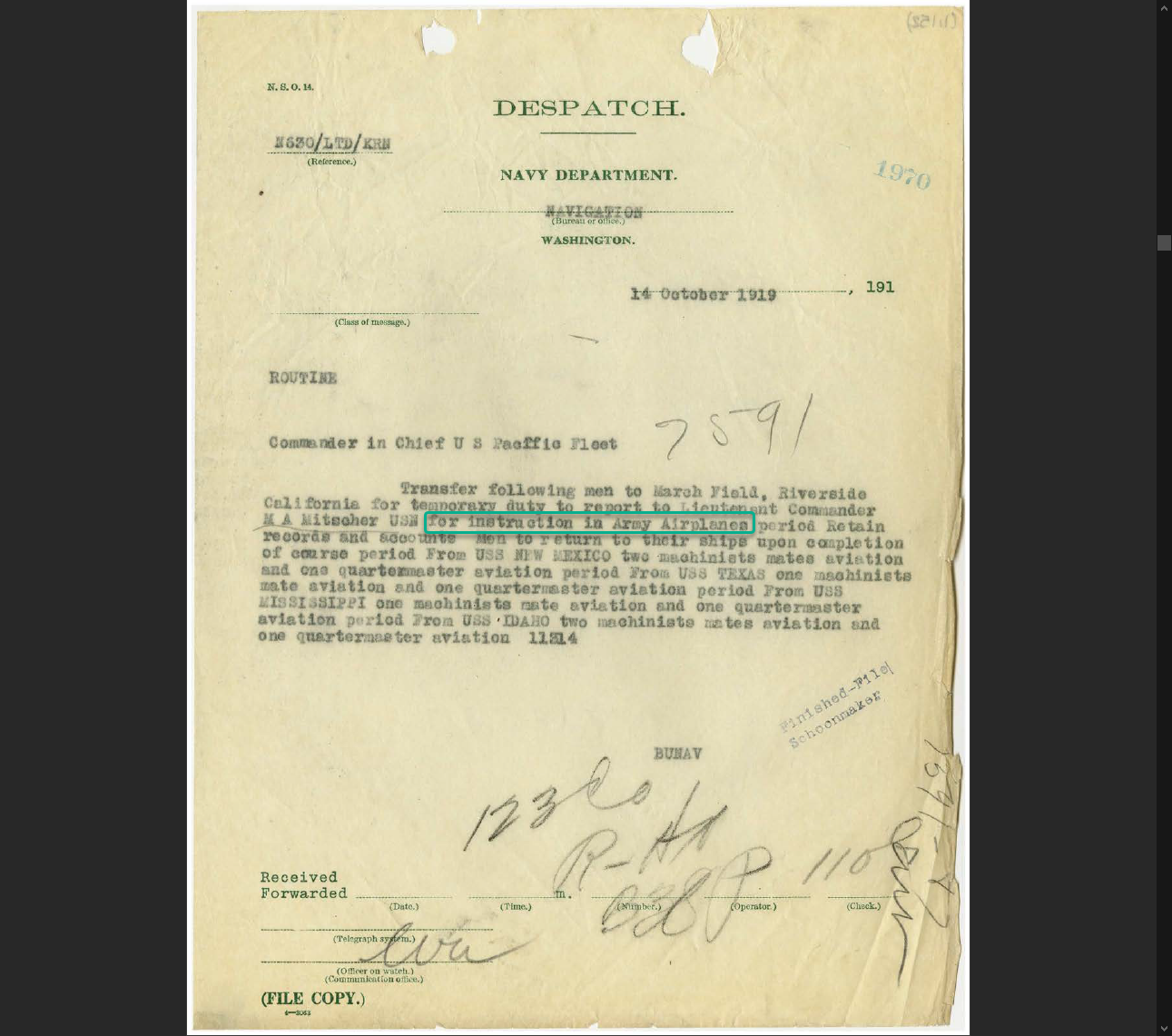 Marc Mitscher is doing a lot of things is San Diego right around the time of Moffett getting Weems Celestial Navigation books and watches. So it could have happened either way.