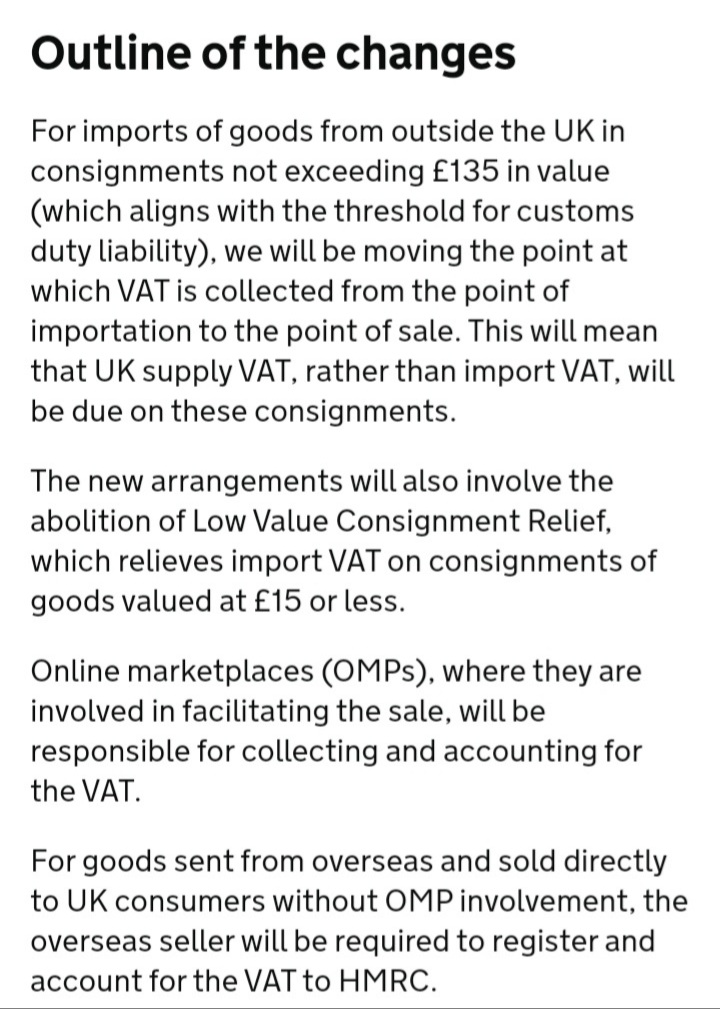 So what (and how) gets applied depends on a range of factors - is it a private or commercial seller, whether the goods are physically inside or outside the UK at time of supply, whether the value is more than £135, customs code that applies, whether the sale is to a business or to an end-consumer, and whether an on-line market place is being used or if it is a direct sale.