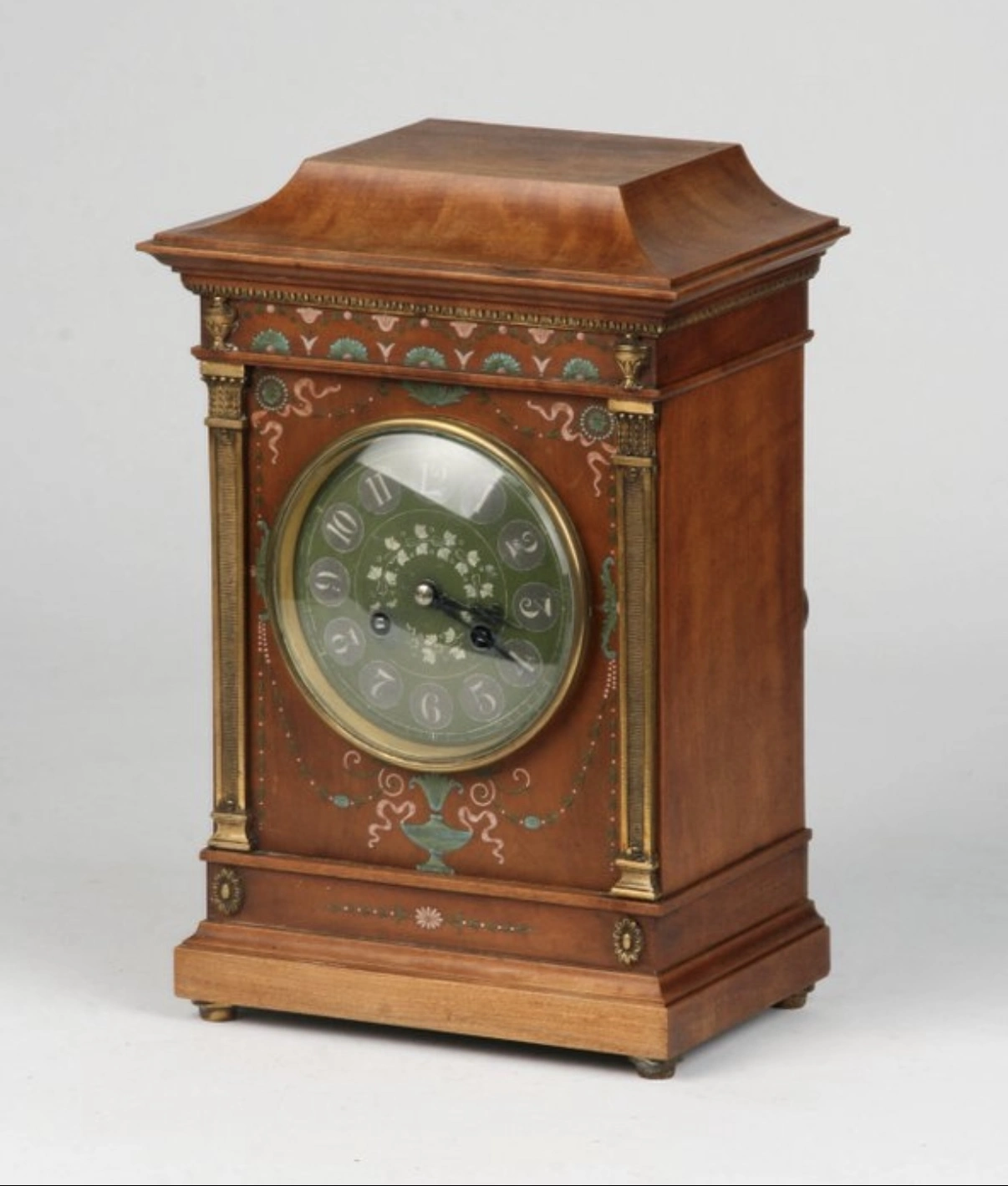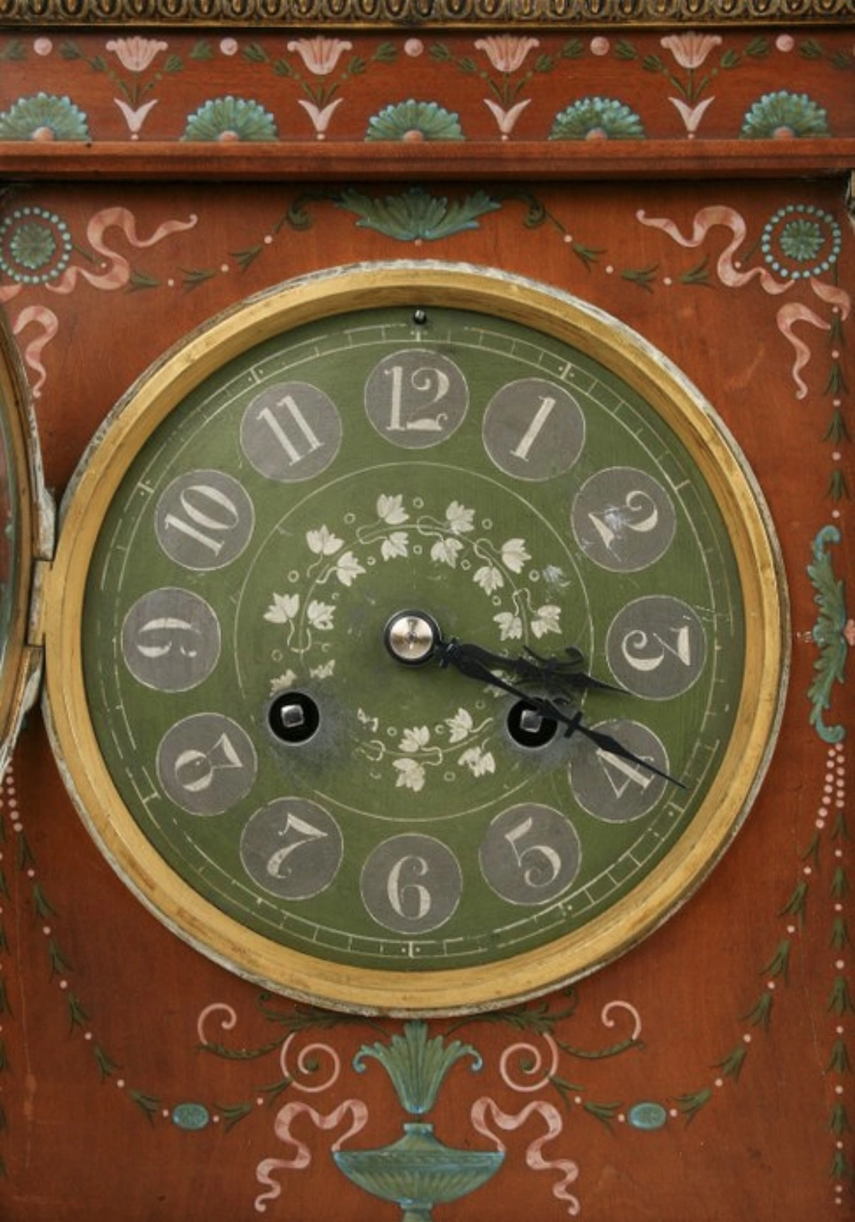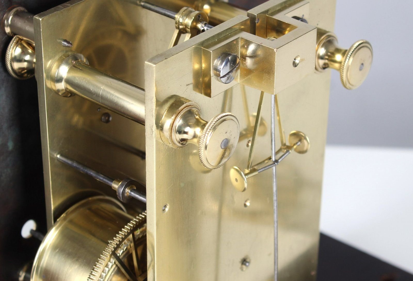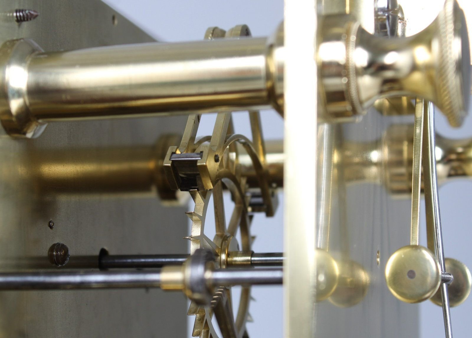 Quality features of this precision pendulum clock are: 6-spoke wheels, maintaning power (continues to run during winding), delicate escapement, elaborated wood pendulum (appropriate wood has a temperature coefficient of about 1/10 of that of steel, invar had not been invented yet), regulator dial, delicate design of the beat adjustment, generally high end workmanship.