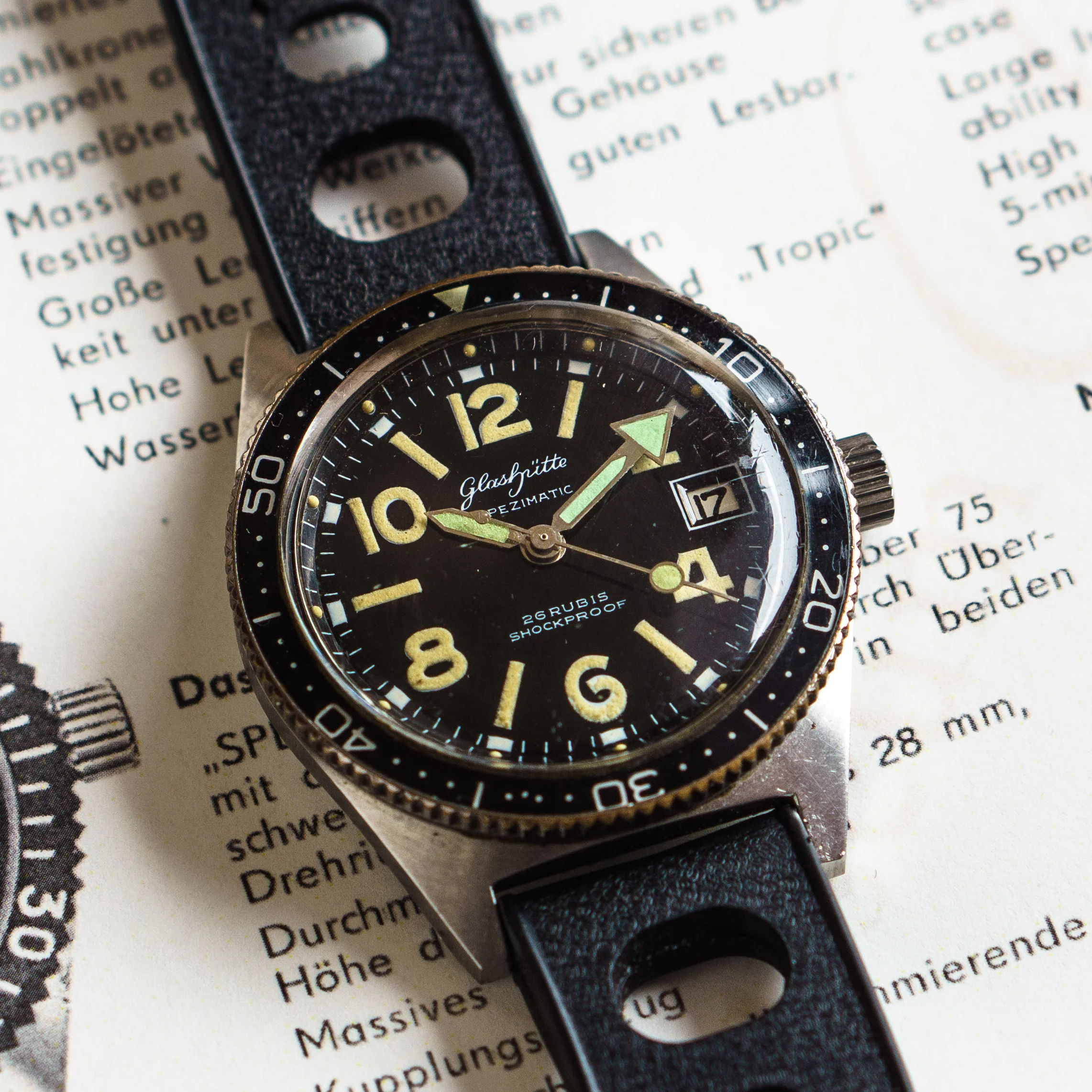 In 1967 (VEB - people owned factory) Glashuette started a test run of some own dive watches, when a group of scientist were ordered to salvage a coral reef in Cuba. Among a few other Western watches (Submariner, Squale, Enicar Ultradive) they also had a prototype of the Glashütte Dive watches in their luggage. The diving magazine "Poseidon" stated, that the watch was ok with some room for improvements especially at the bezel and crown.
